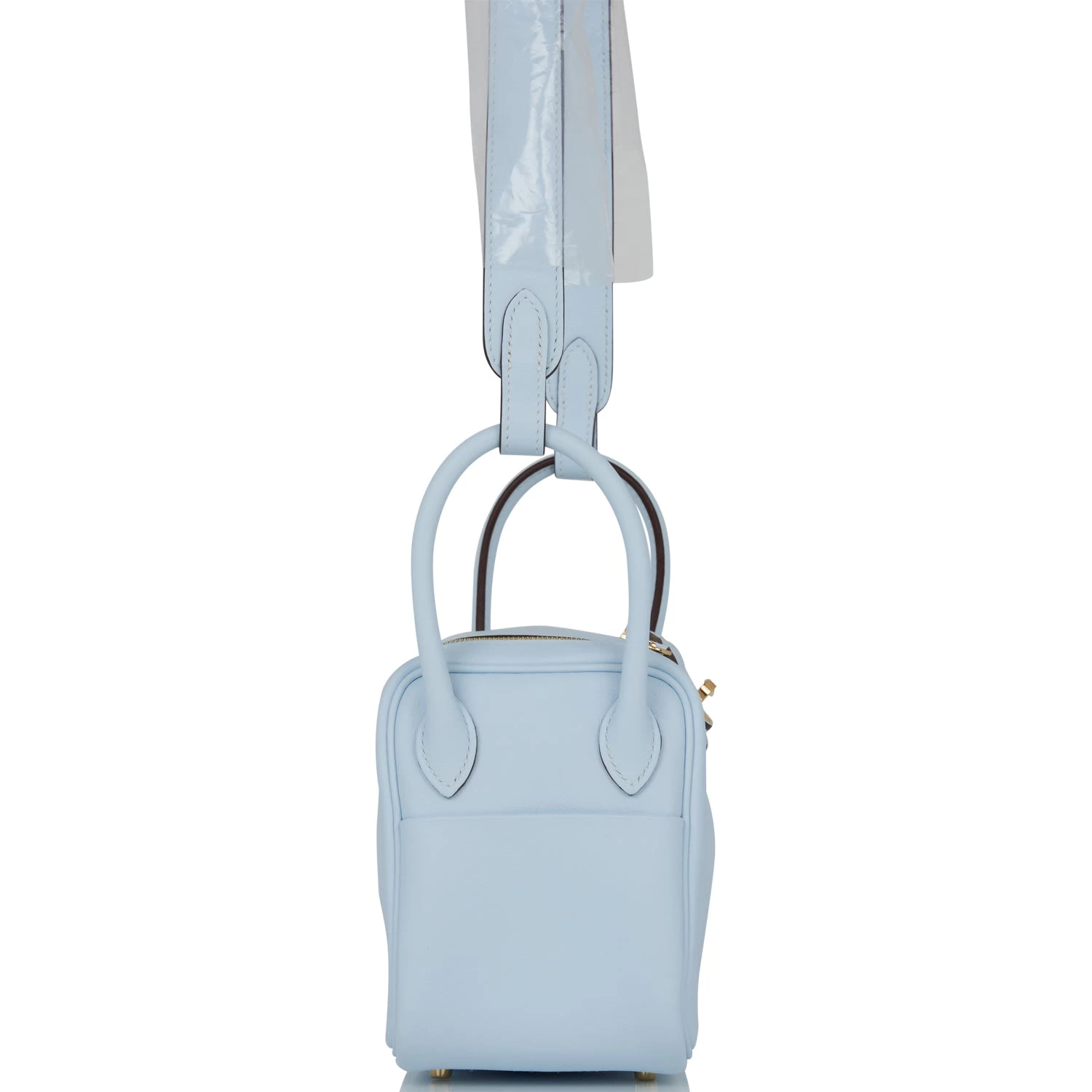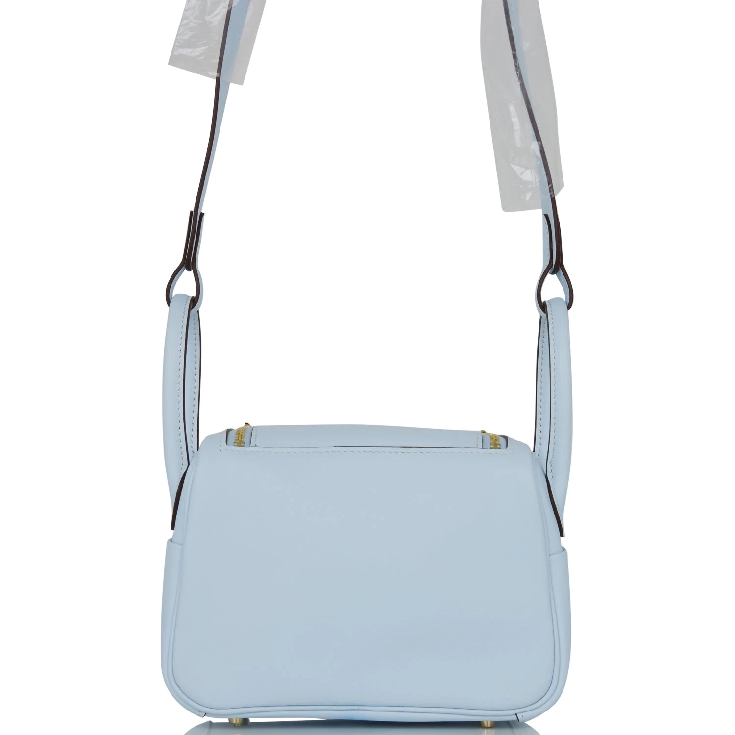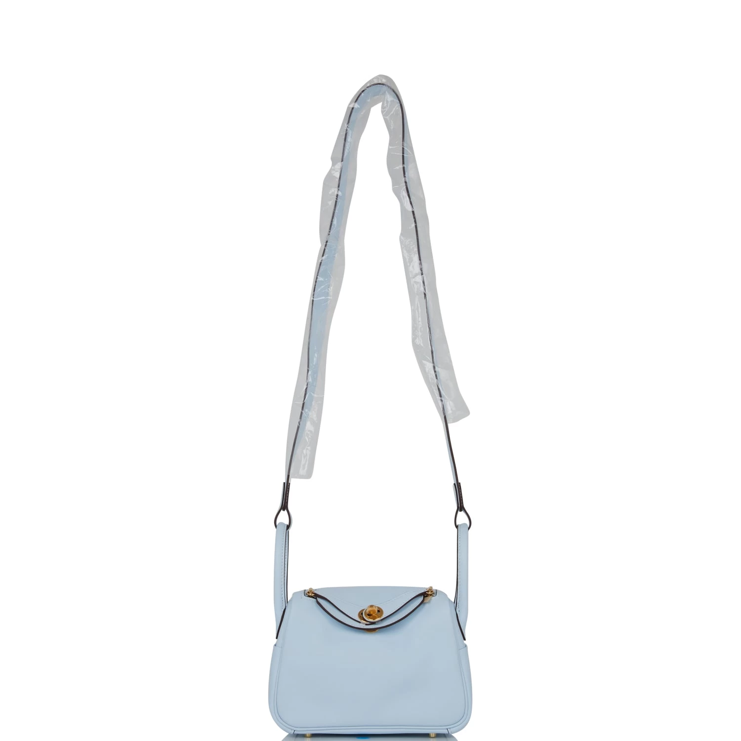 This Mini Lindy is in Bleu Brume swift leather with gold hardware and has tonal stitching, double zipper pulls, front Hermès twist lock, single pocket on each side, two rolled top handles linked by a flat shoulder strap.
