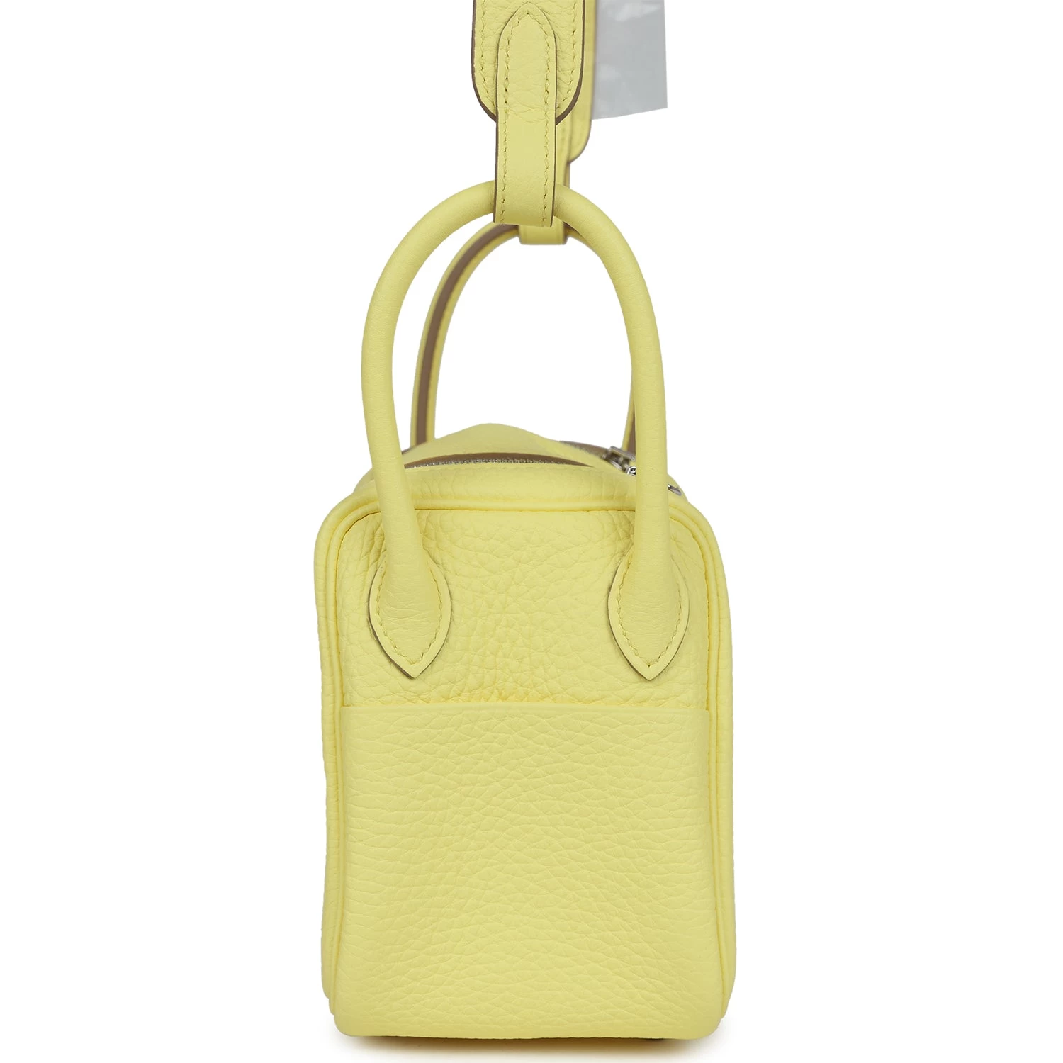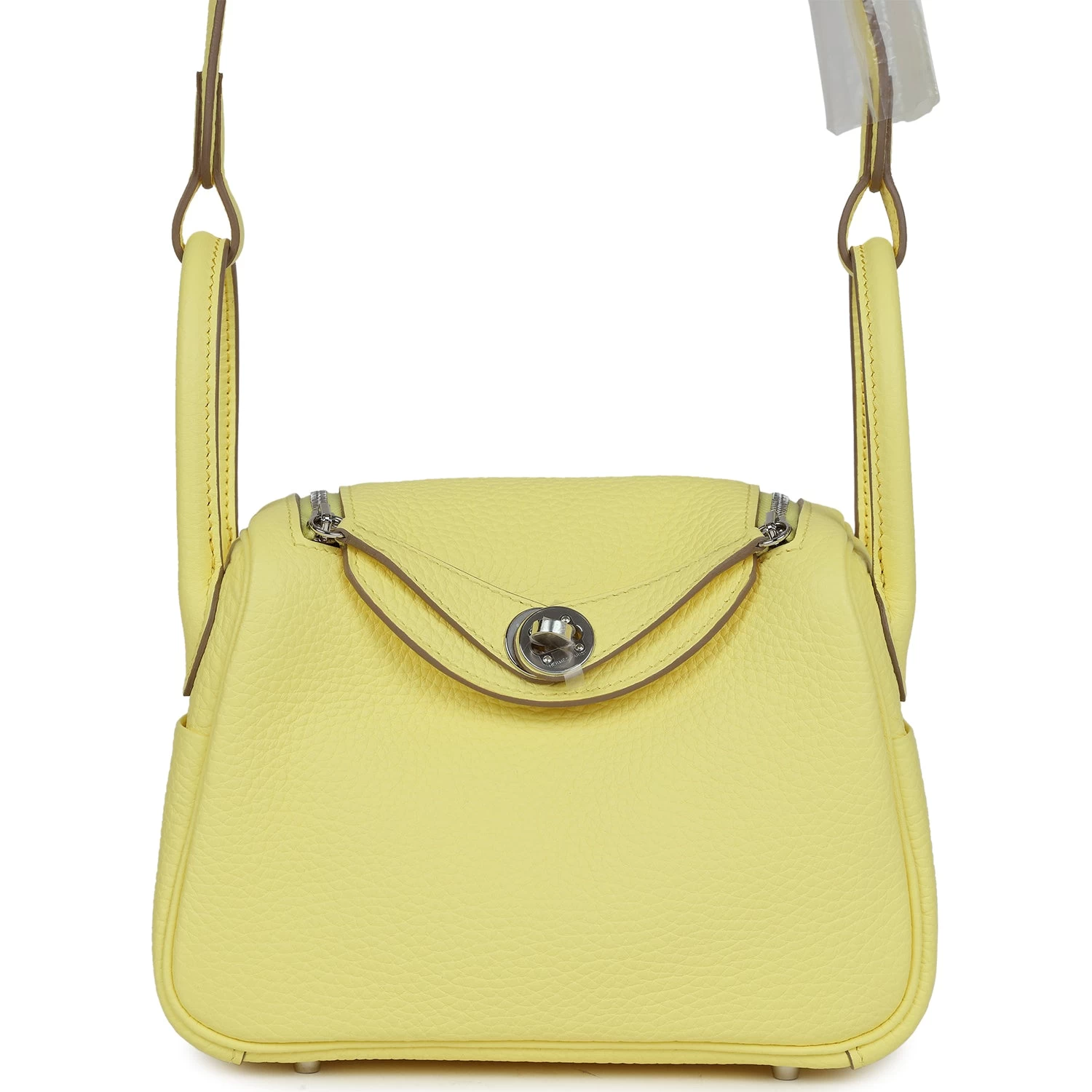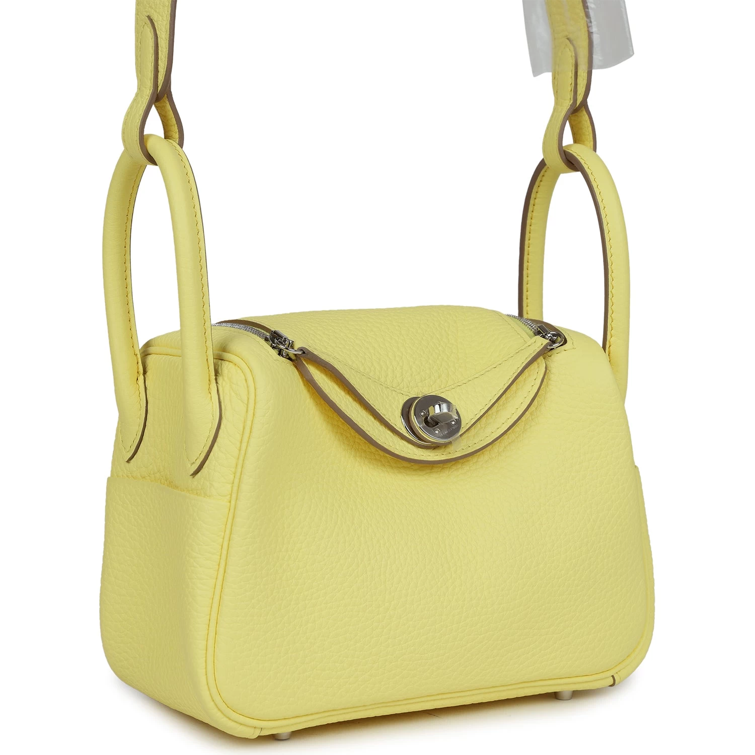 This Mini Lindy is in Limoncello clemence leather with palladium hardware, has tonal stitching, double zipper pulls, front Hermès twist lock, single pocket on each side, two rolled top handles linked by a flat shoulder strap.