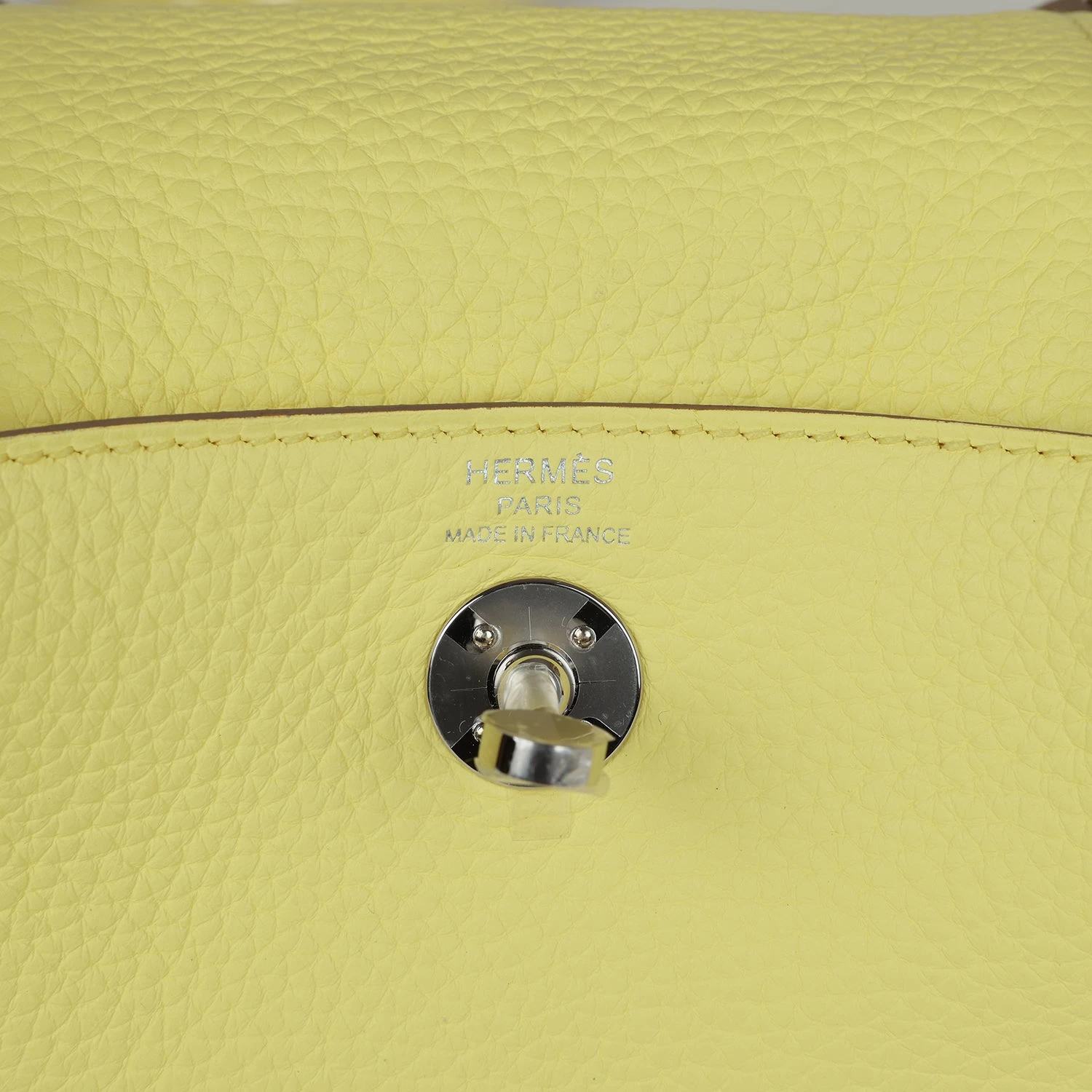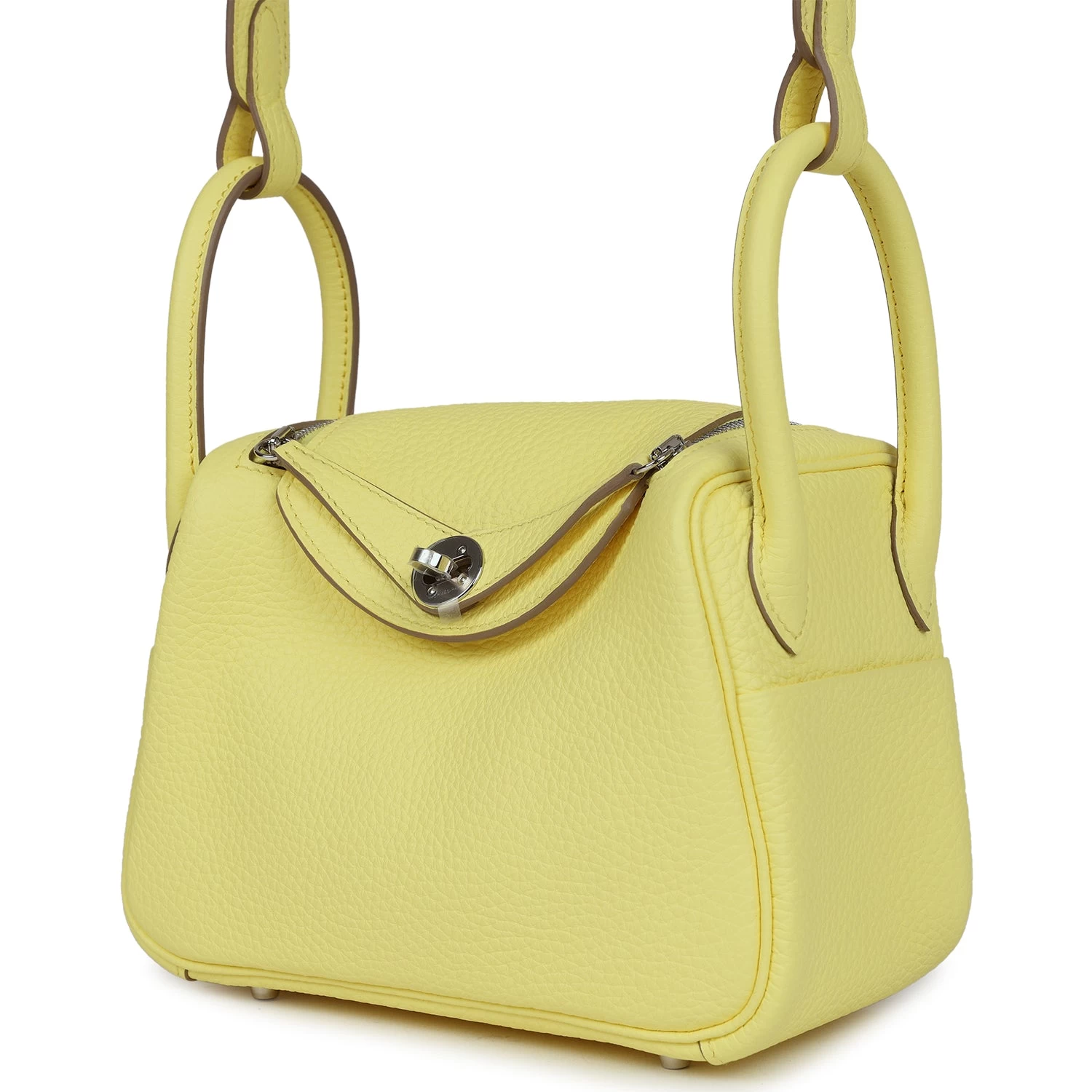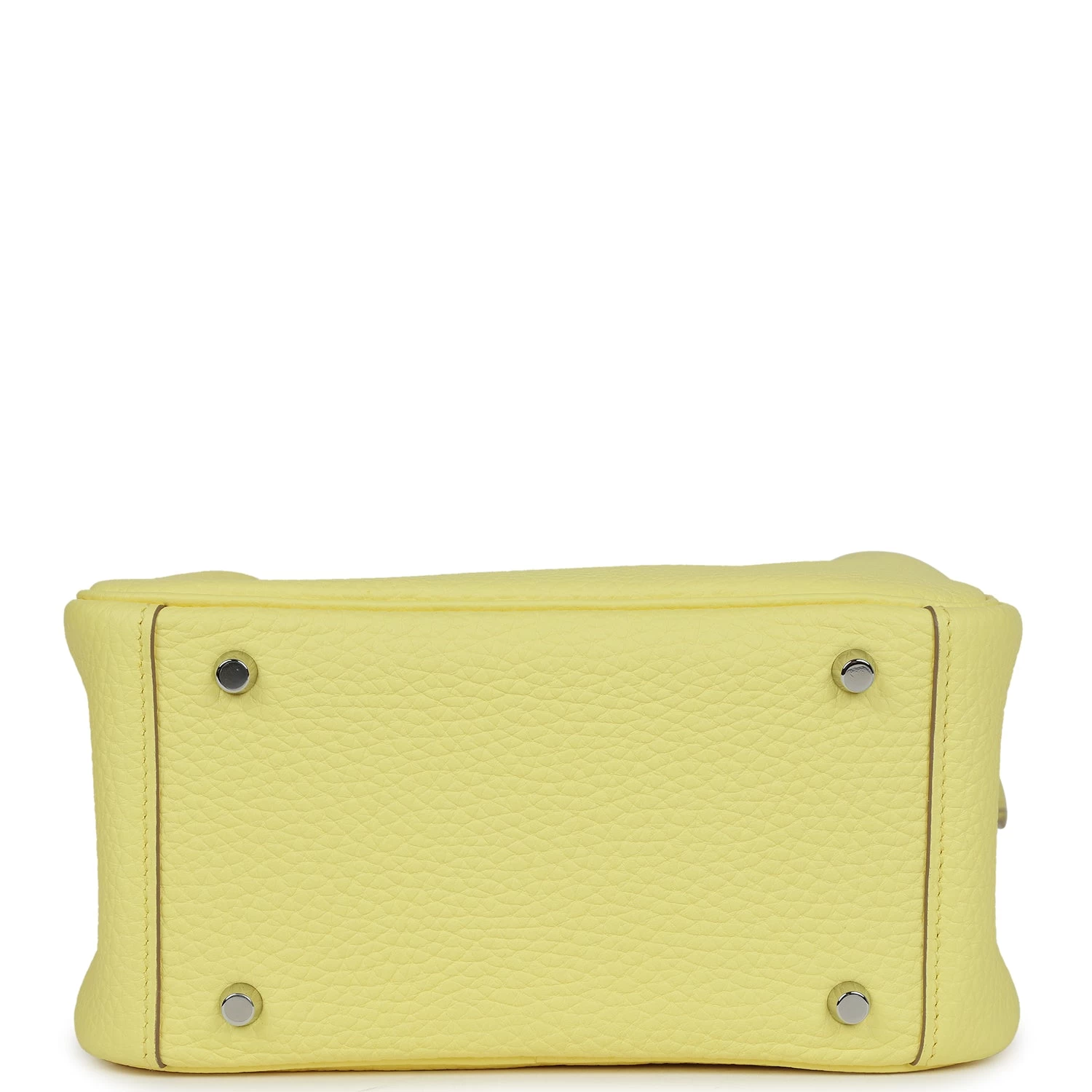 This Mini Lindy is in Limoncello clemence leather with palladium hardware, has tonal stitching, double zipper pulls, front Hermès twist lock, single pocket on each side, two rolled top handles linked by a flat shoulder strap.