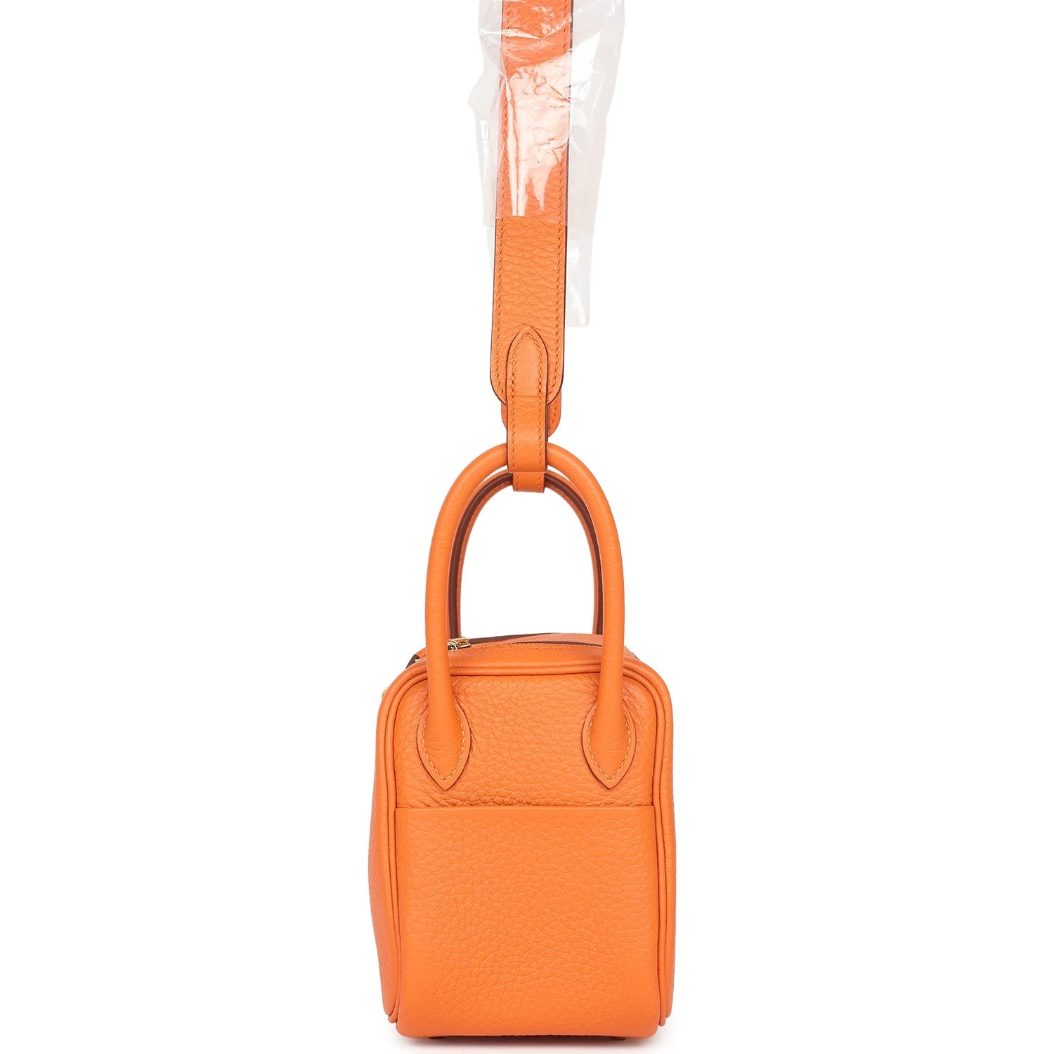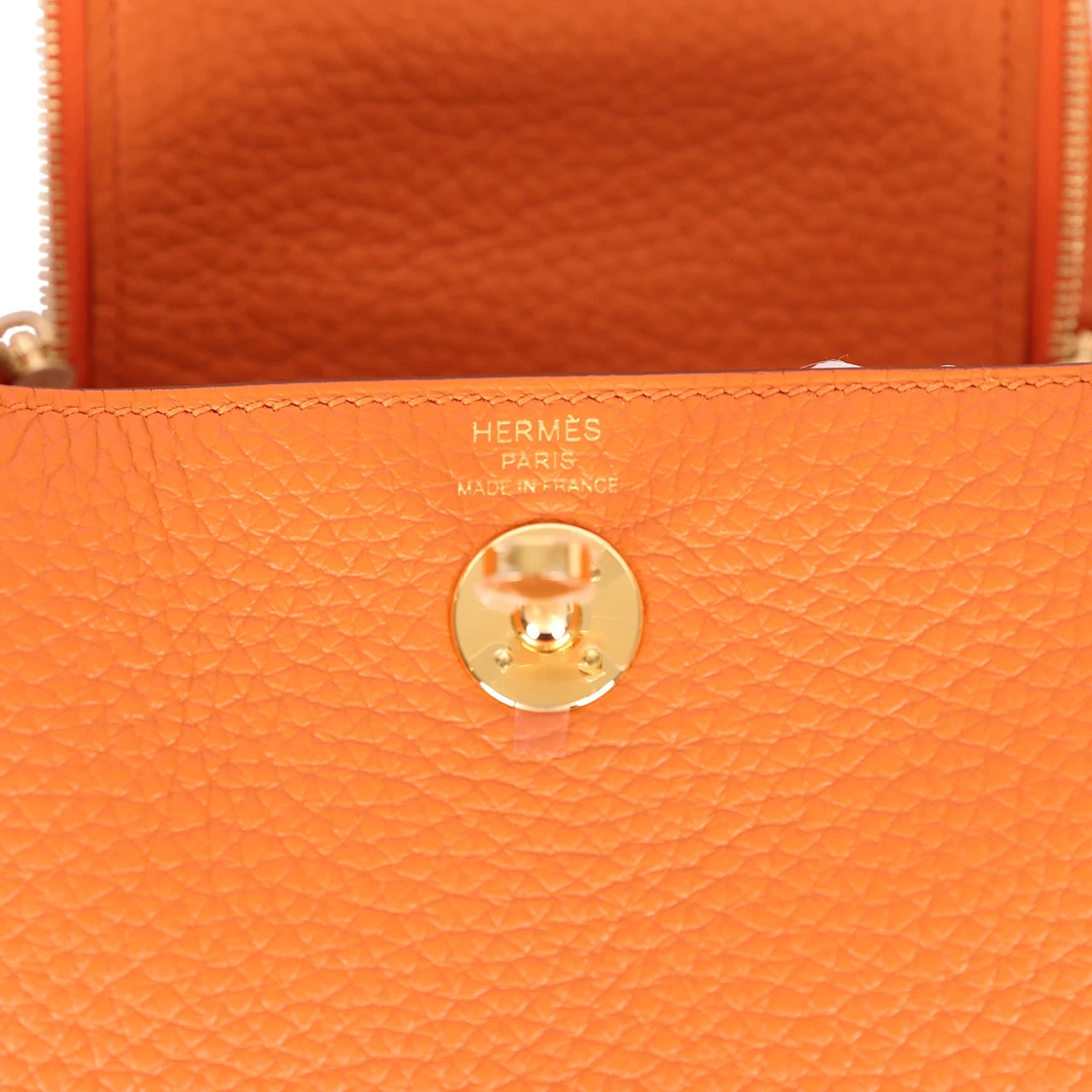 This Mini Lindy is in Orange clemence leather with gold hardware, has tonal stitching, double zipper pulls, front Hermès twist lock, single pocket on each side, two rolled top handles linked by a flat shoulder strap.
