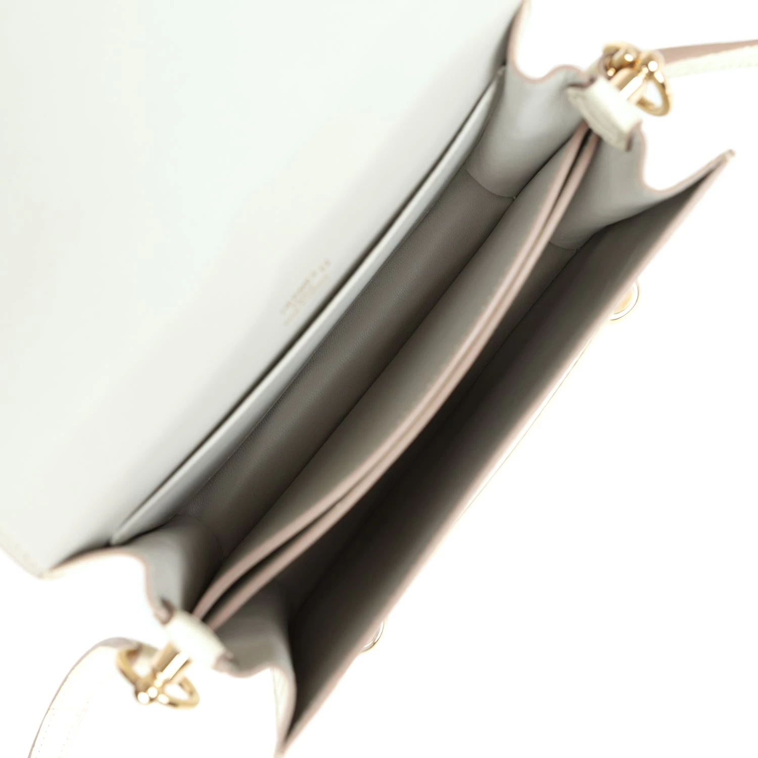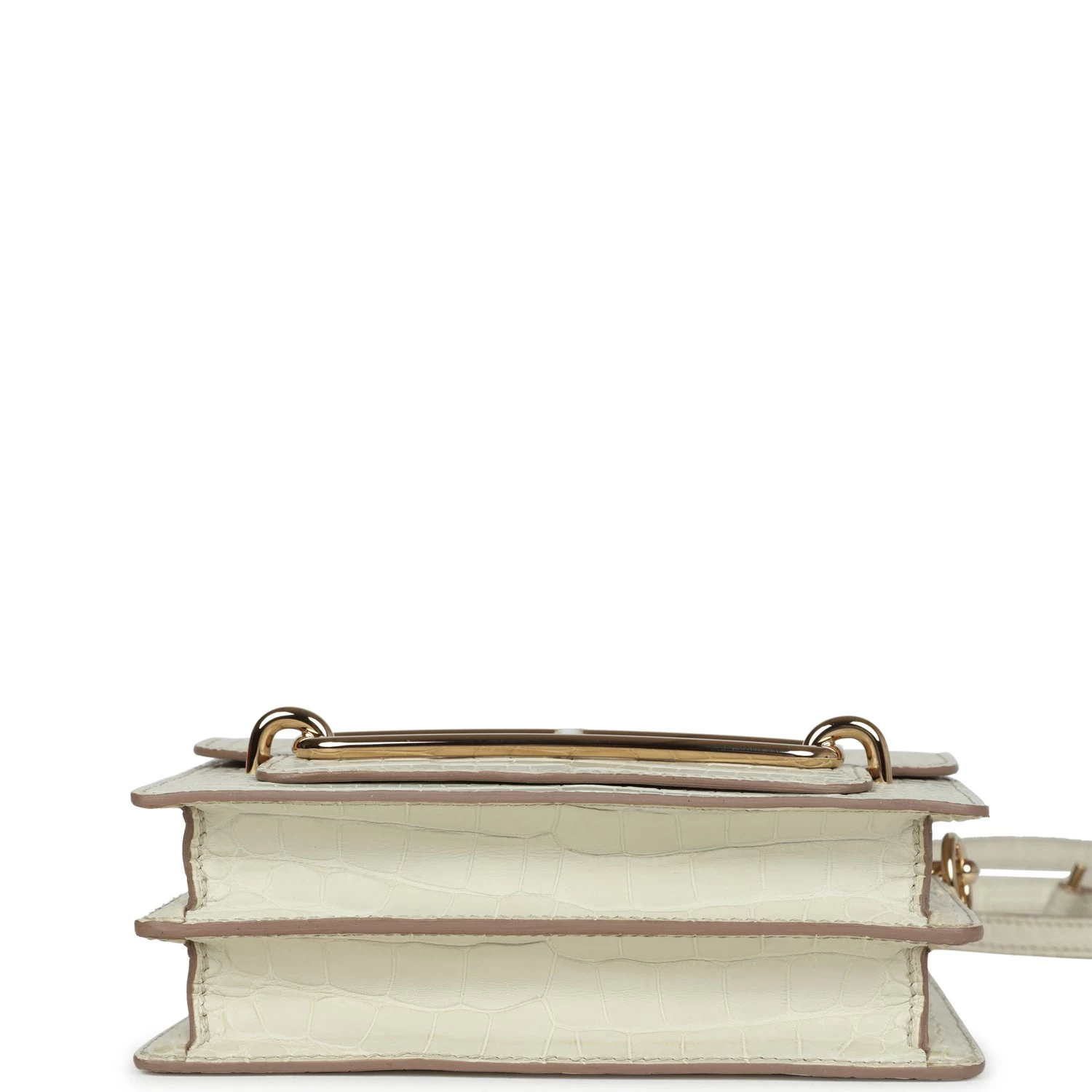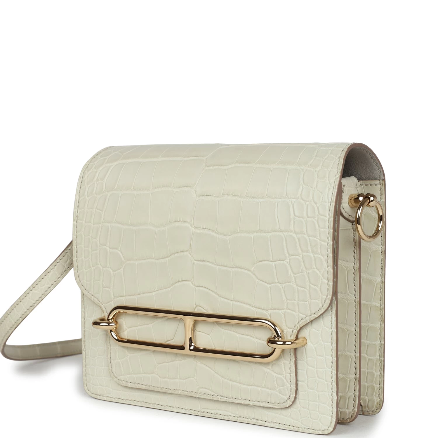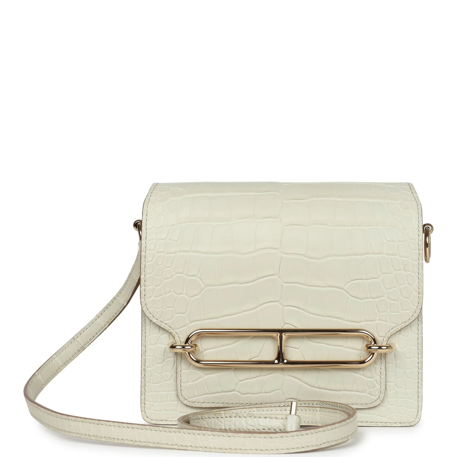 This mini Sac Roulis is of Beton matte alligator Mississippiensis with permabrass hardware and features tonal stitching, a front flap closure, and long crossbody strap.