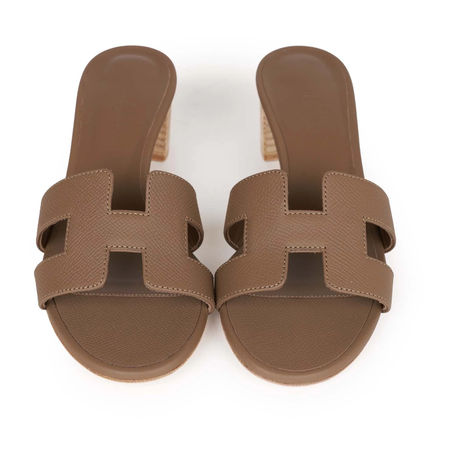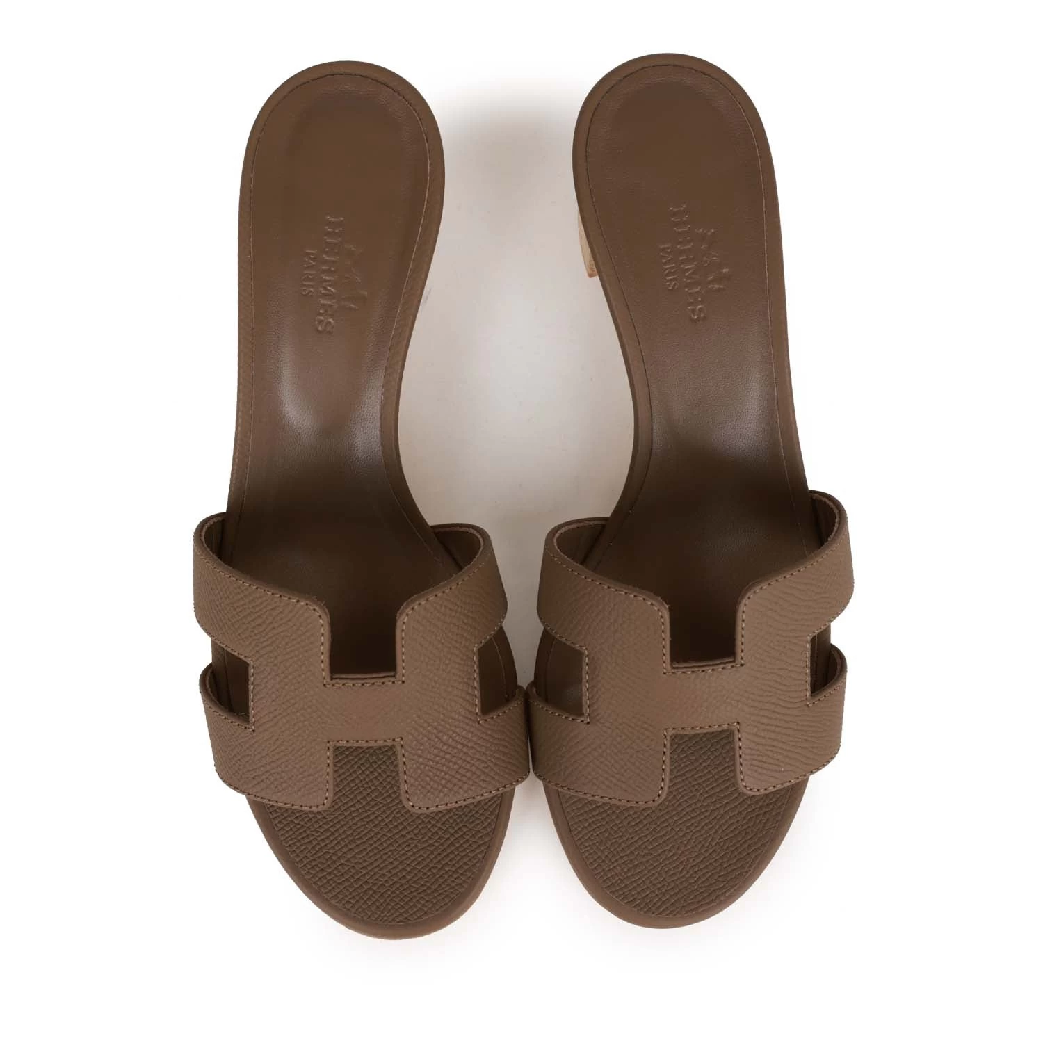 This pair of Oasis Sandals are in Etoupe epsom leather with a wood block heel and the iconic H crossover strap.