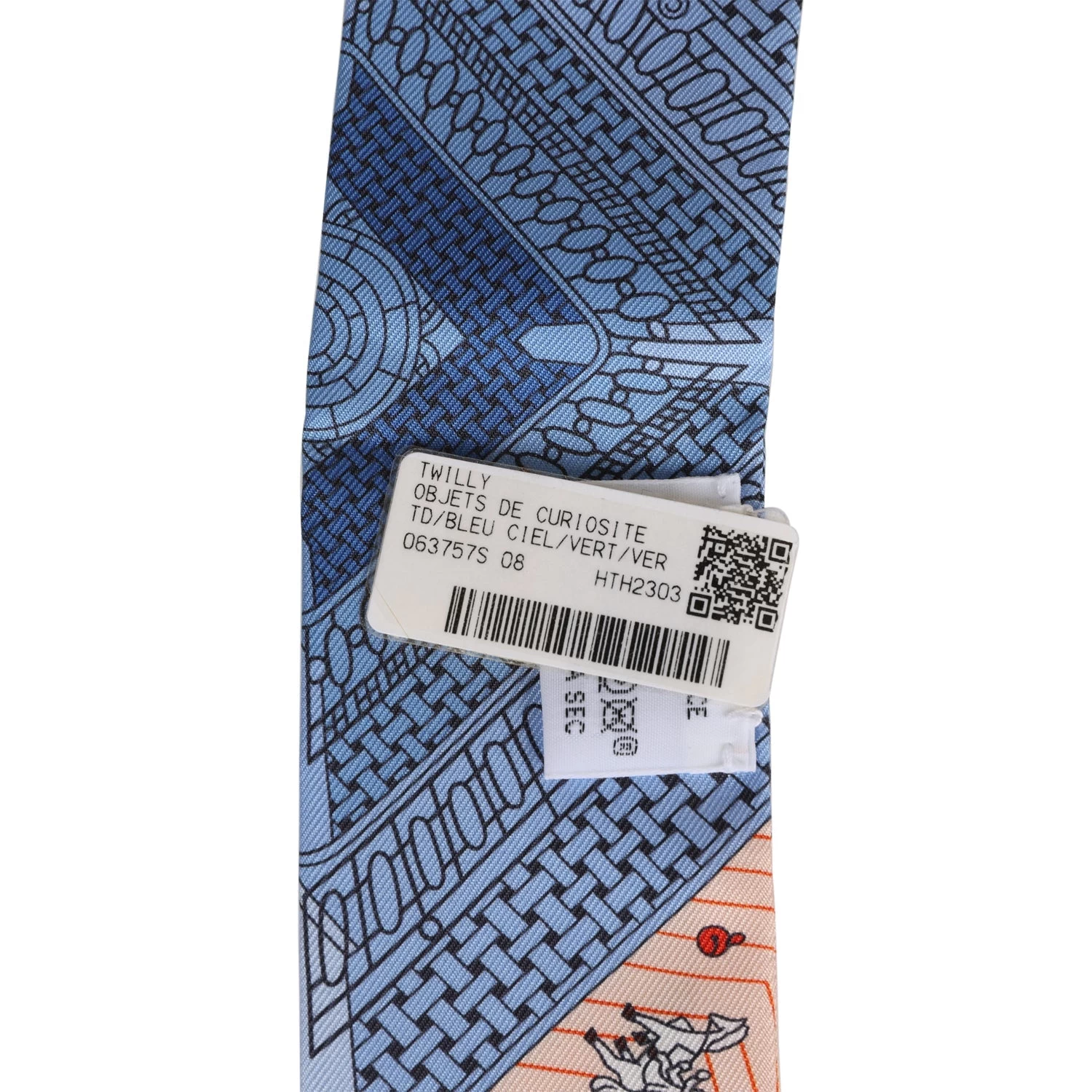 This silk twilly pair is in a Bleu, Ciel, and Vert colorway.