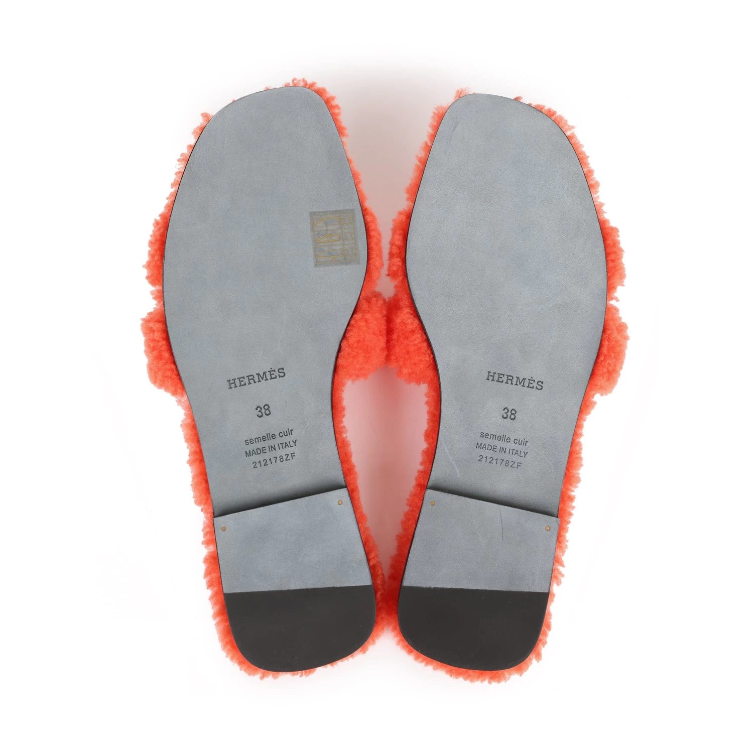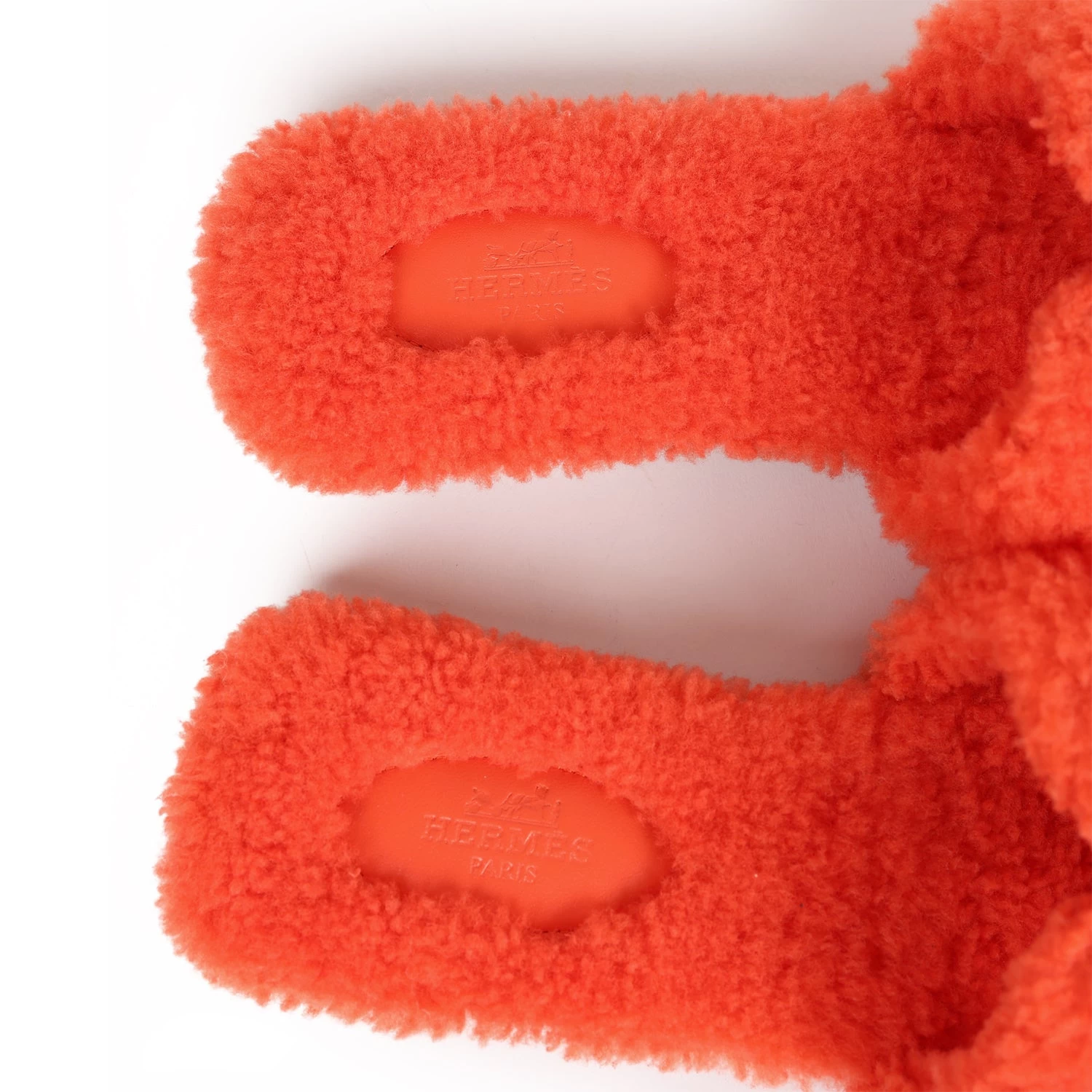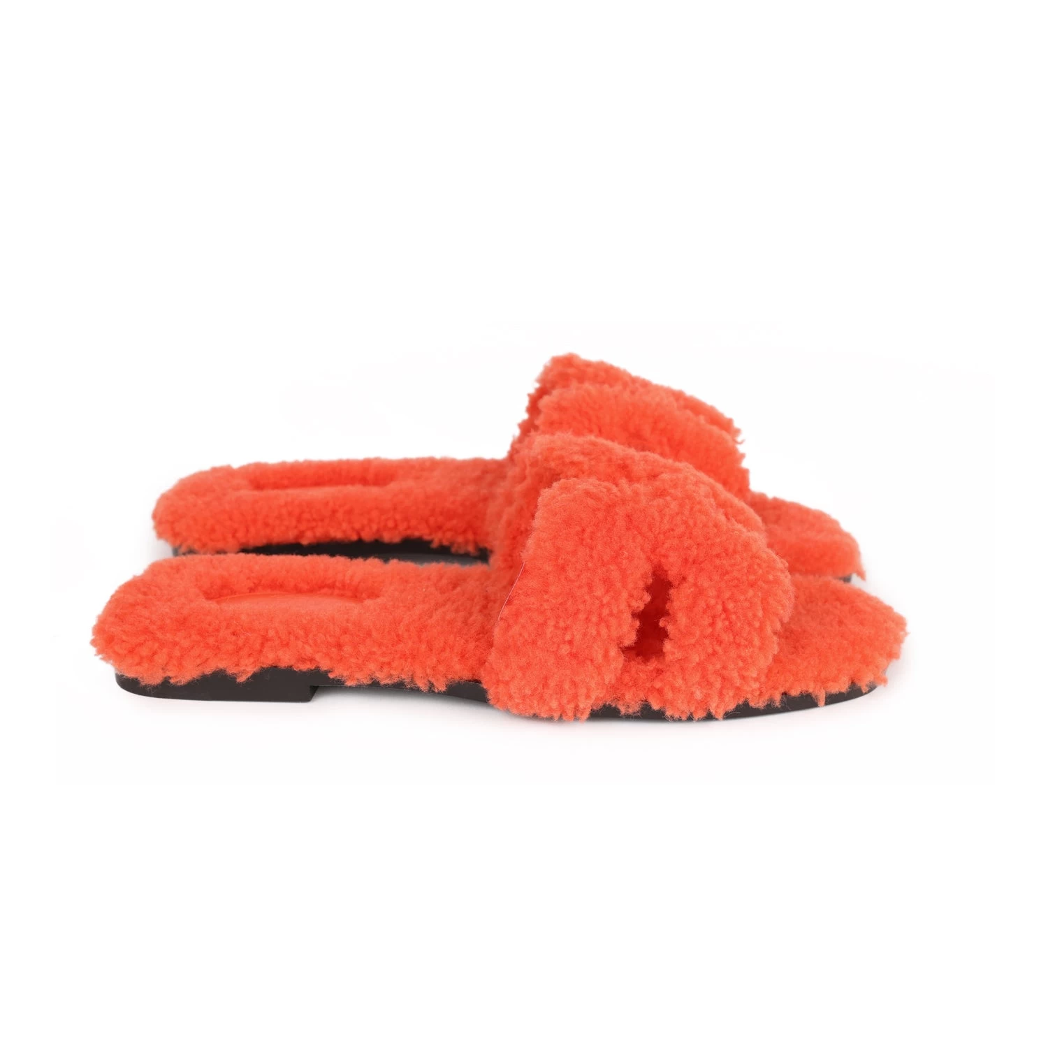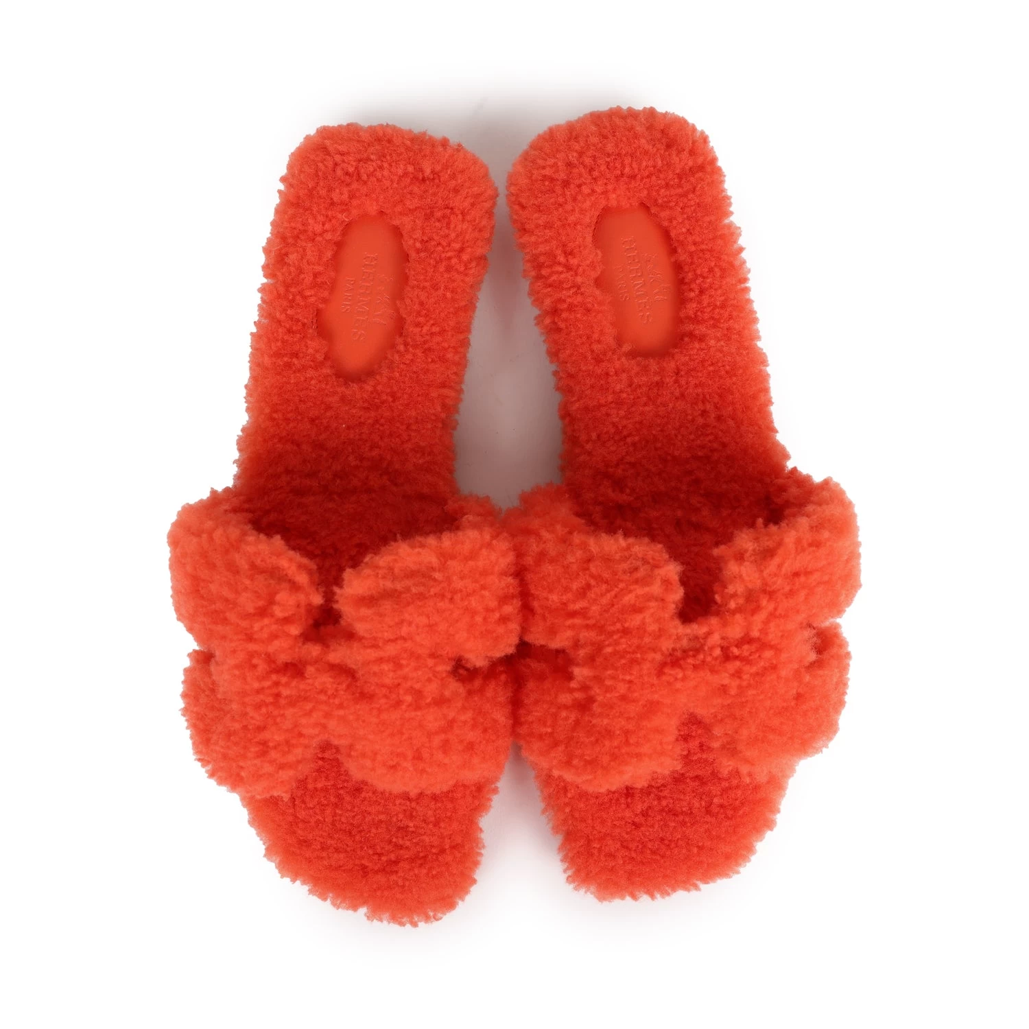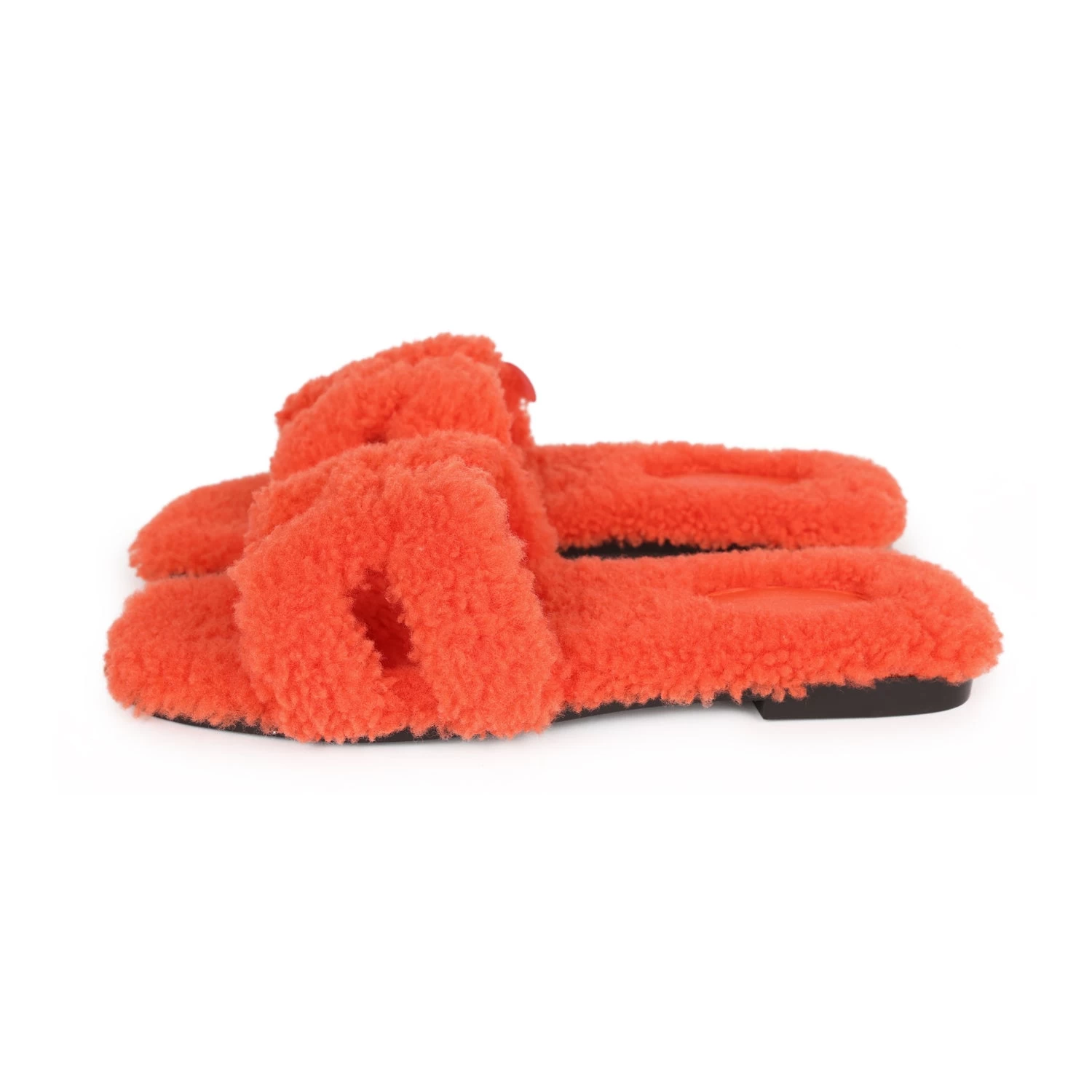 This pair of Oran Sandals are in Orange Shearling and feature the iconic H crossover strap with a black rubber sole.