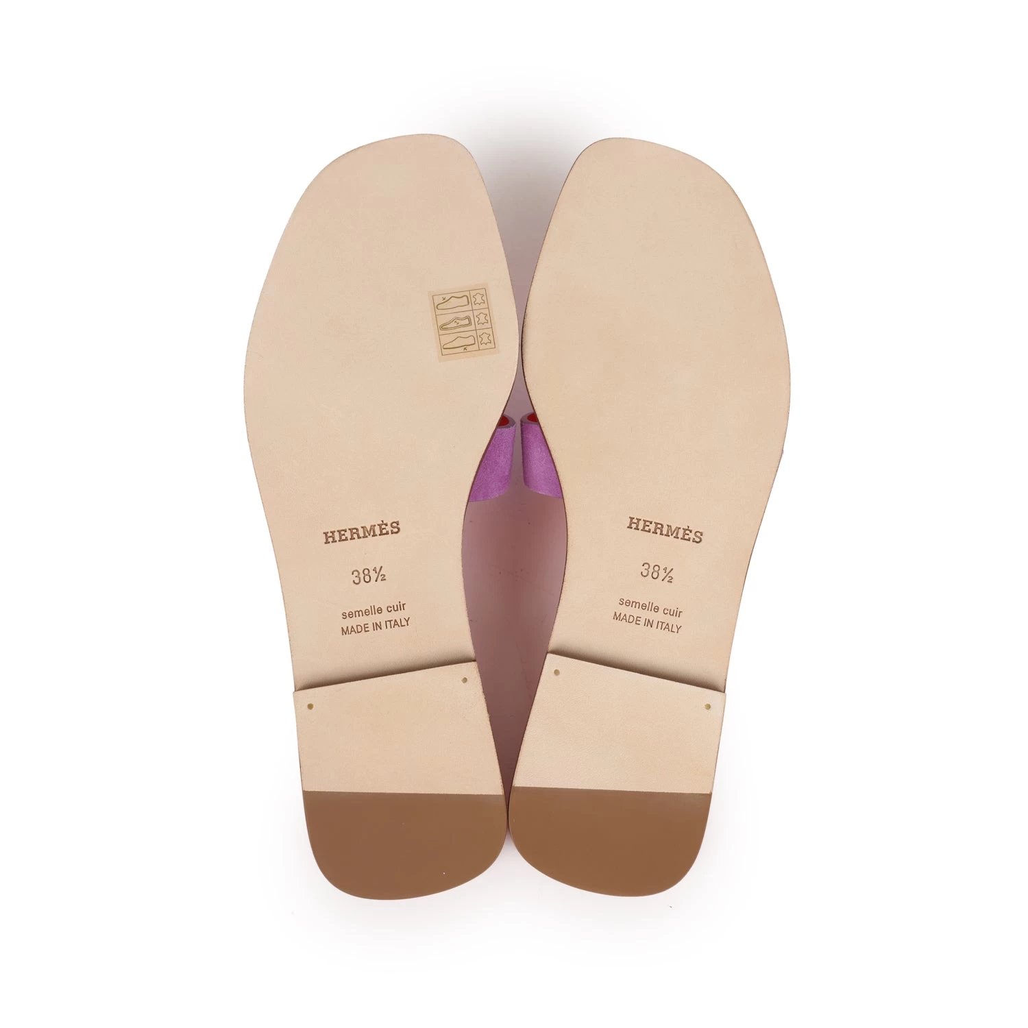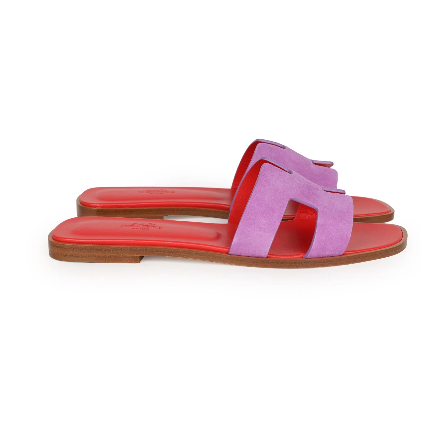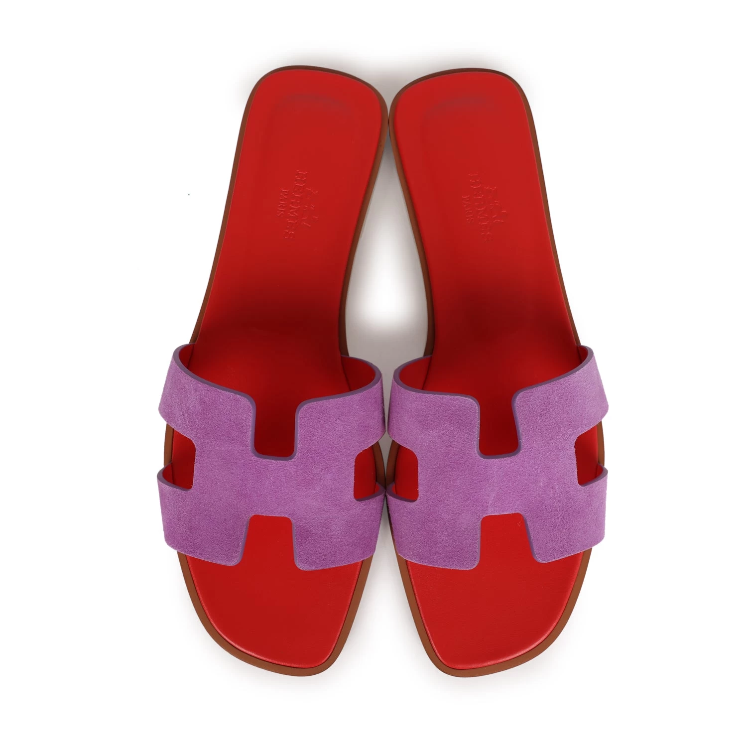 This pair of Oran Sandal in Violet Parme Suede Goatskin, H cutout detail, red leather goatskin insole, and natural leather sole