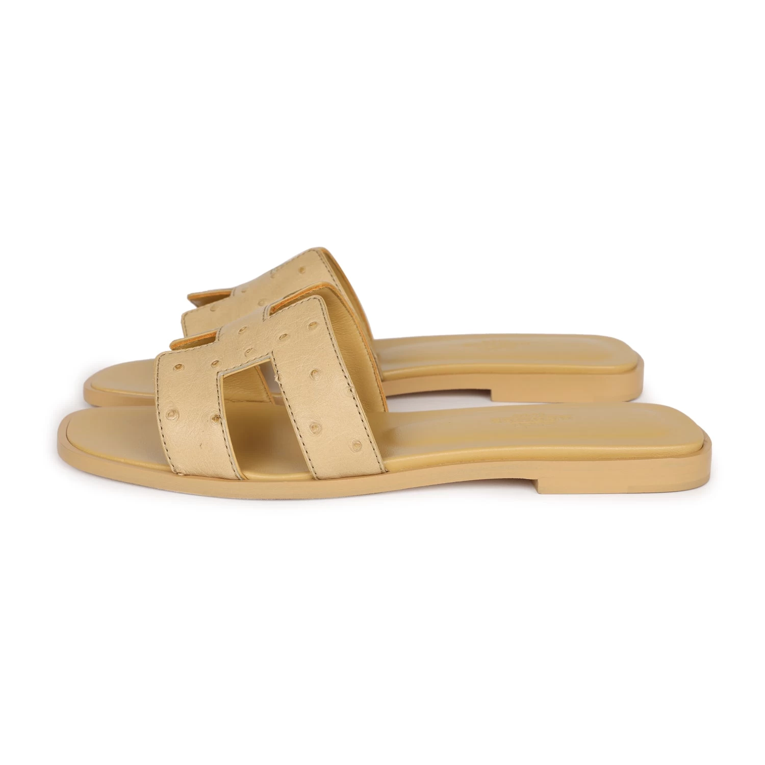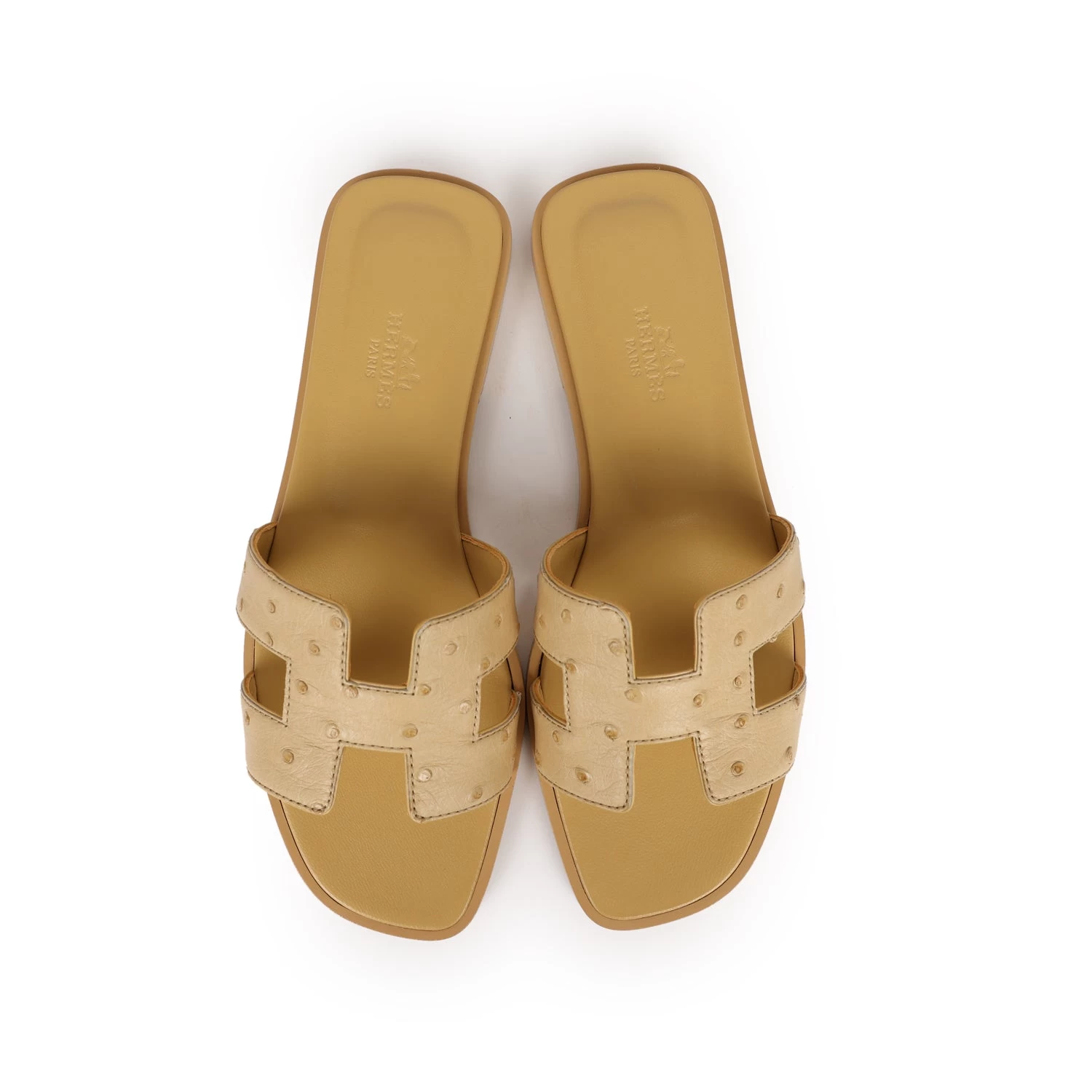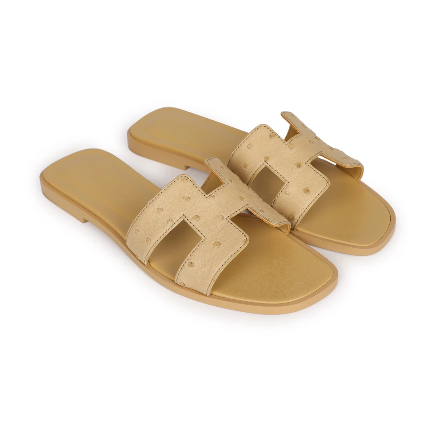 This pair of Oran sandals is in Beige Crin Ostrich with natural leather sole and natural leather heel heel
