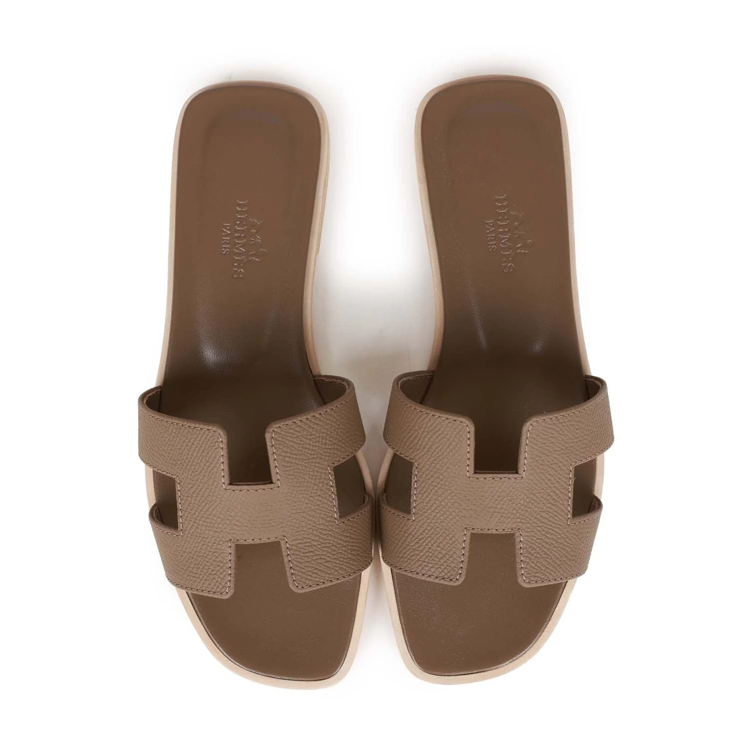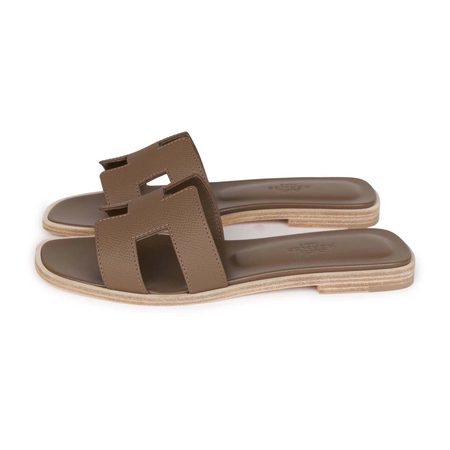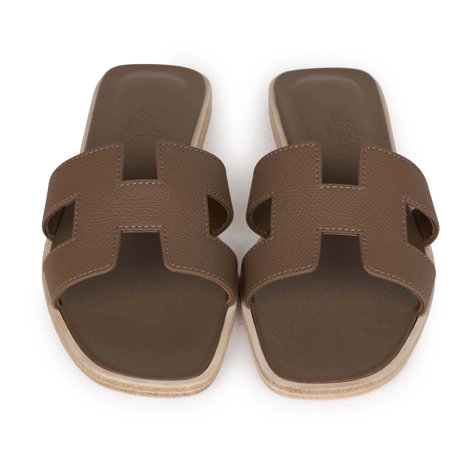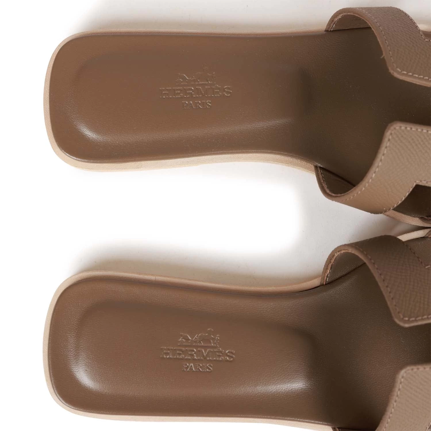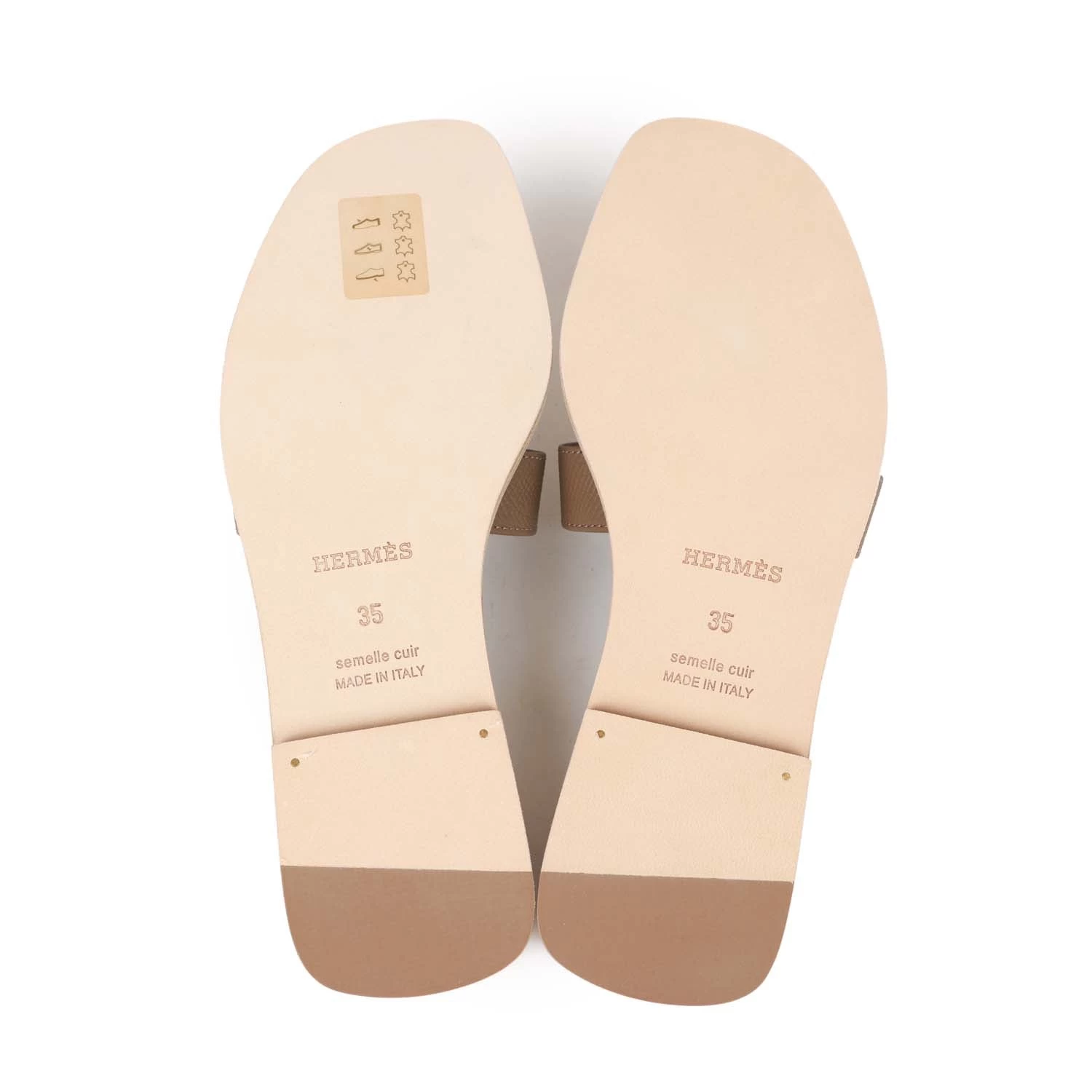 This pair of Hermes Oran Sandals are in Etoupe epsom with beige soles, tonal stitching and the iconic H crossover strap in size 35 EU.