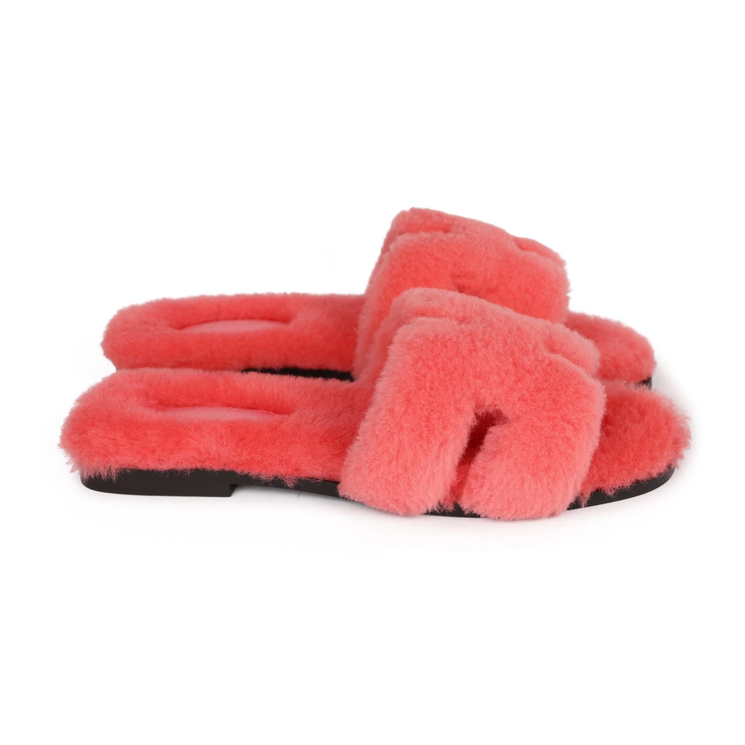 This pair of Oran Sandals are in Rose Du Desert shearling and feature the iconic H crossover strap with a black rubber sole.