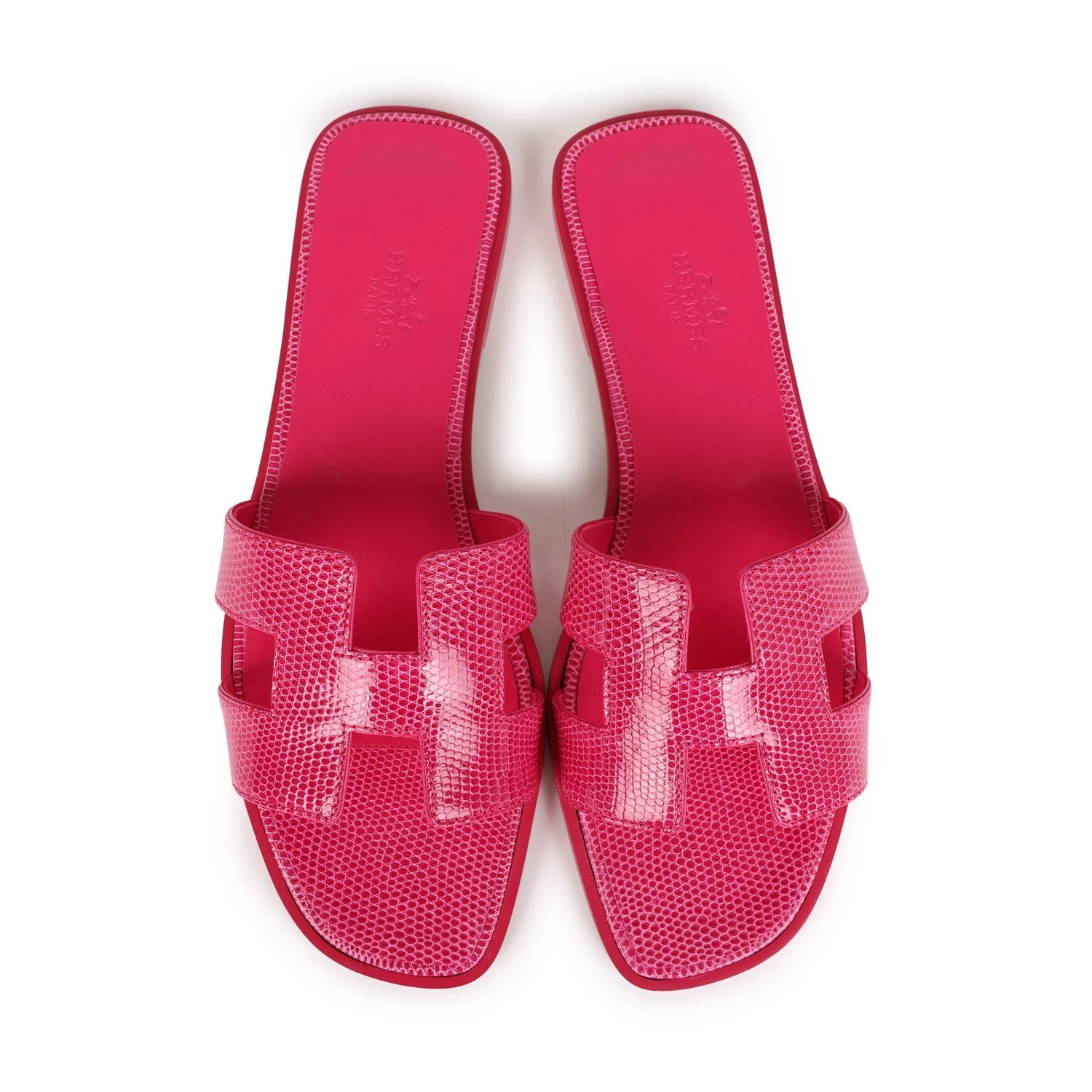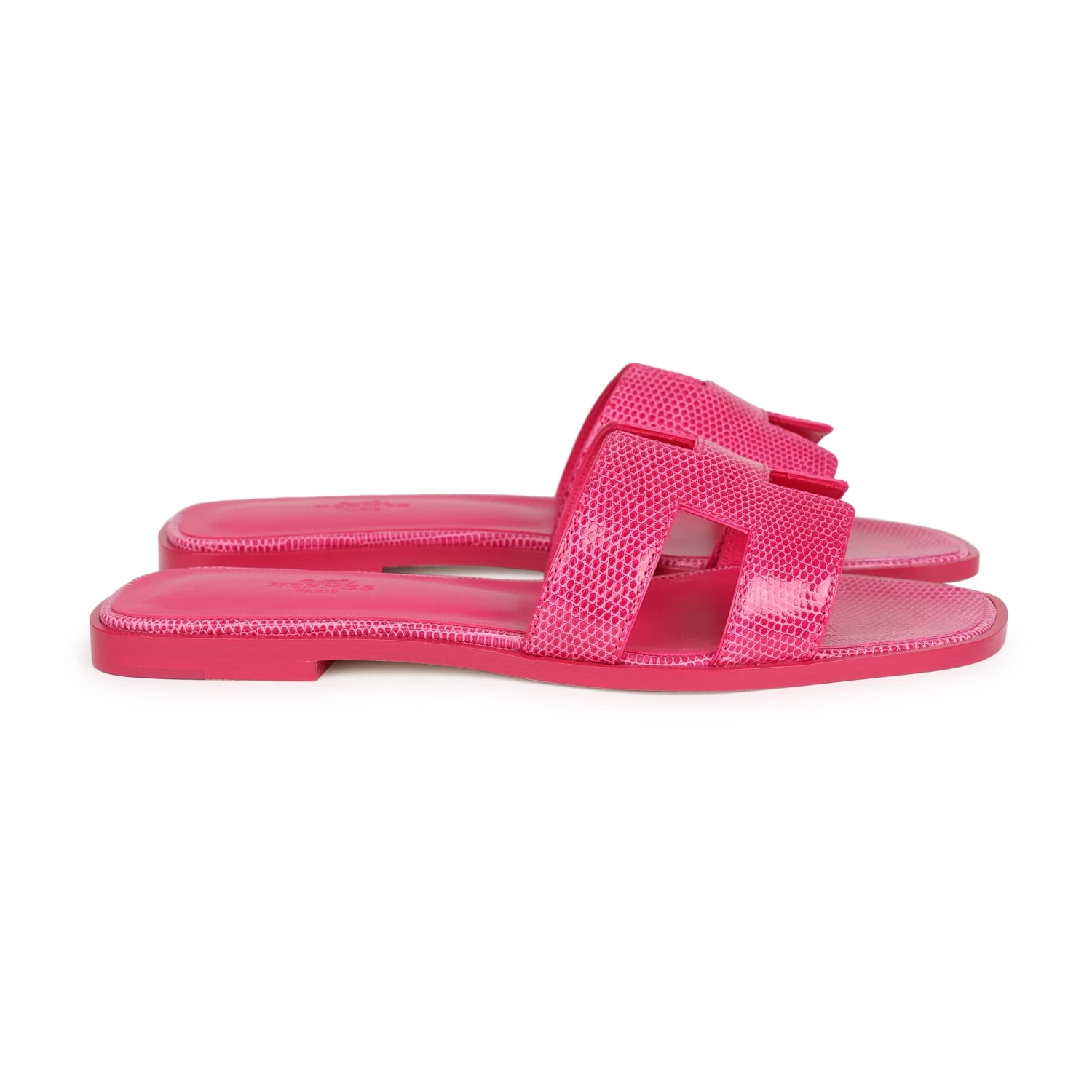 This pair of Oran sandals are in Rose Flash Lizard with natural leather sole and heel