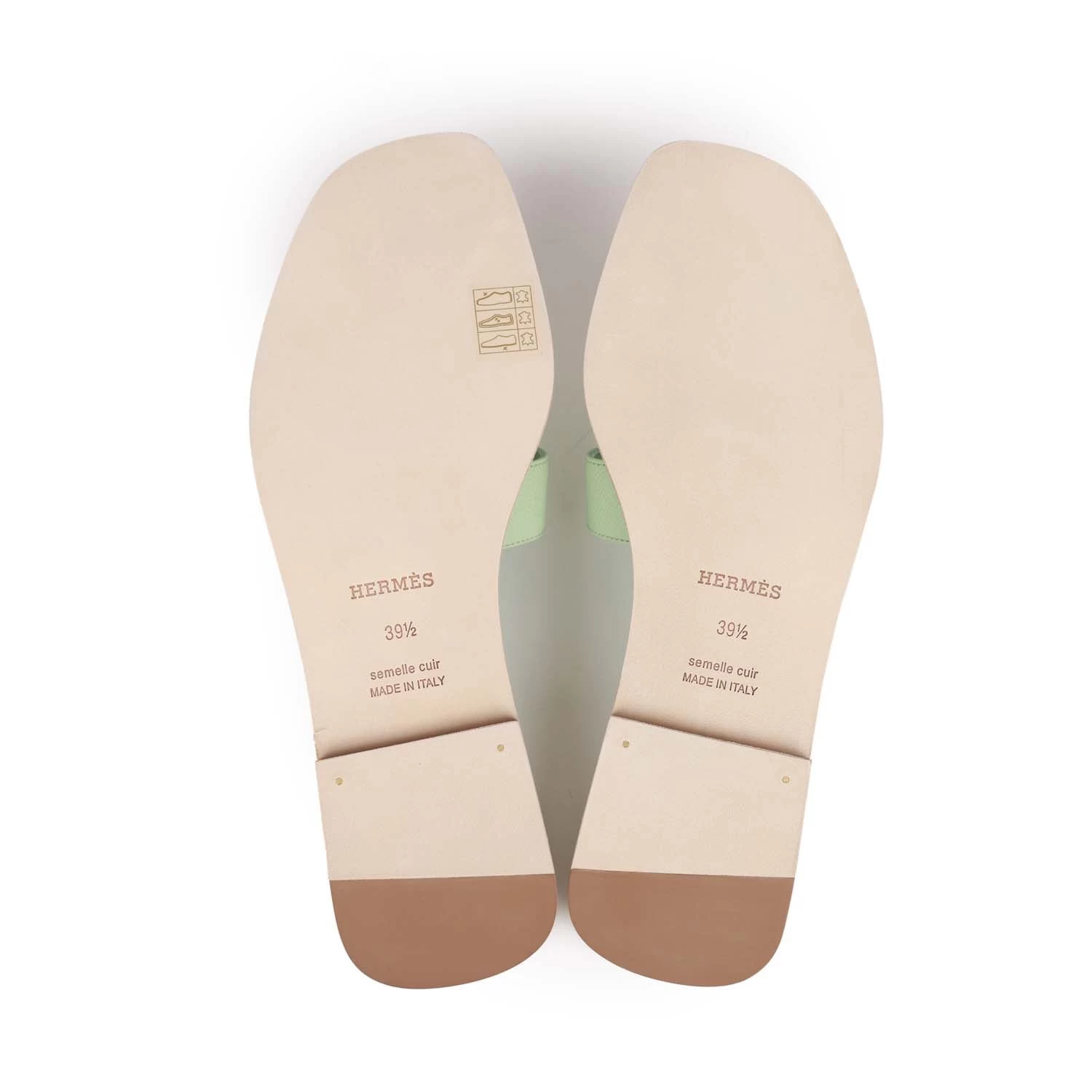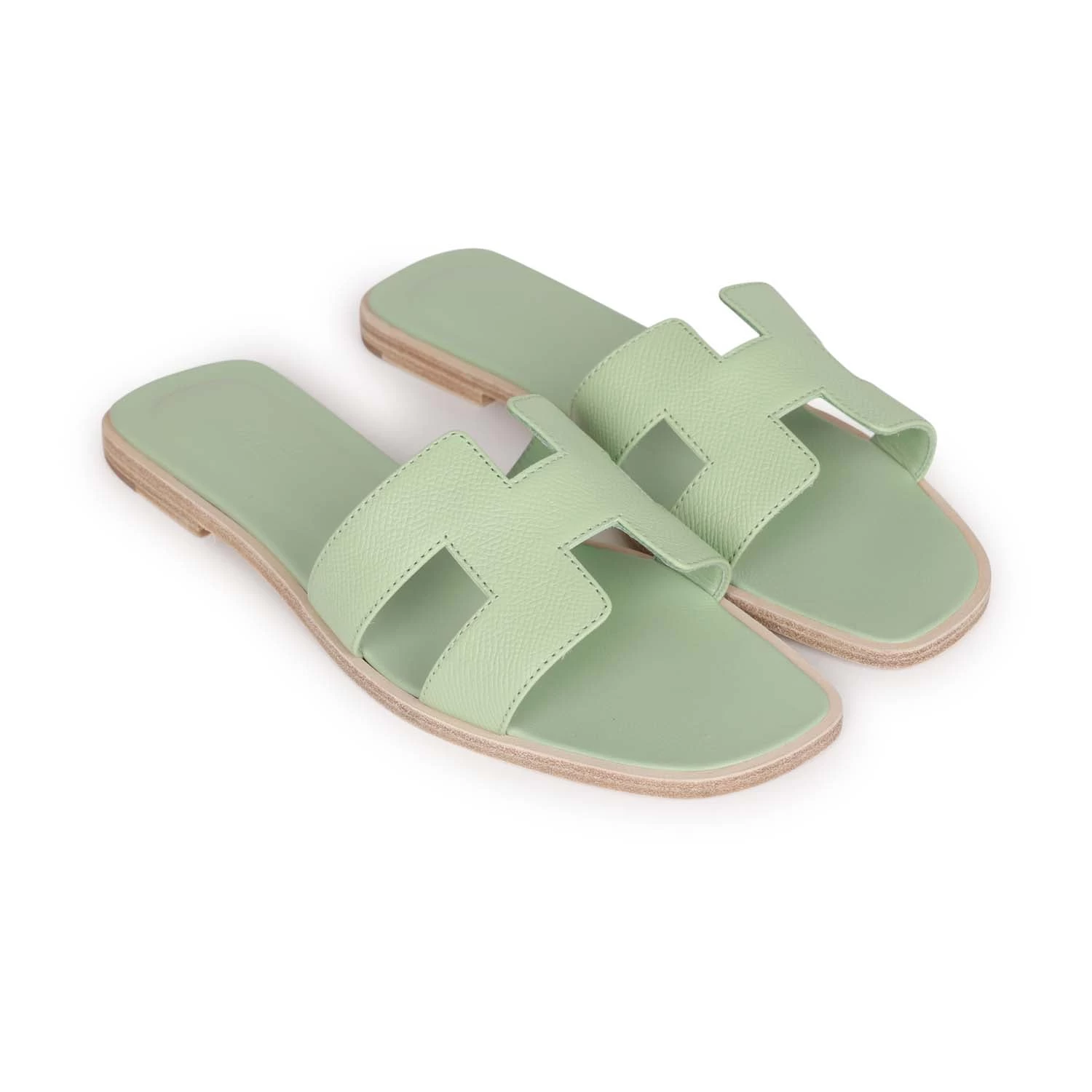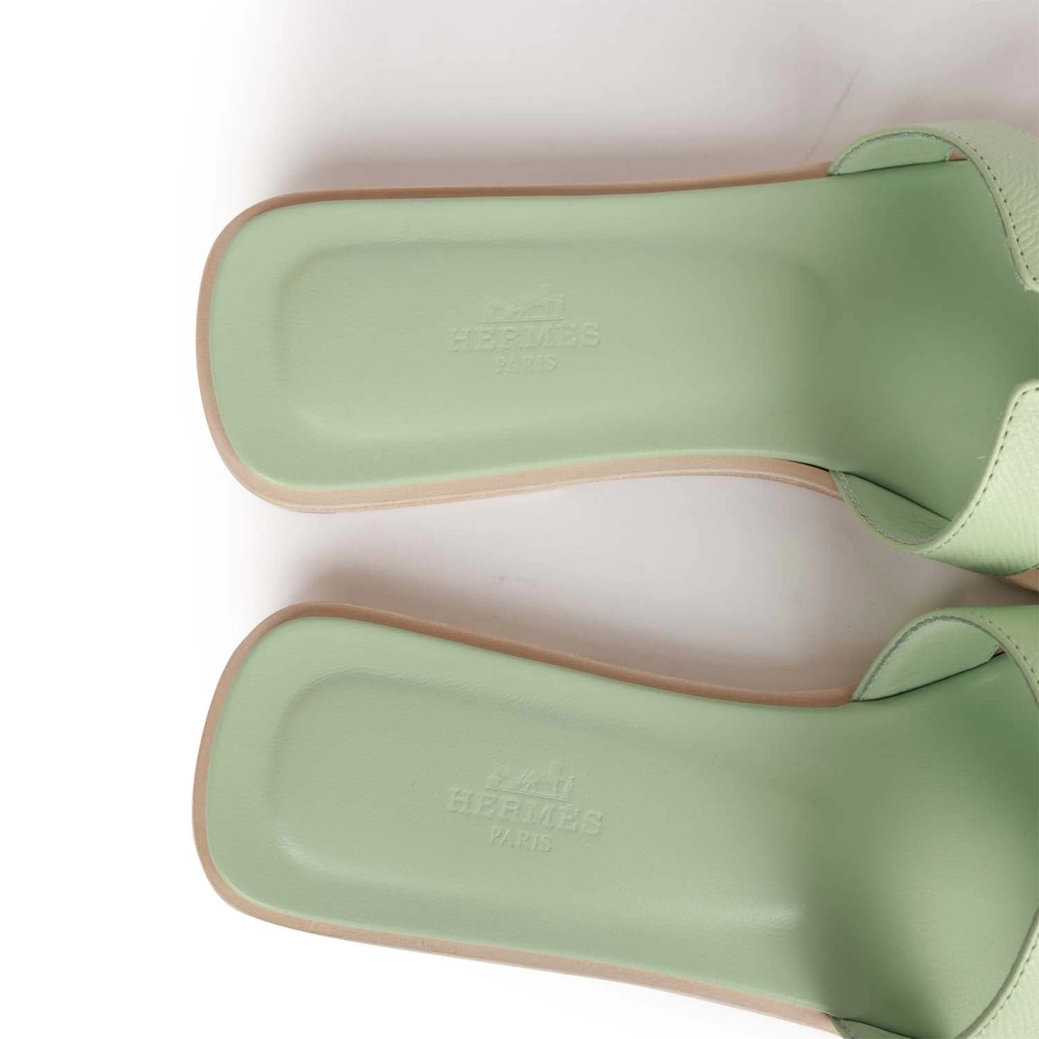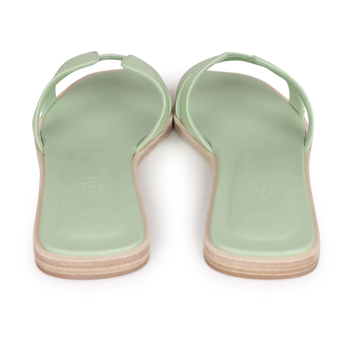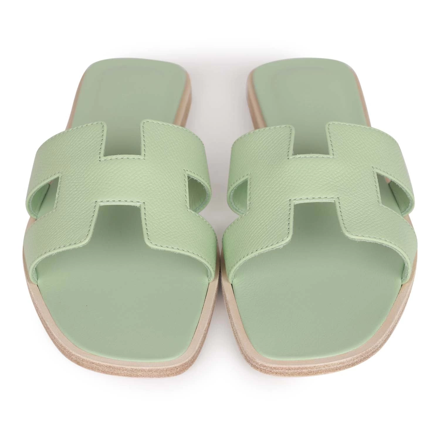 This pair of Oran Sandals are in Vert Jade epsom with the iconic H crossover strap and beige leather soles.