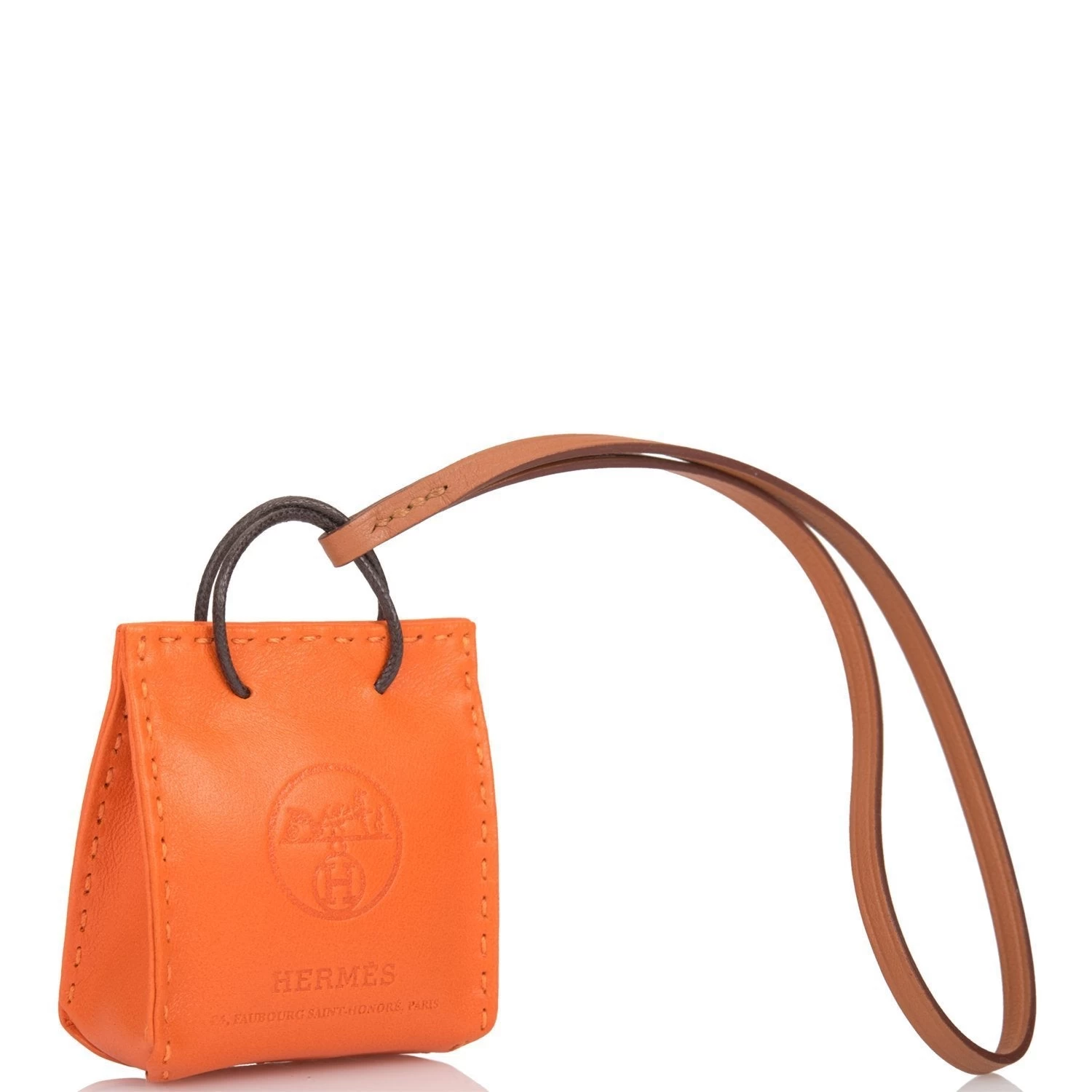 This Mini Shopping Bag Charm is in orange leather and is in the shape of an Hermes bag with small black handles and gold strap.