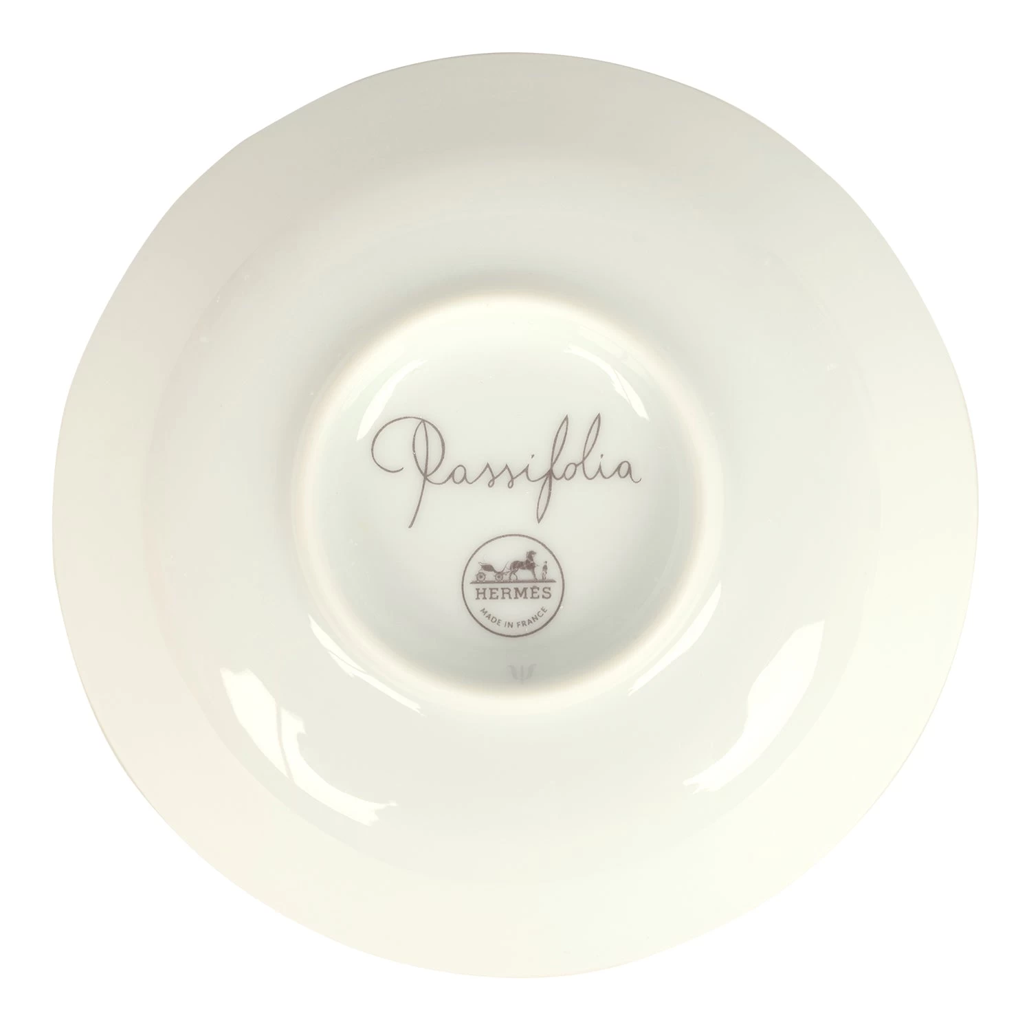 This Hermes Passifolia soy dish set is in green, pink and white porcelain, featuring two 1″ soy dishes with 24 carat gold trim around top of bowl and a multi-colored screen-printed design.