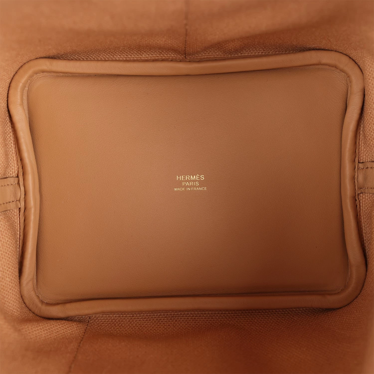 This Cargo Picotin Lock is in Chai swift leather and toile with gold hardware and has tonal stitching, four exterior pockets with two top handles.