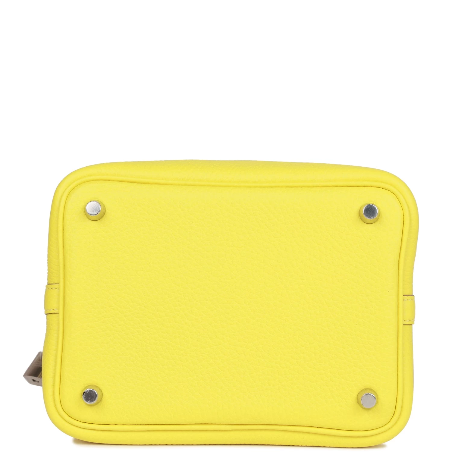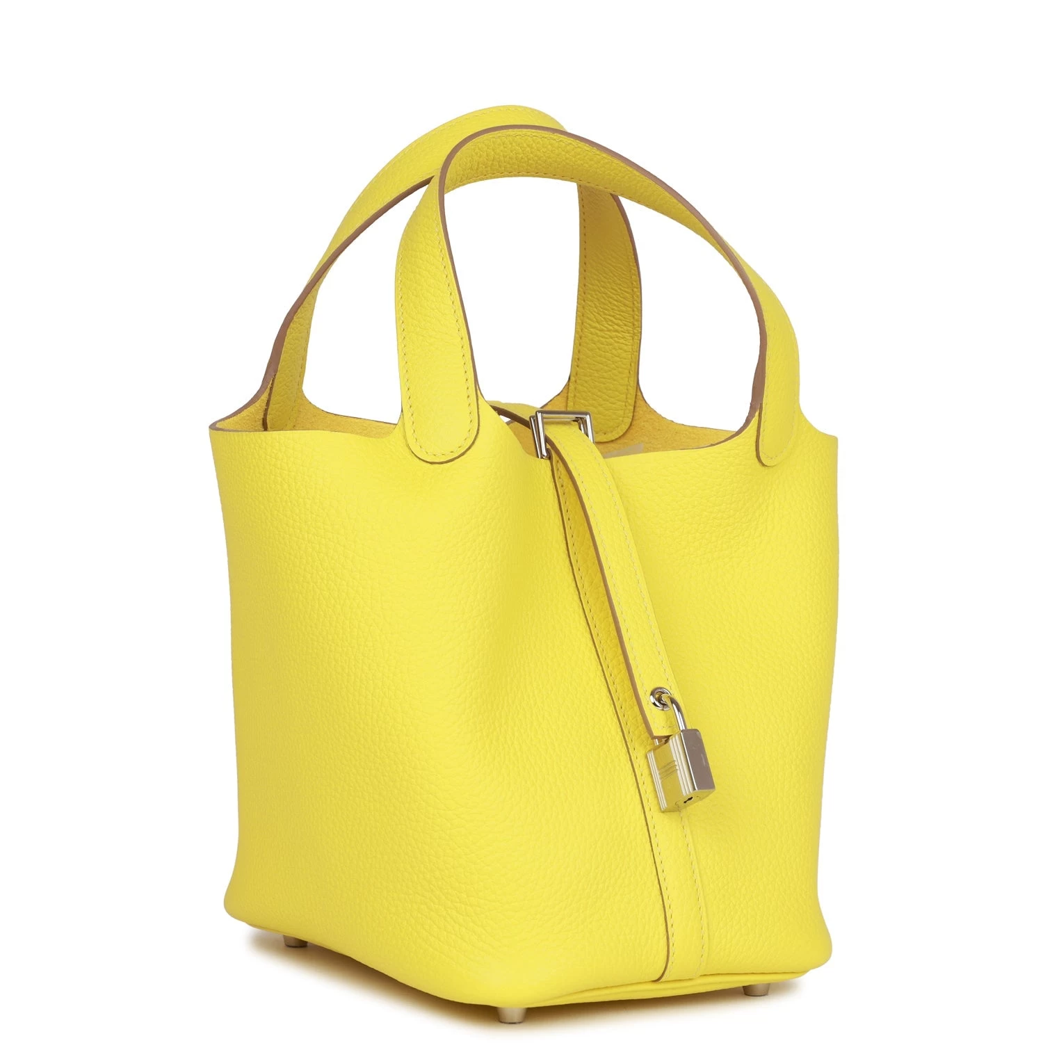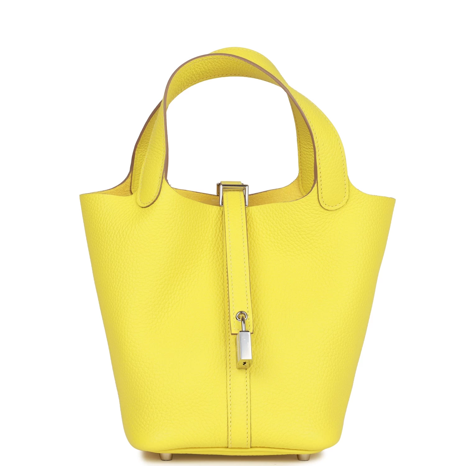 This Picotin Lock is in Lime clemence leather with palladium hardware and has tonal stitching with two top handles.