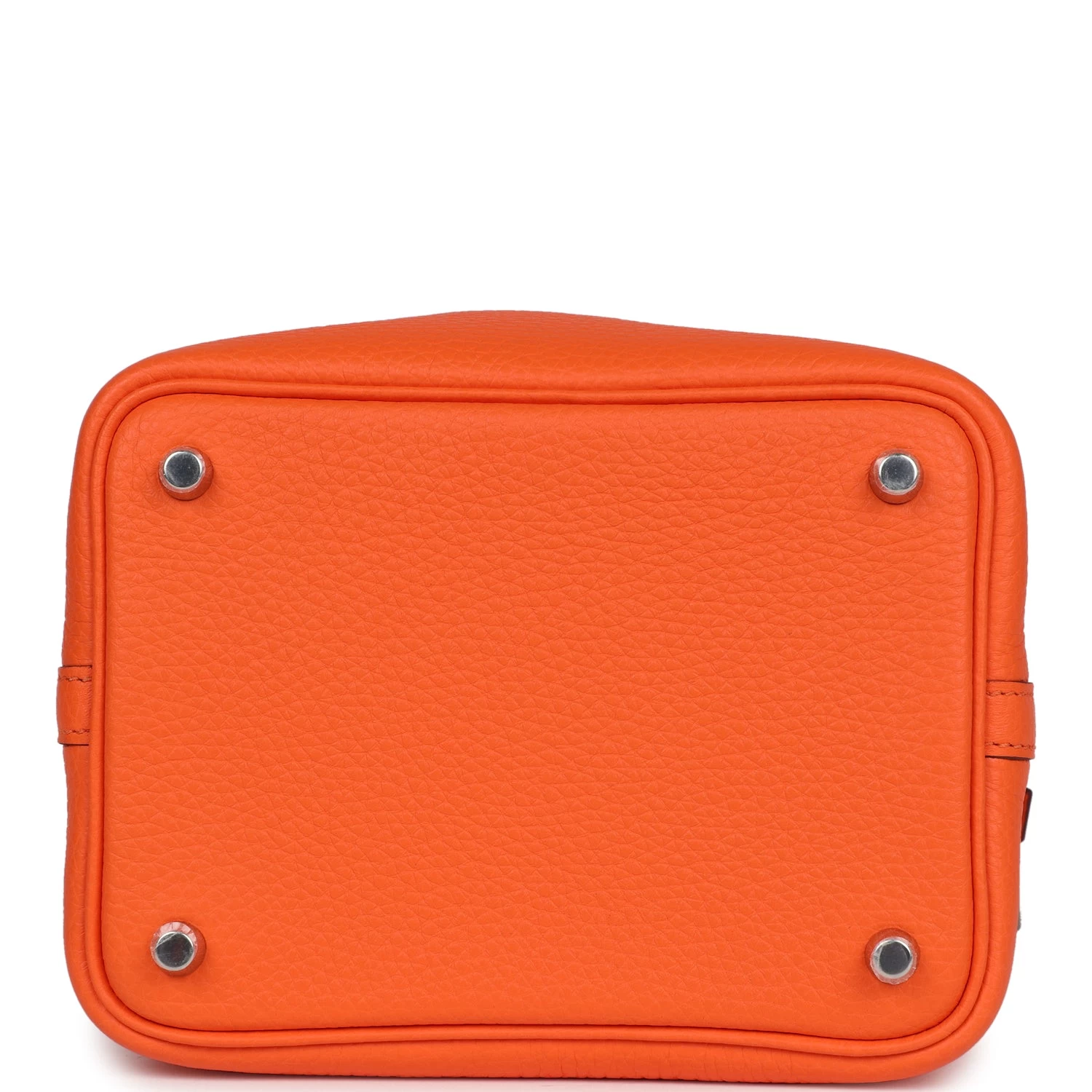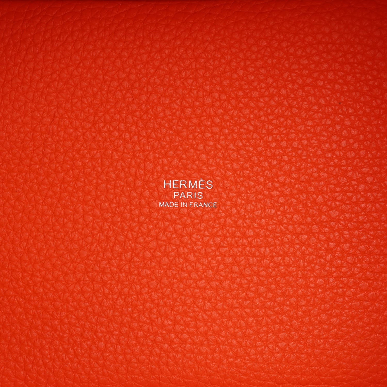This Picotin Lock 18 is in Orange Minium clemence leather with palladium hardware and has tonal stitching with two top handles.