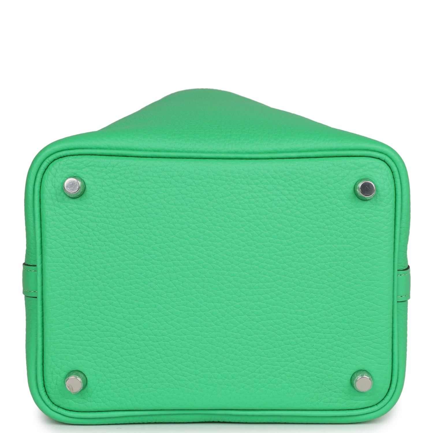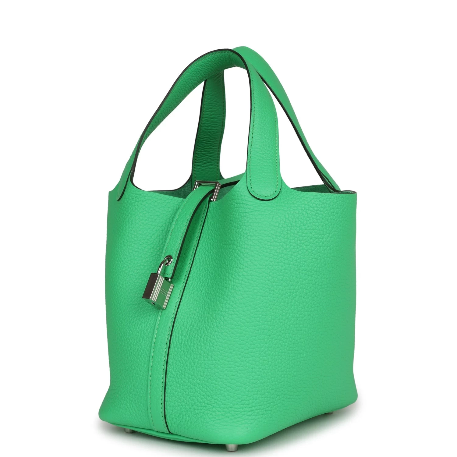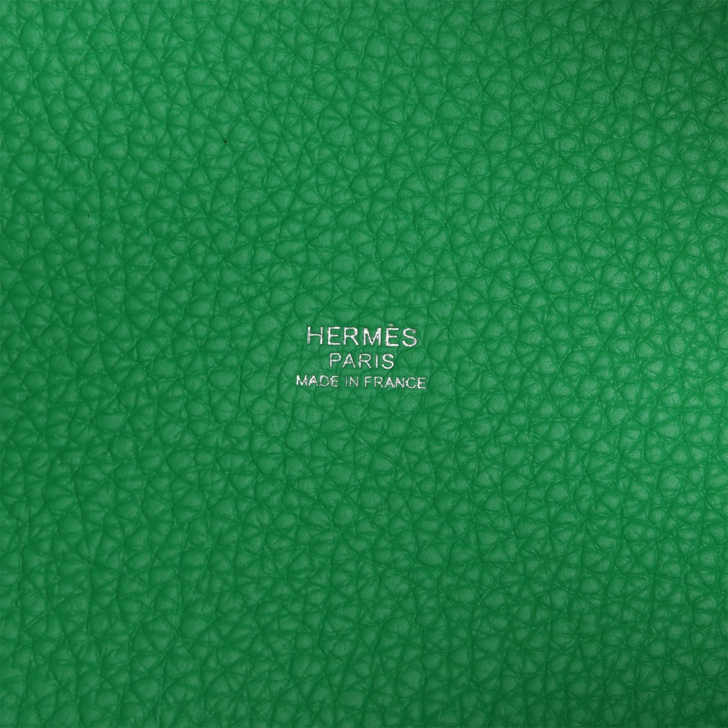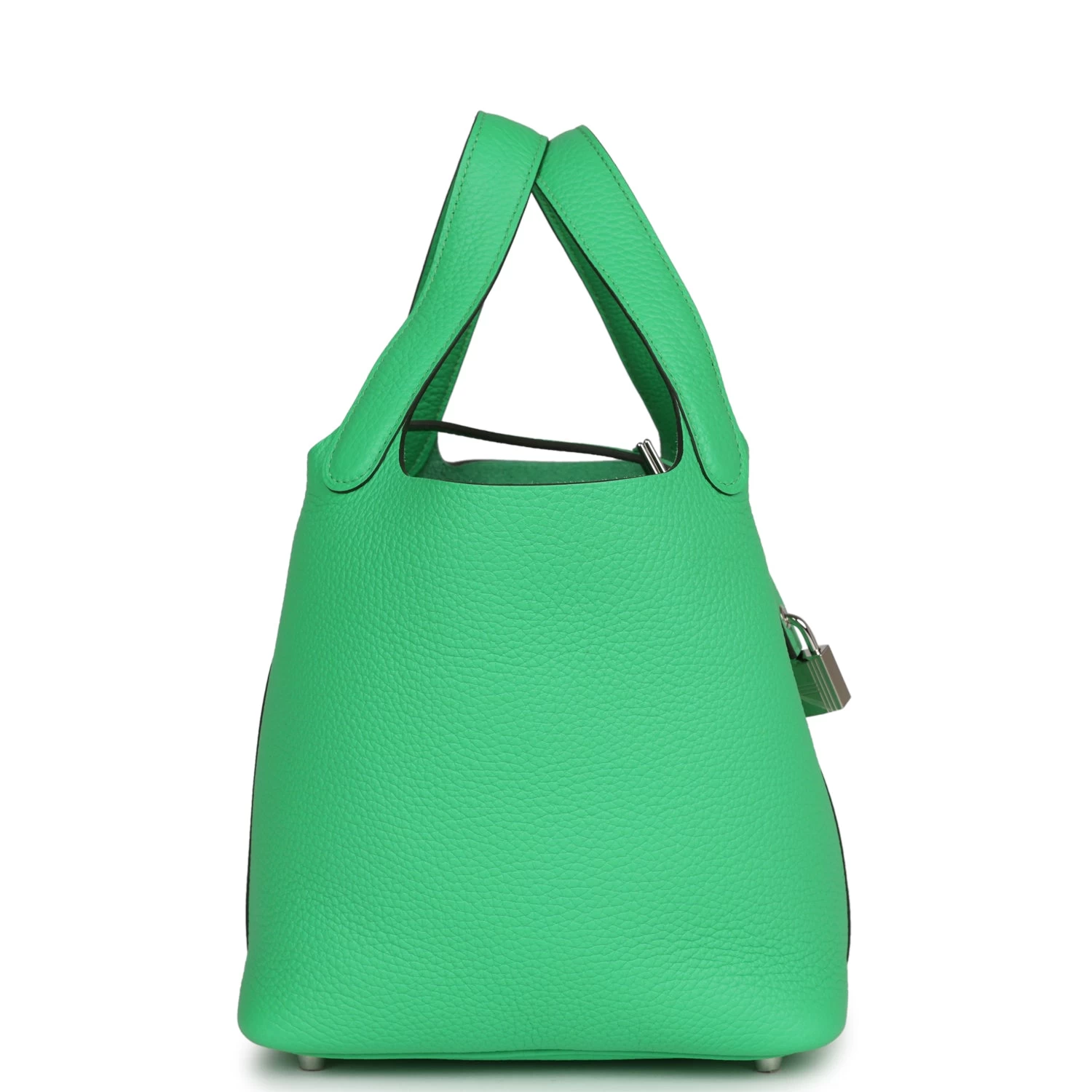 This Picotin Lock is in Vert Comics clemence leather with palladium hardware and has tonal stitching with two top handles.