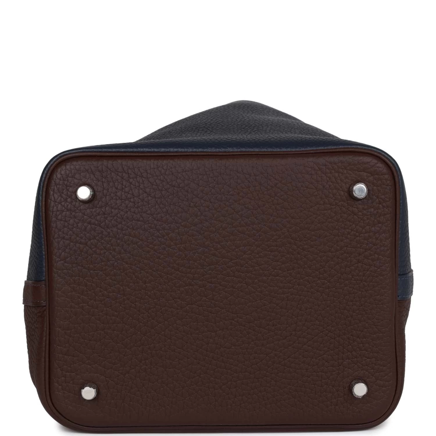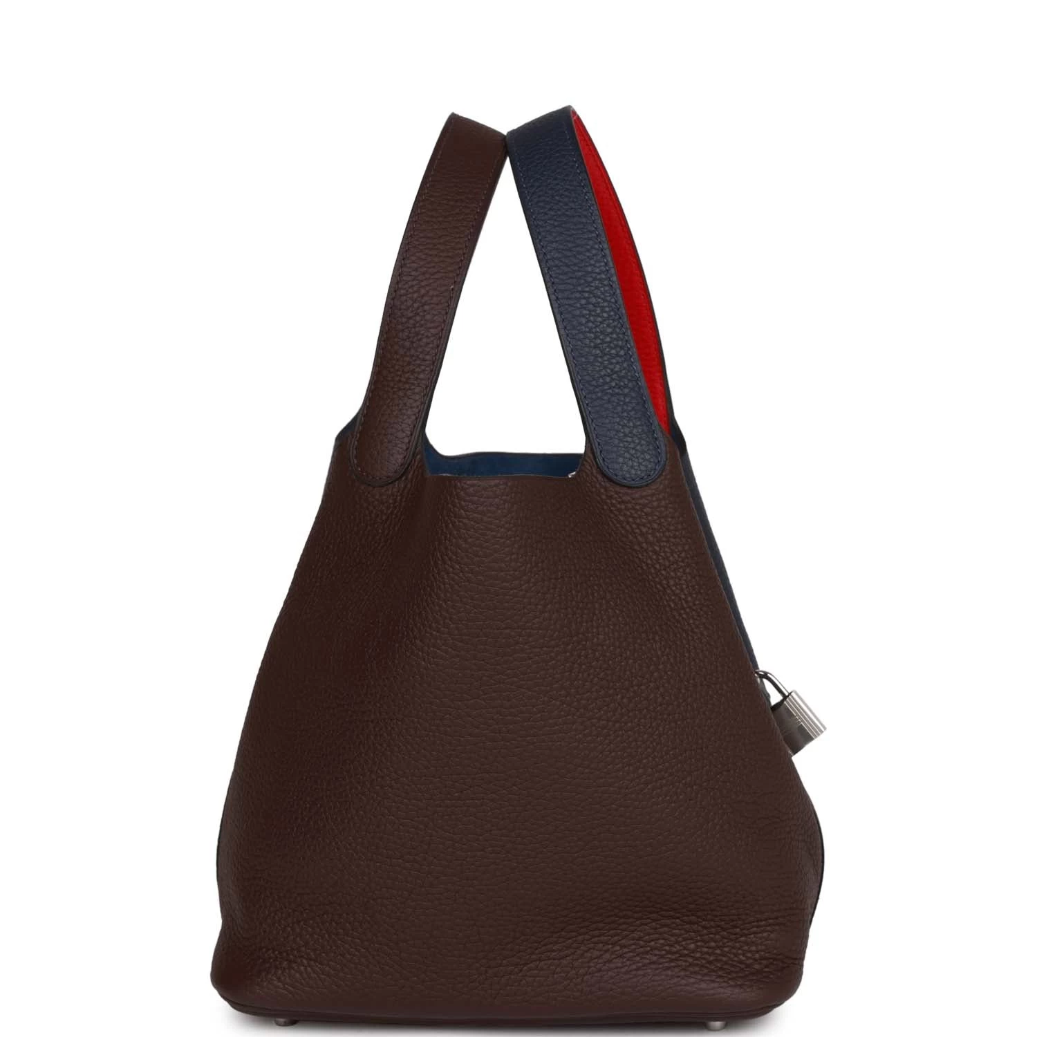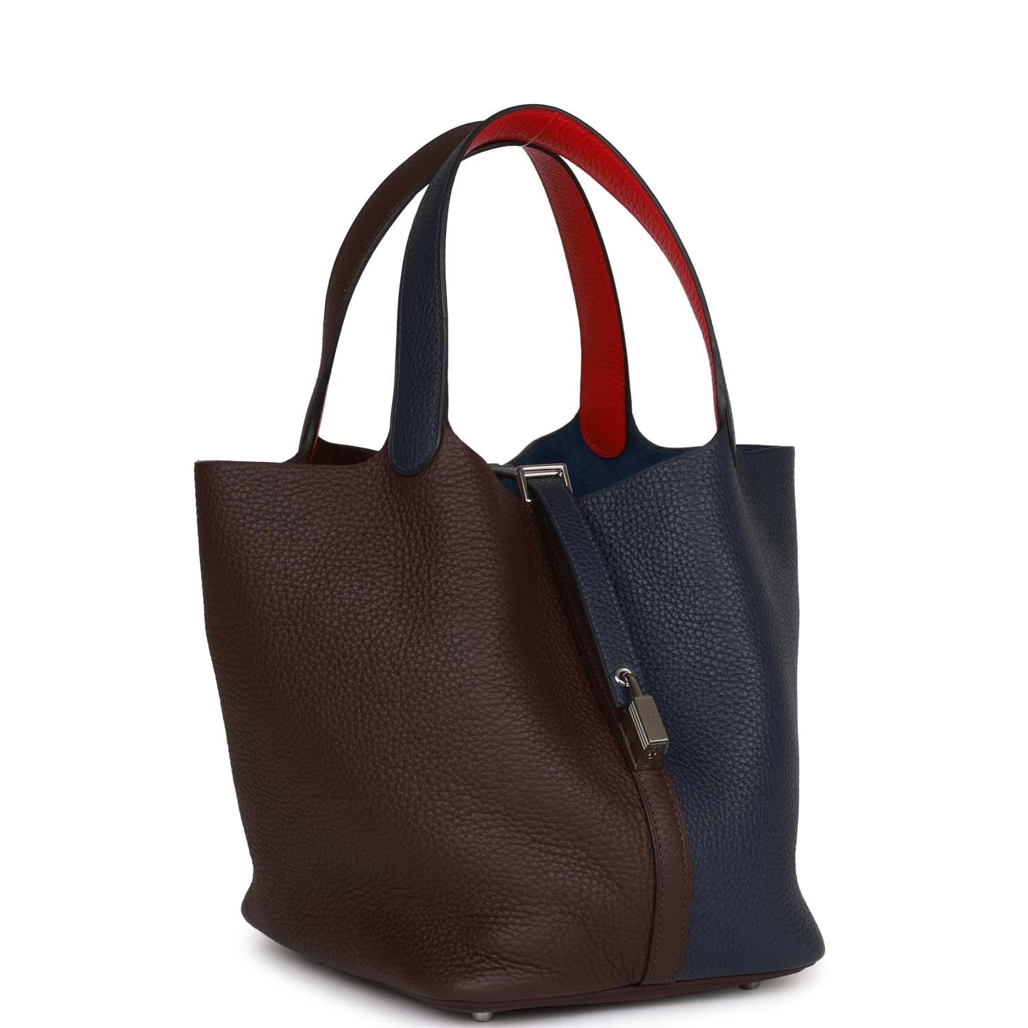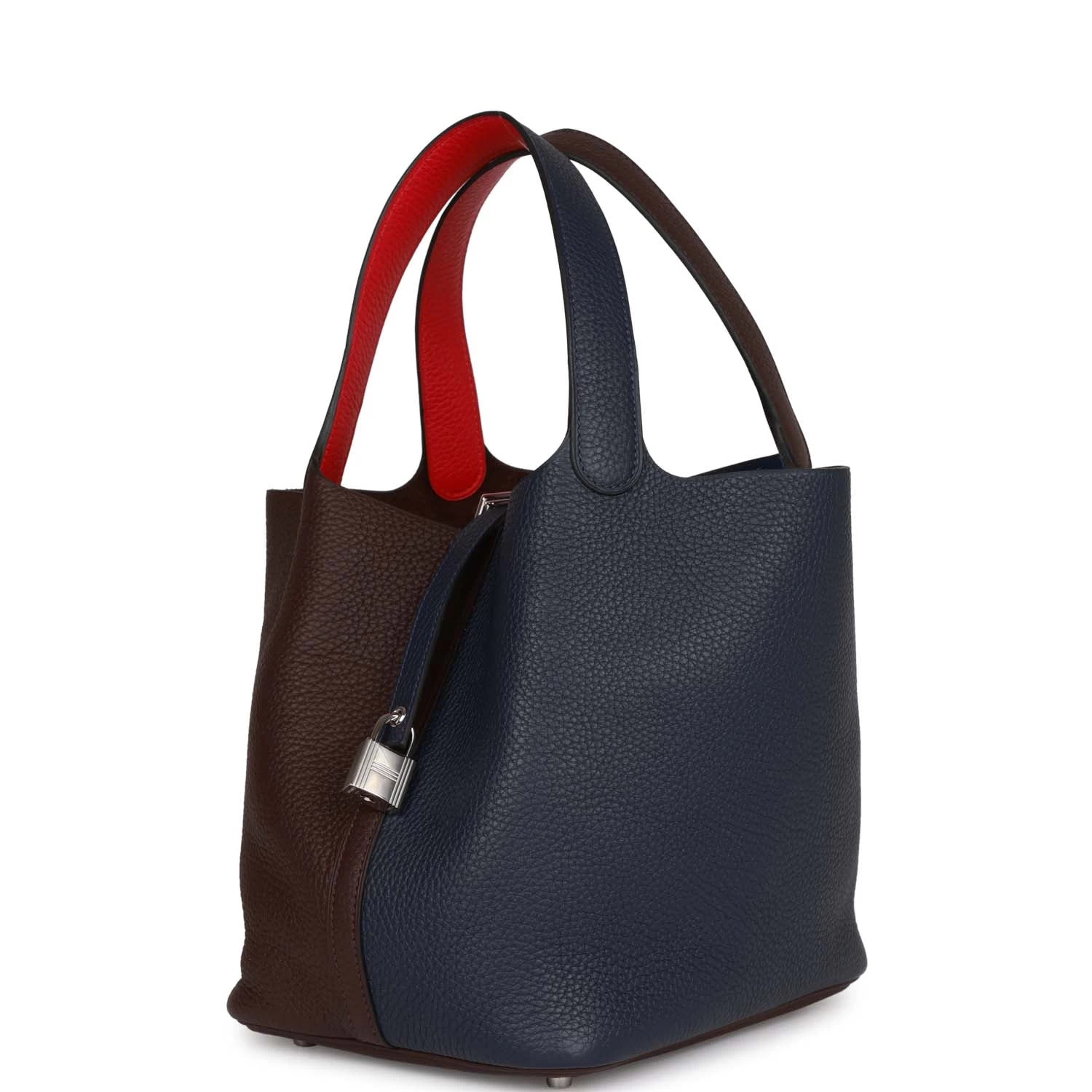This Casaque Picotin is of Bleu Nuit, Framboise, and Rouge Sellier Clemence leather with palladium hardware and has tonal stitching with two top handles