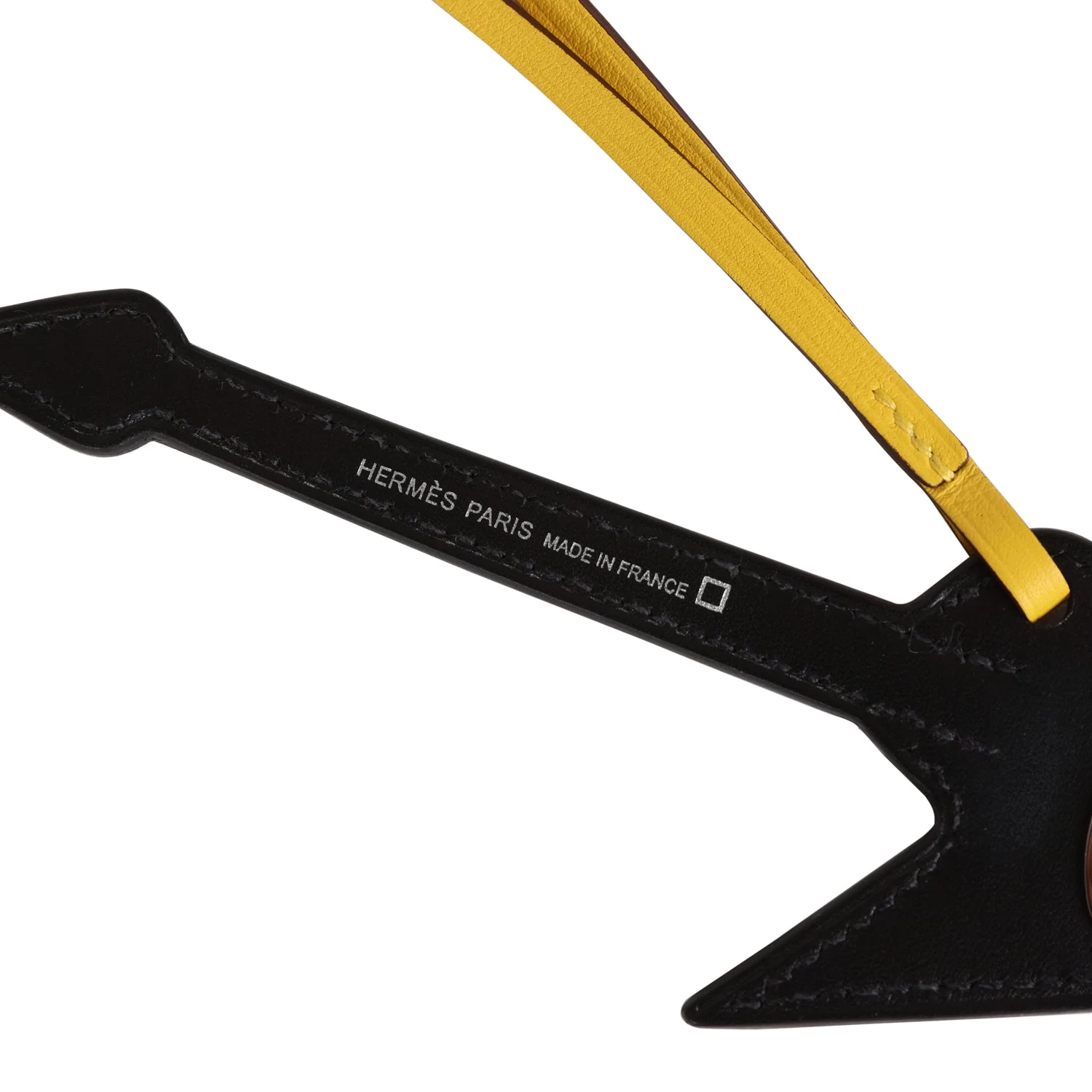 This Rock Touch bag charm is in Rouge de Coeur shiny alligator, black swift, Jaune de Naples tadalakt and Mushroom chevre and is accented by a palladium button and pick.