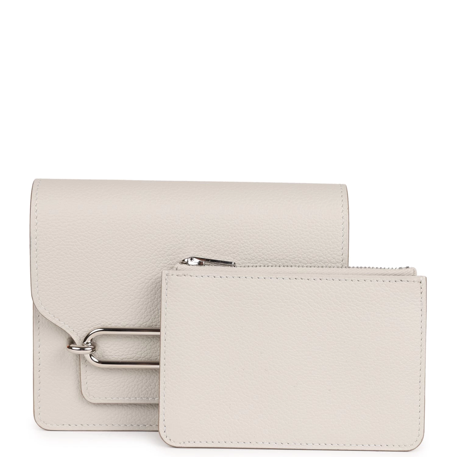 This Roulis Slim Wallet is in Gris Perle Evercolor with Palladium hardware, two interior credit card slots, removable zipper coin purse, front palladium plated H clasp, and a belt loop on back exterior.