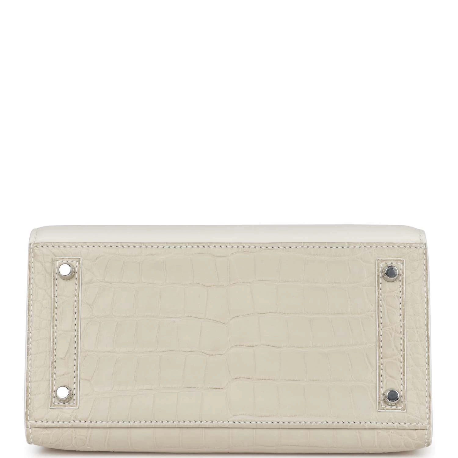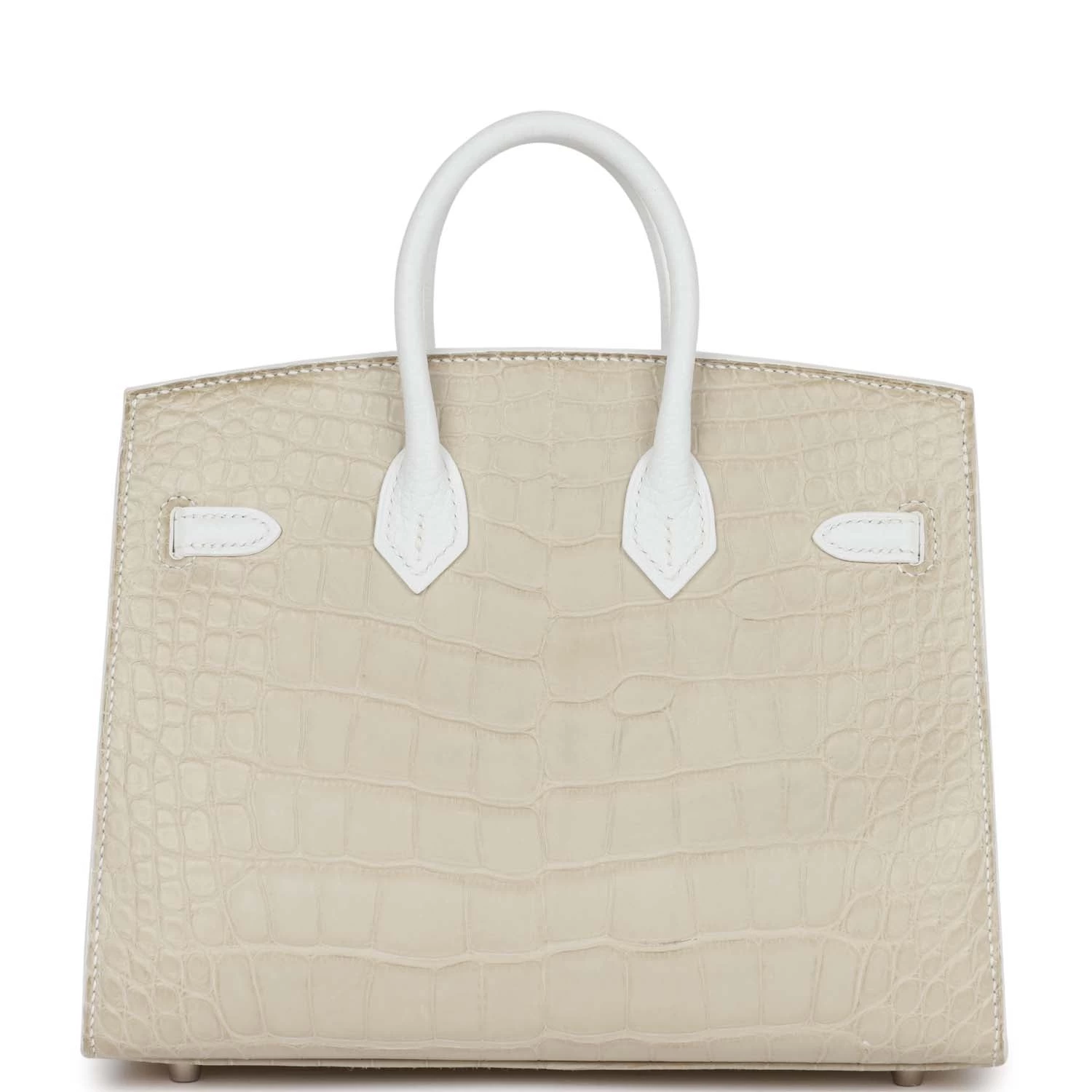 This Hermes extremely rare VIP Birkin Sac Faubourg 20cm is in a combination of five different leathers and an alligator skin with palladium hardware. The body of the bag is in white Madame calfskin; the front flap, handles and strap are in white matte alligator; the awnings, tiret and “shopping bag” clochette are in Orange H swift leather; the trim is in white Sombrero; the window panes are in Craie epsom leather and the base is in white Sombrero leather.
