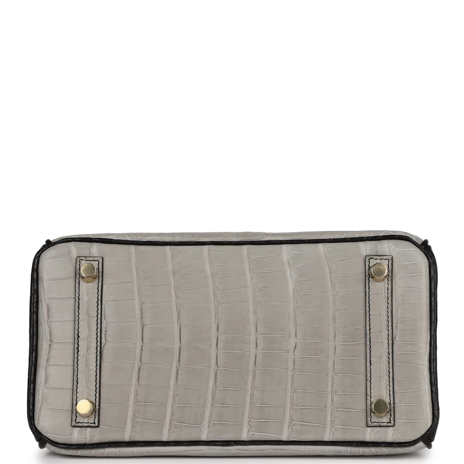 This Special Order Birkin is in Gris Perle and Black matte Mississippienis alligator leather with brushed gold hardware and has contrast stitching, front strap, two straps with center toggle closure, clochette with lock and two keys and double rolled handles.