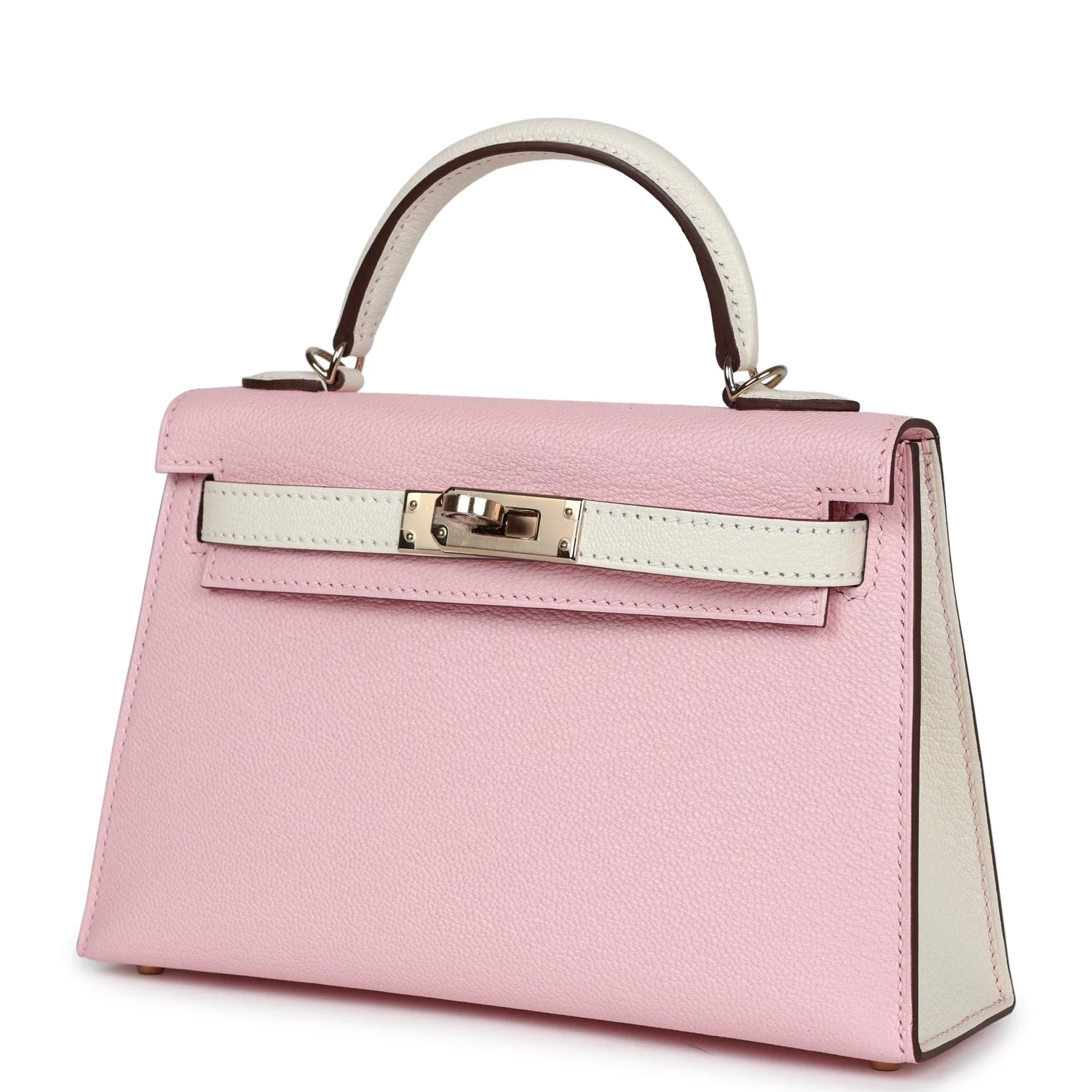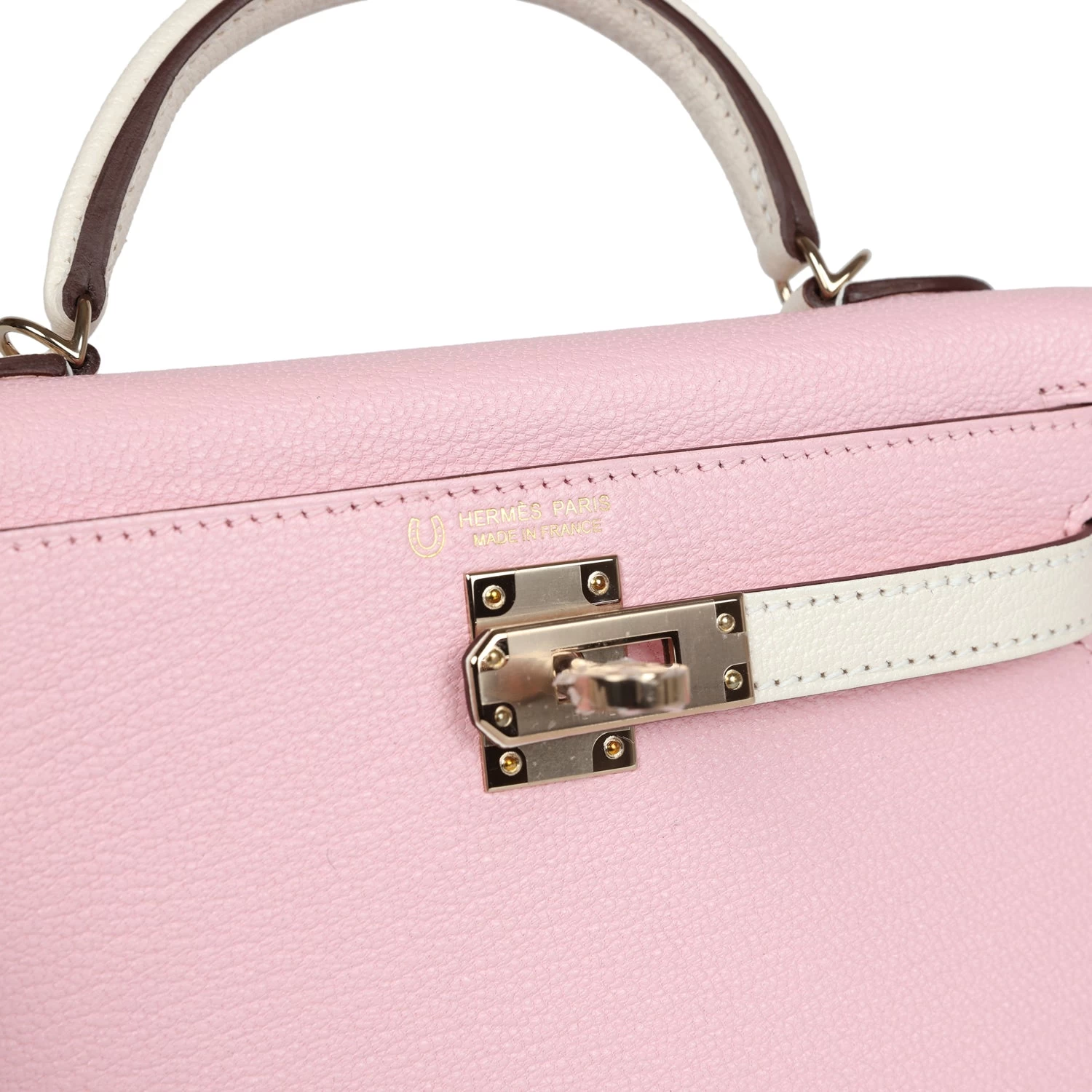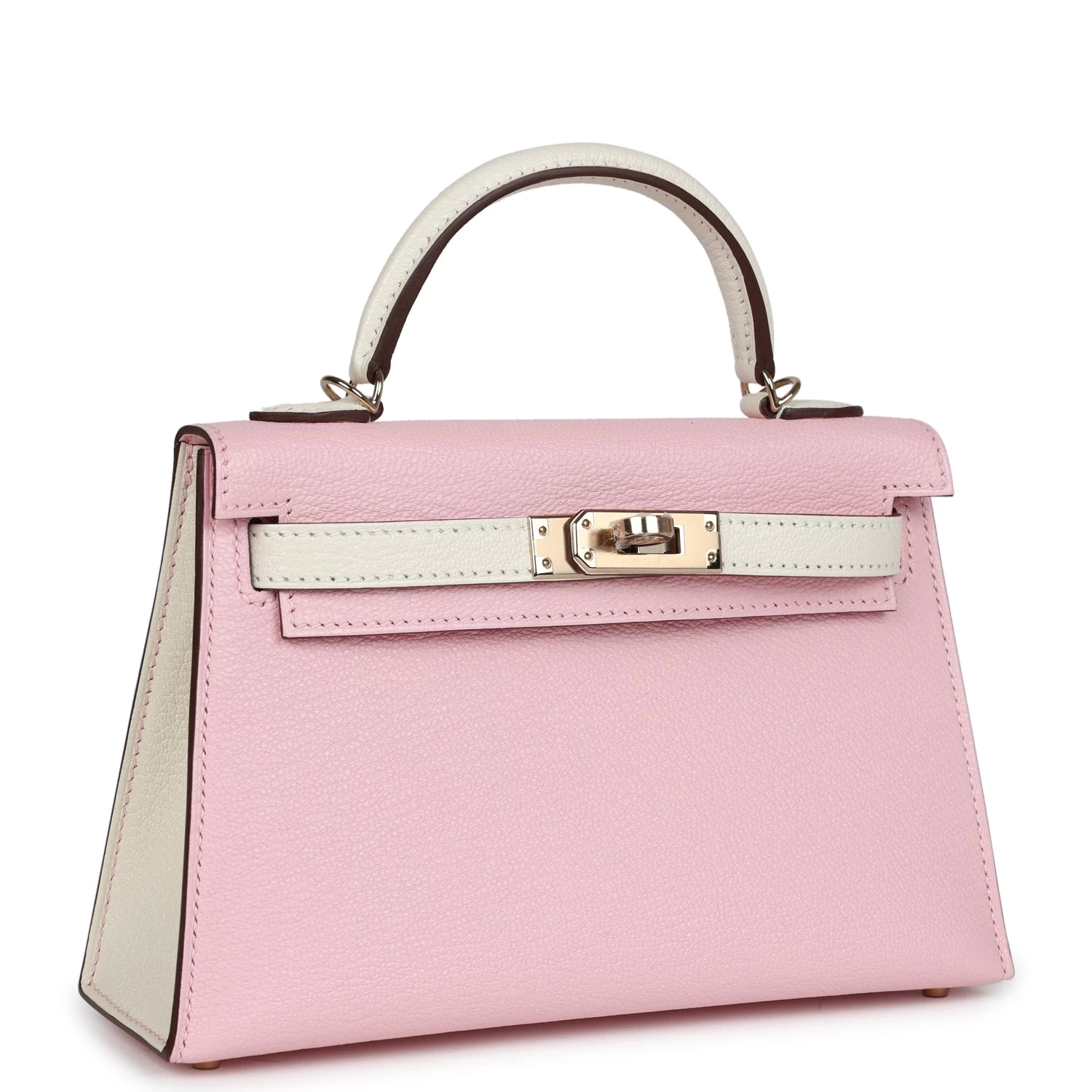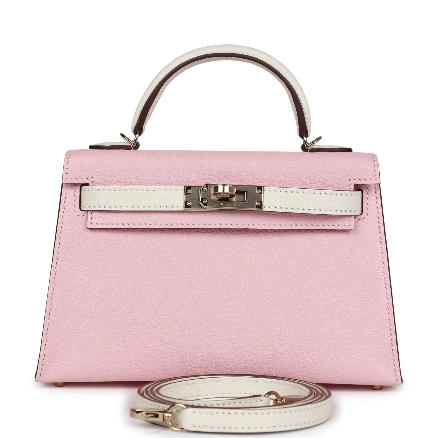 This Special Order Kelly, in the Sellier style, is in Rose Sakura and Nata Chevre Mysore with permabrass hardware and features tonal stitching, front flap with two straps, front toggle closure, clochette with lock and two keys, and single rolled handles.