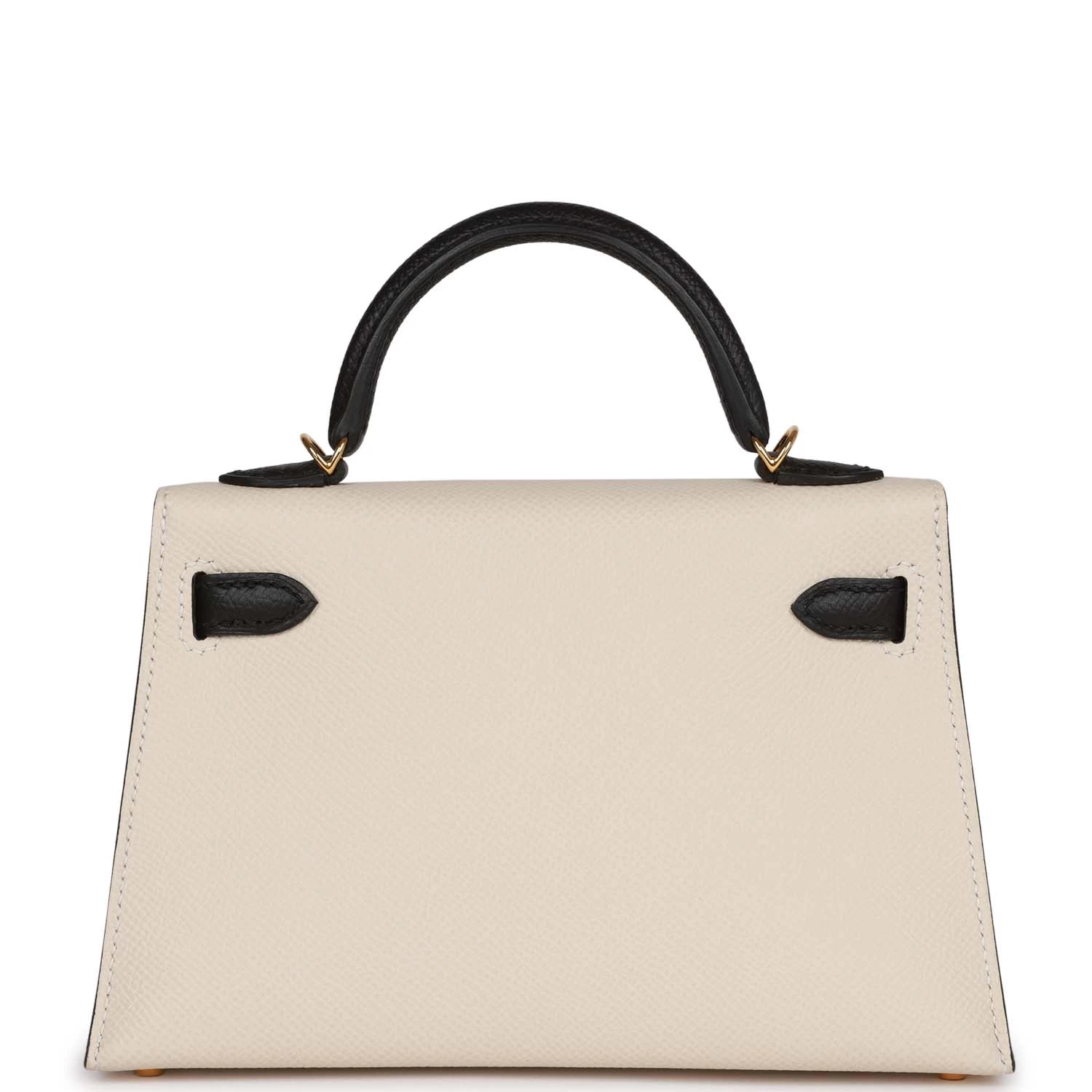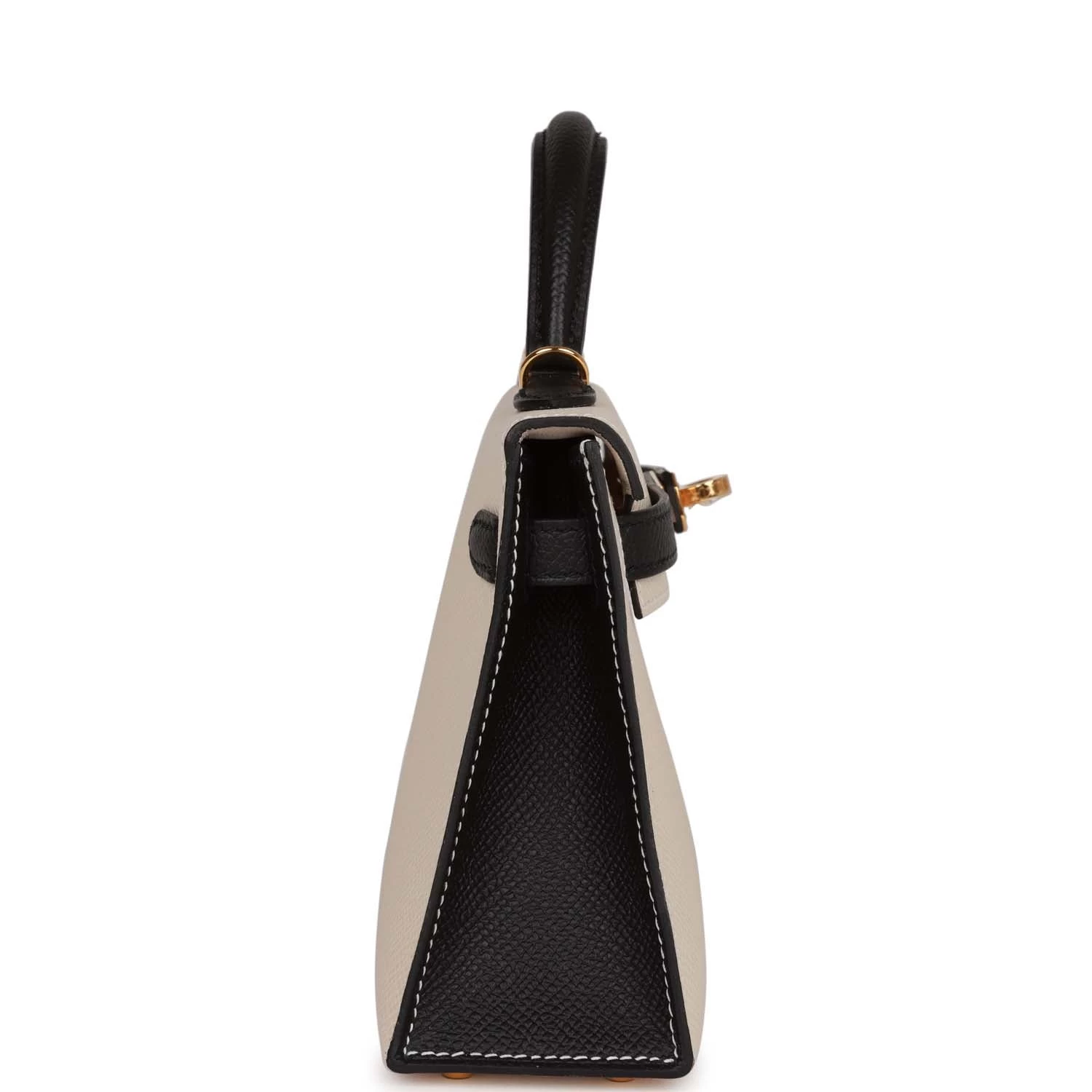 This tiny Horseshoe Stamp Kelly, in the Sellier style, is in Craie and Black epsom leather with gold hardware, has contrast and tonal stitching, two front straps with front toggle closure, single rolled handle and removable shoulder strap.