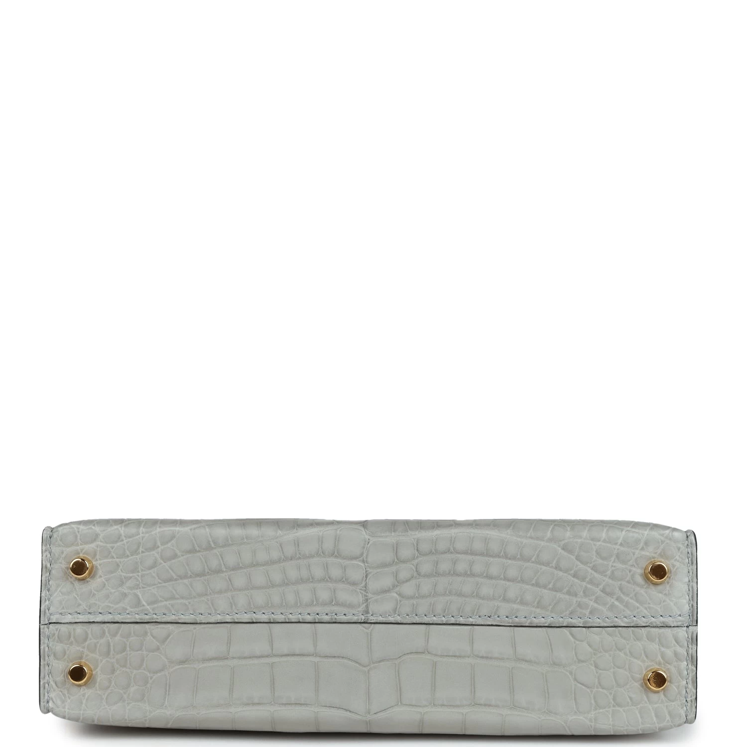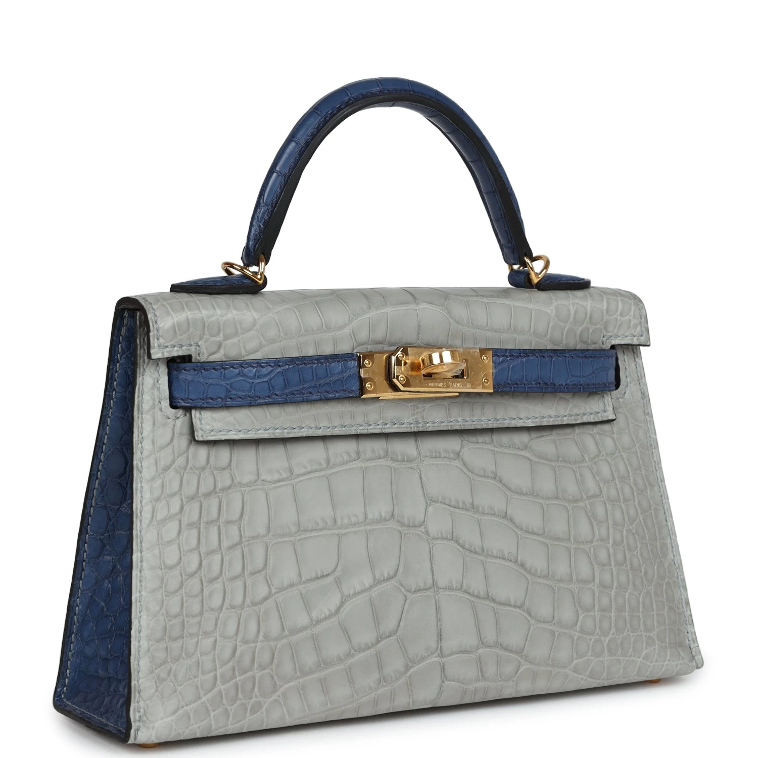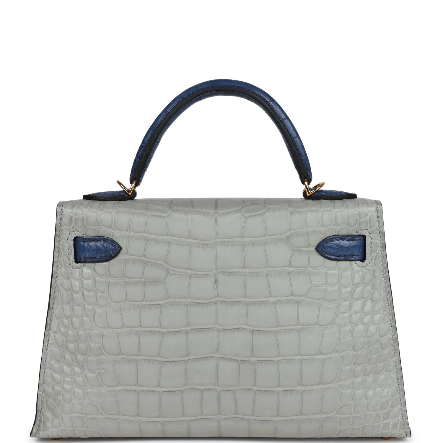 This Special Order Kelly, in the Sellier style, is in Gris Perle and Bleu de Malte Matte Mississippiensis alligator with gold hardware and has tonal stitching, two straps with front toggle closure, single rolled handle and removable shoulder strap.