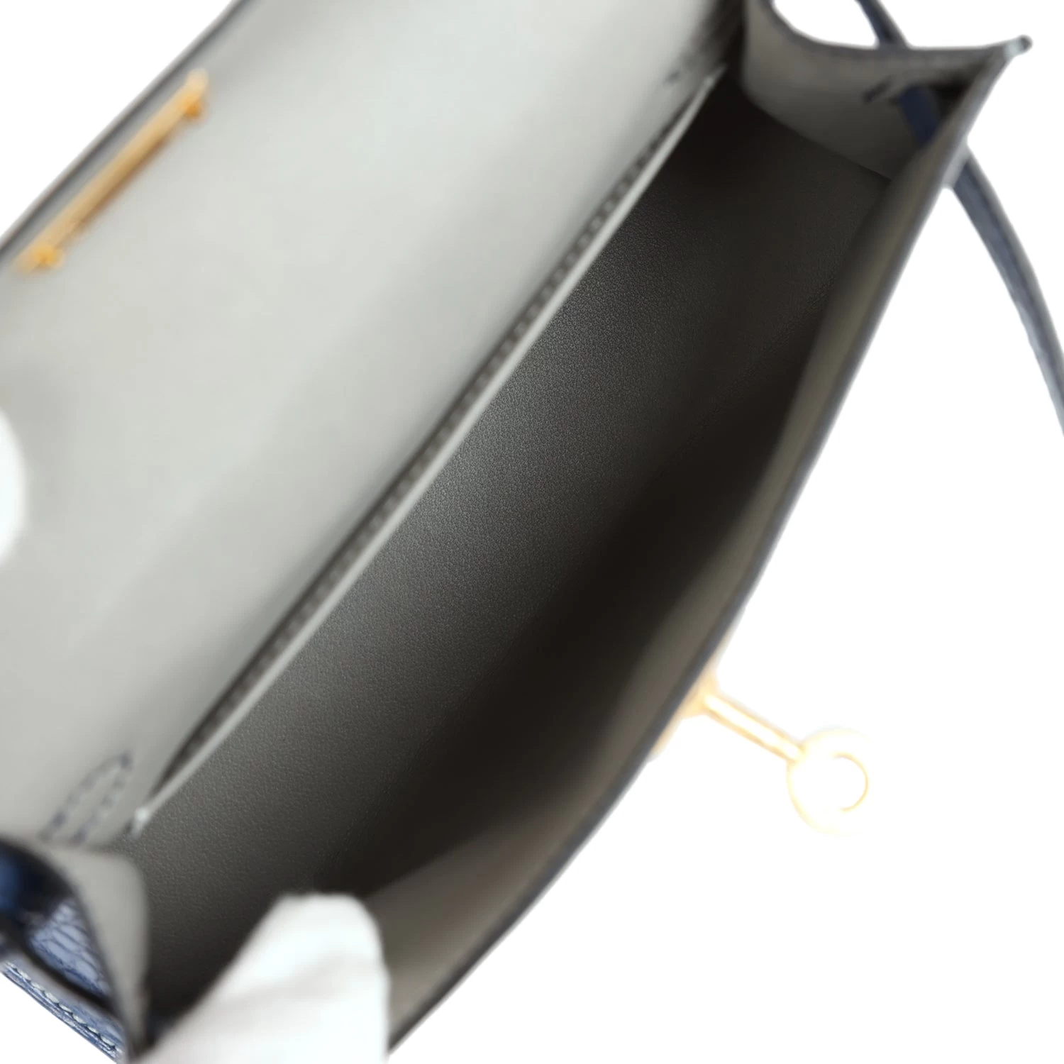 The interior is lined with Gris Perle lambskin leather and has one zip pocket with an Hermes engraved pull and one open pocket on the opposite side.