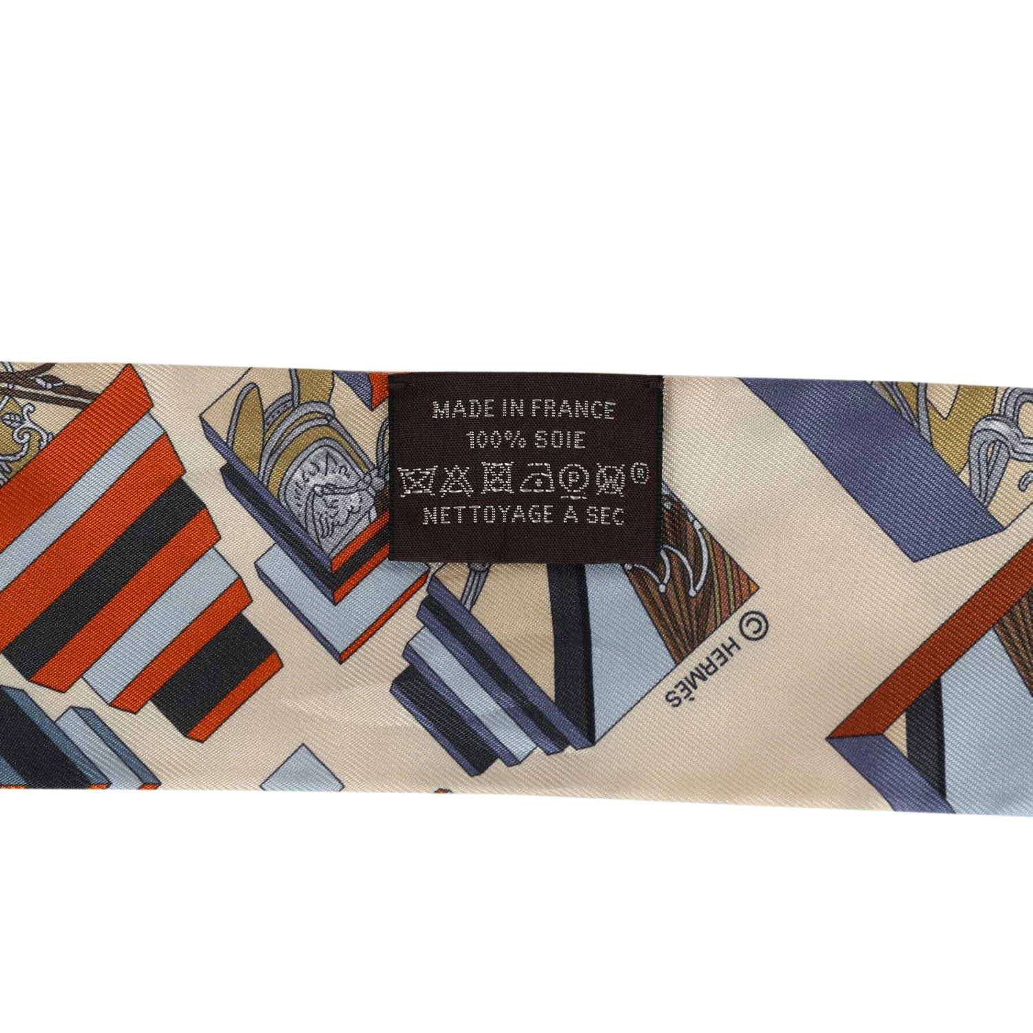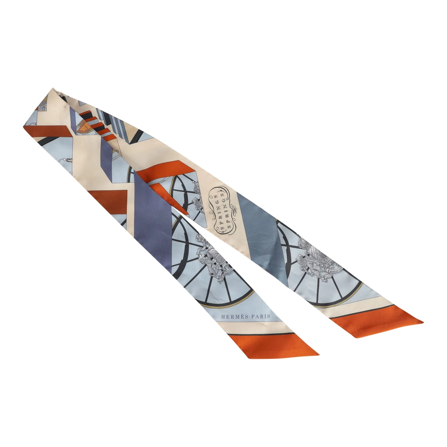 This Hermes “Springs Springs” silk twill scarf is designed by Dimitri Rybaltchenko and Philippe Ledoux and features a design on a blue and beige background.