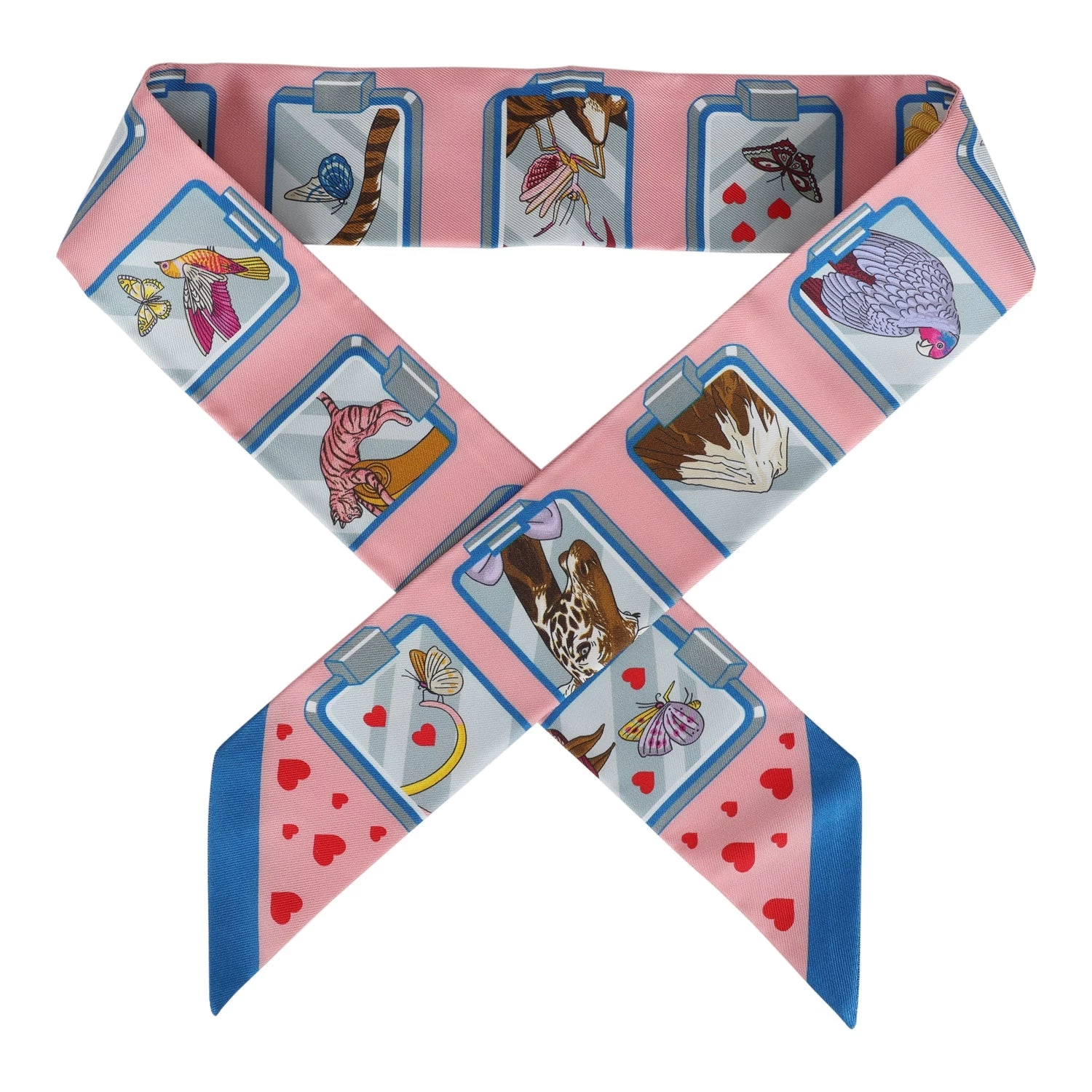 Hermes “Story” Rose, Bleu, Jaune Silk Twilly in a pink multi colorway.