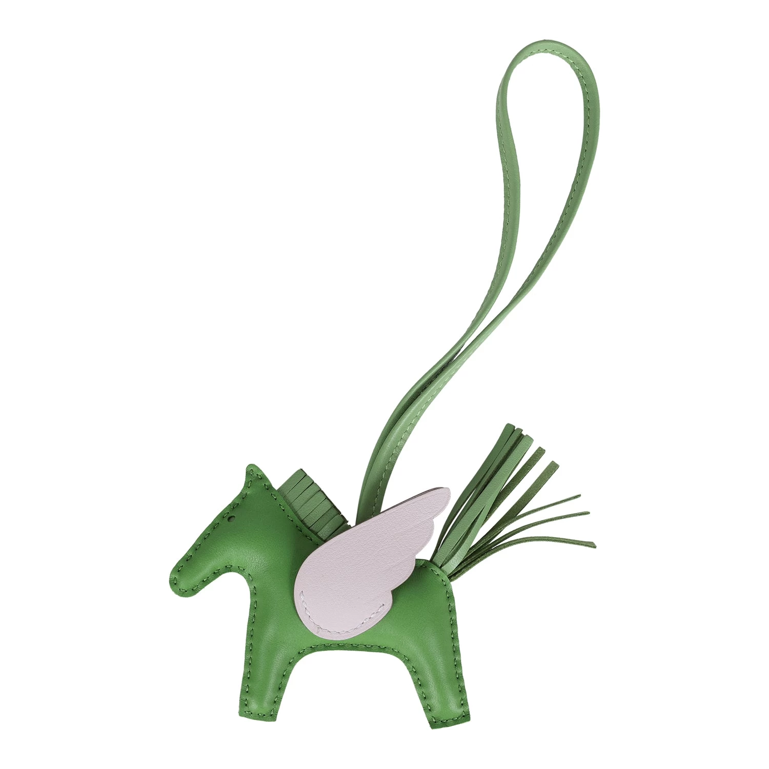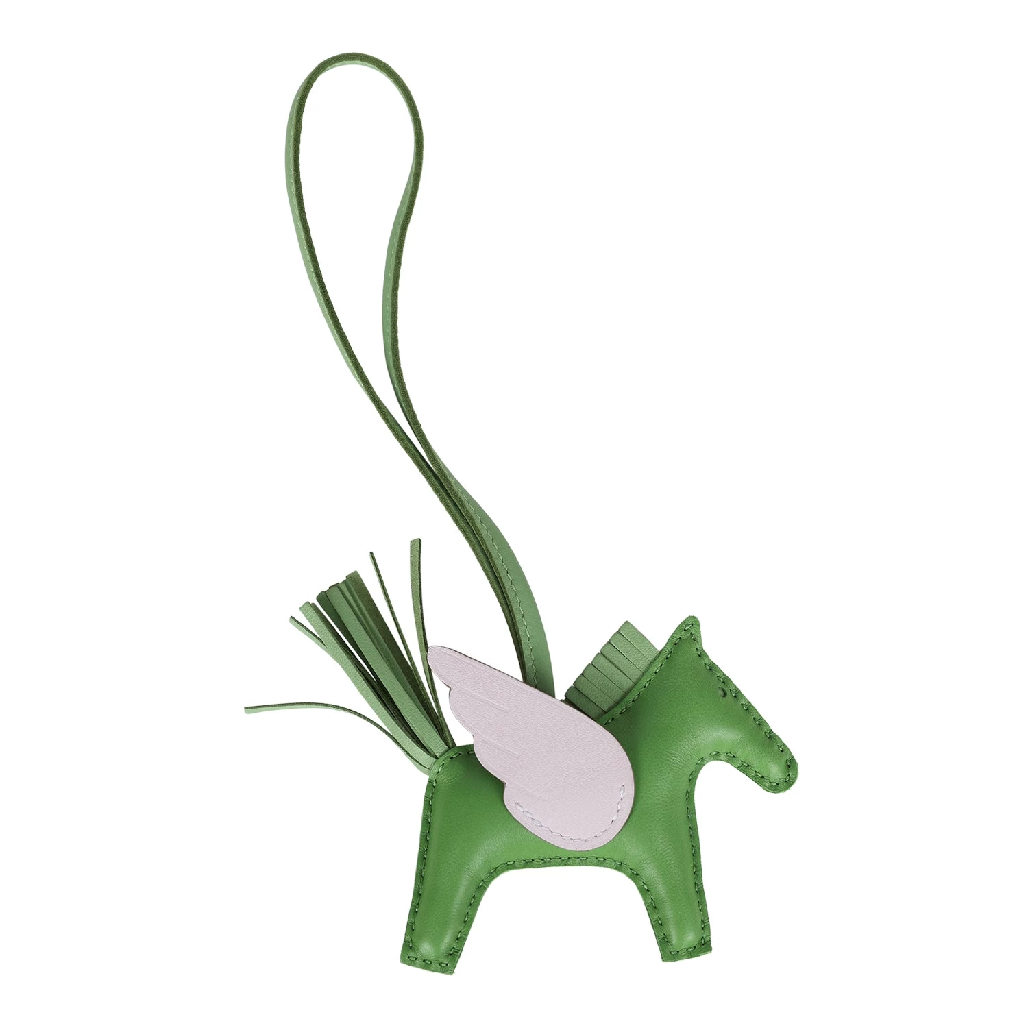 This Pegasus Rodeo bag charm is in Vert Yucca Milo lambskin leather and is accented with a Vert Criquet mane, tail and Mauve Pale wings.