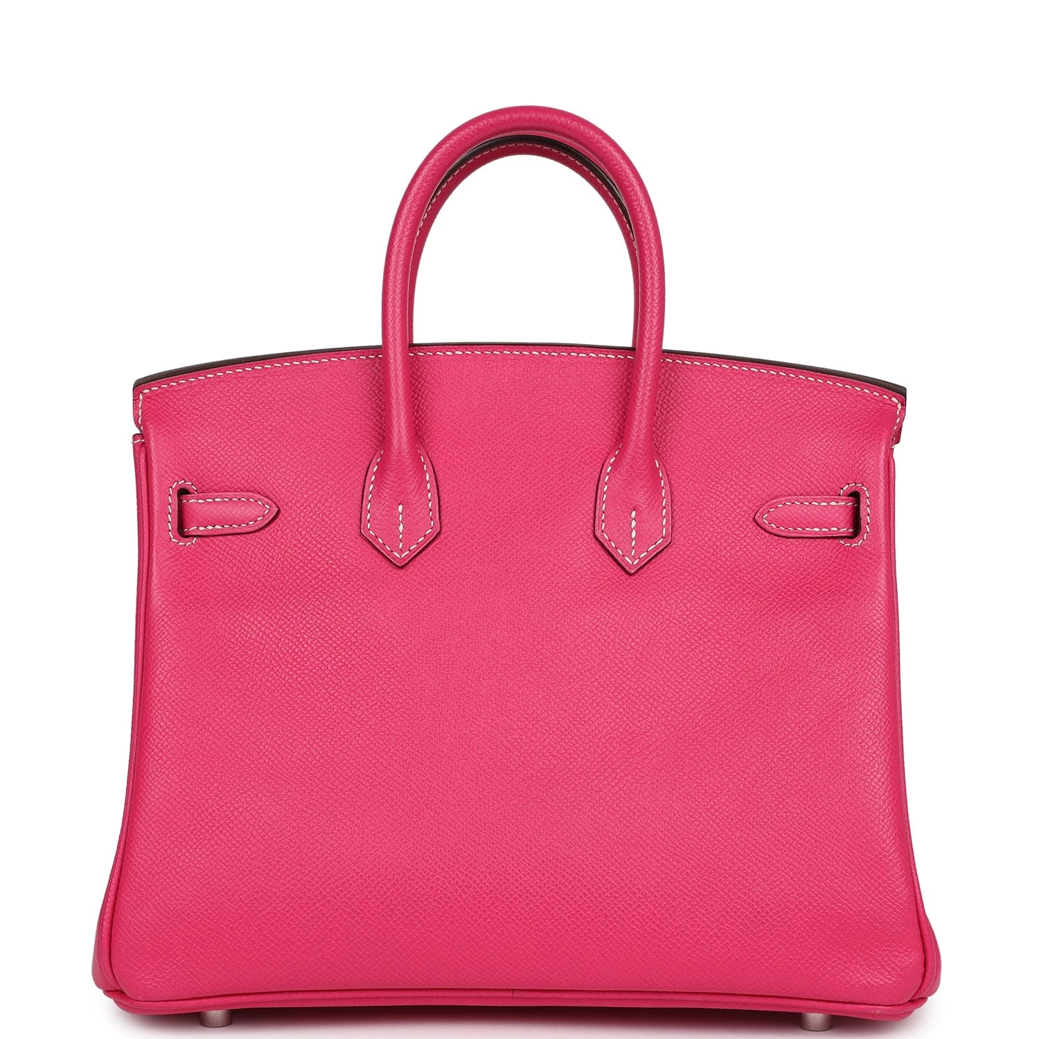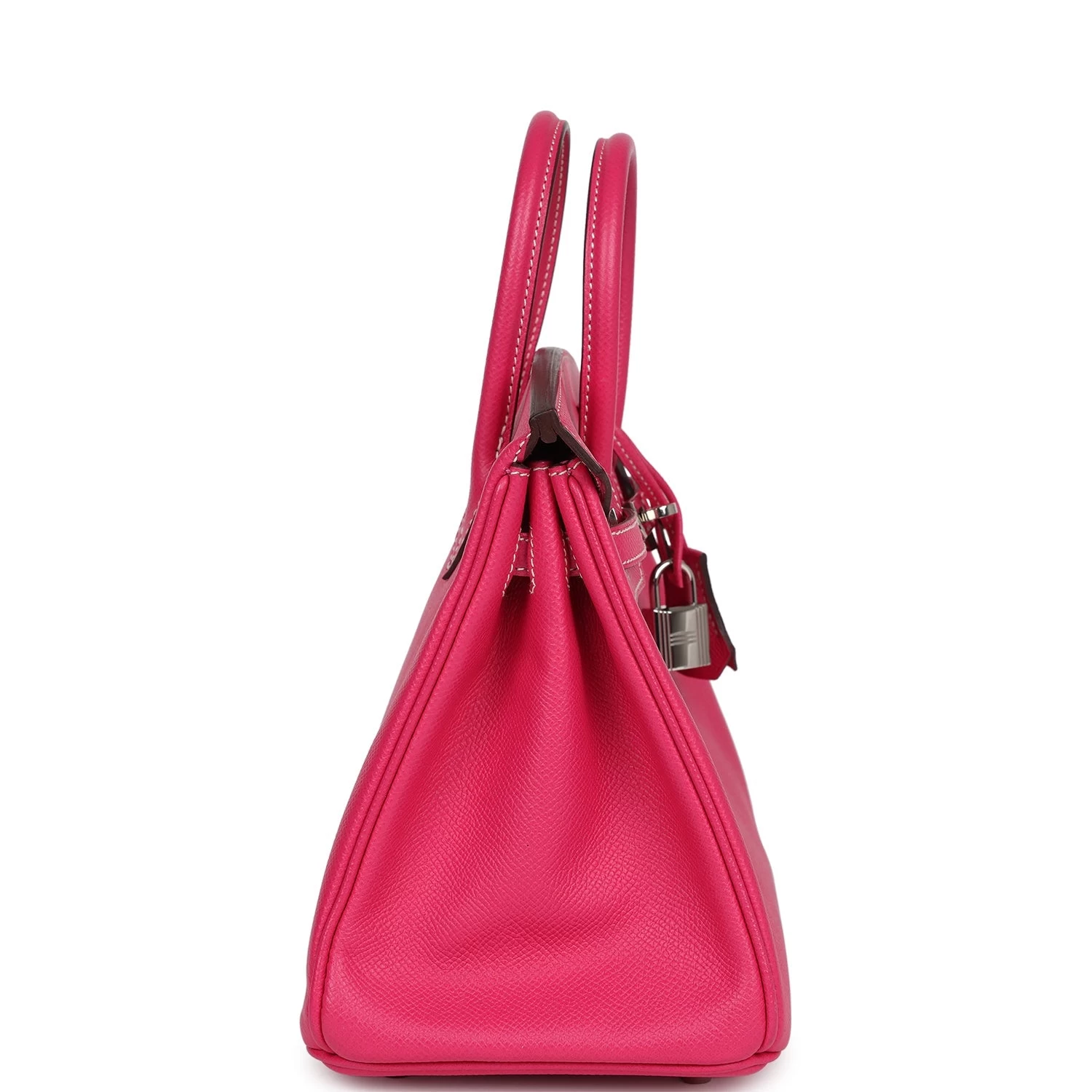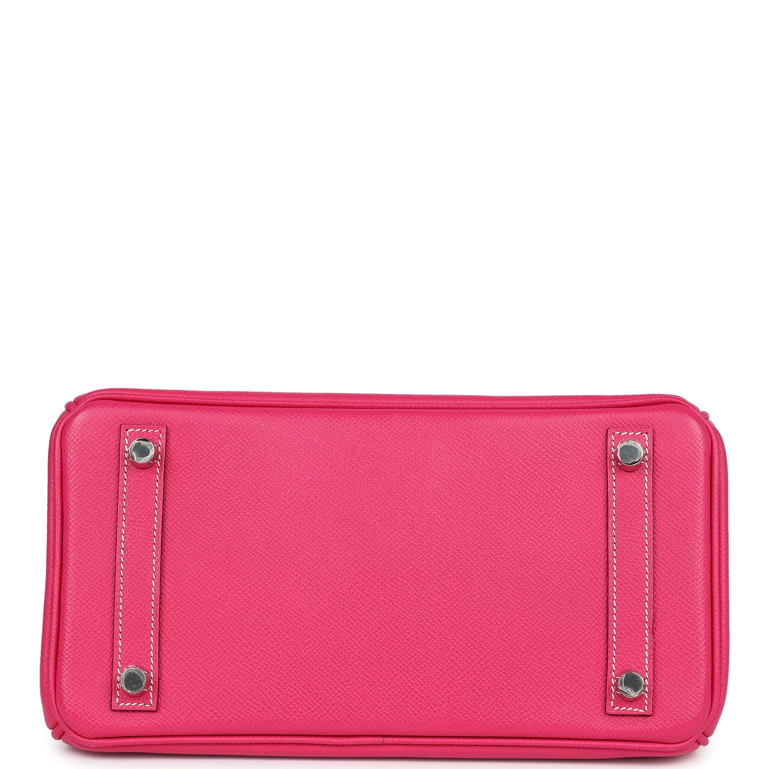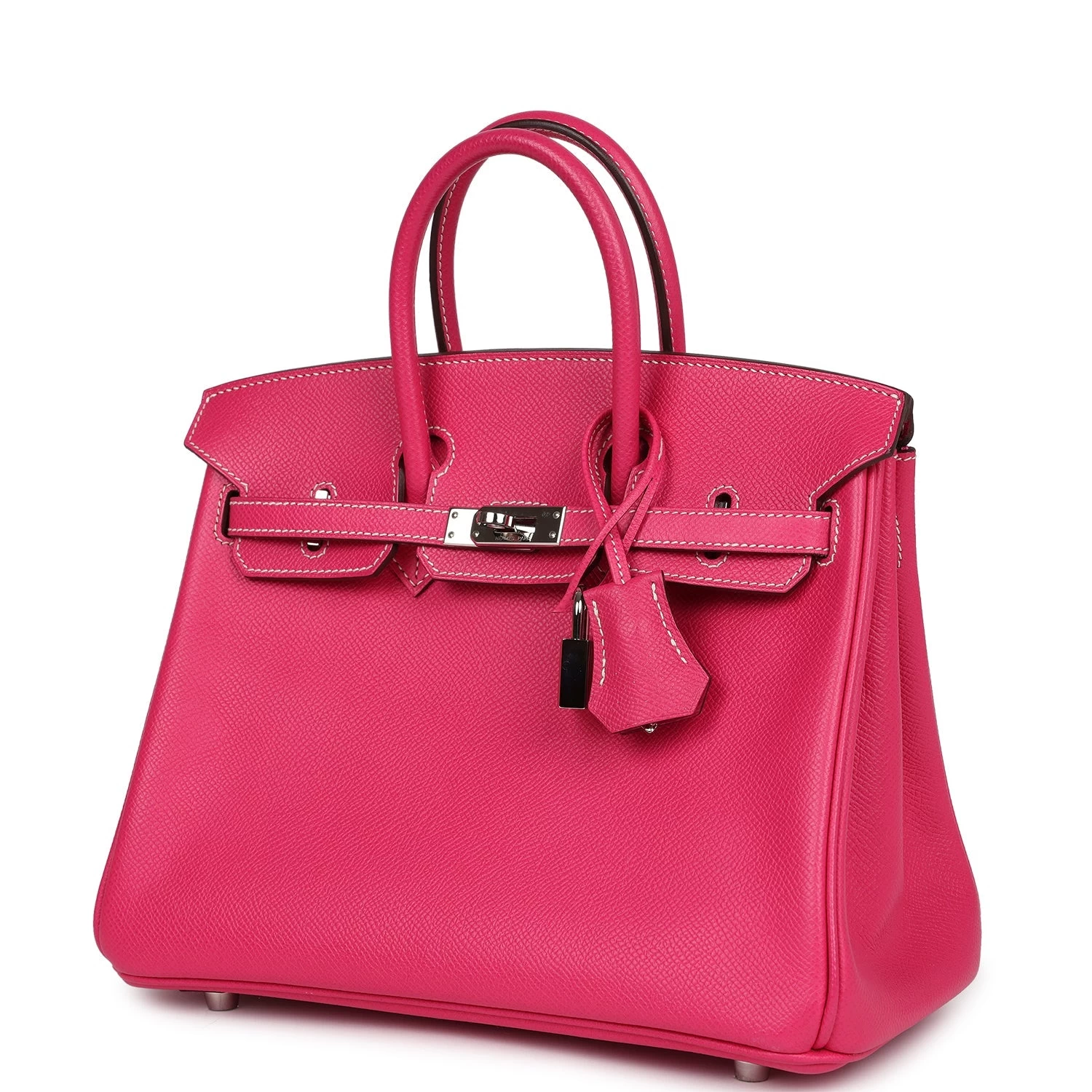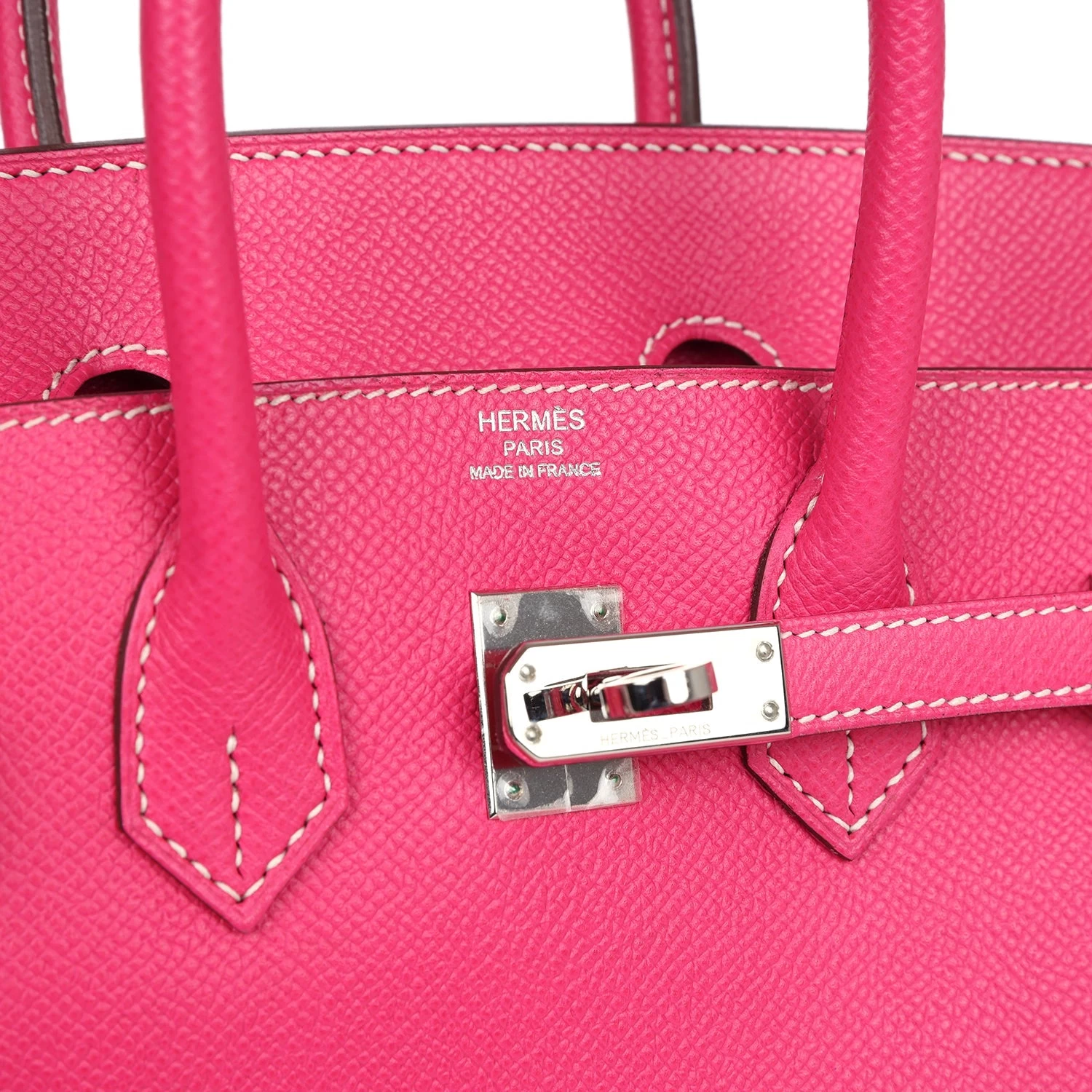 This Birkin is of Rose Tyrien epsom leather with palladium hardware and features contrast white stitching, a front toggle closure, a clochette with lock and two keys, and double rolled handles.