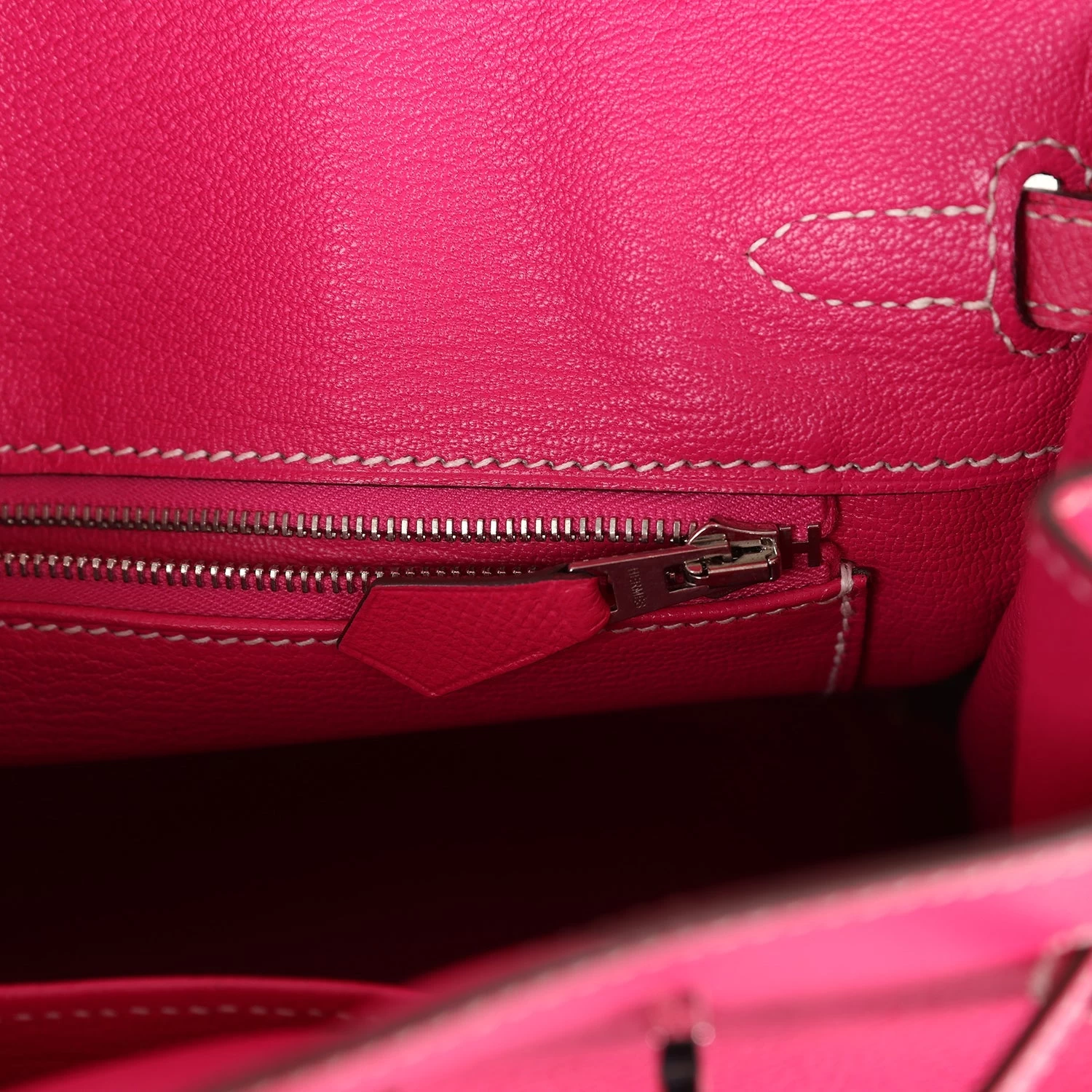 The interior is lined with Rose Tyrien chevre and has one zip pocket with an Hermes engraved zipper pull and an open pocket on the opposite side.