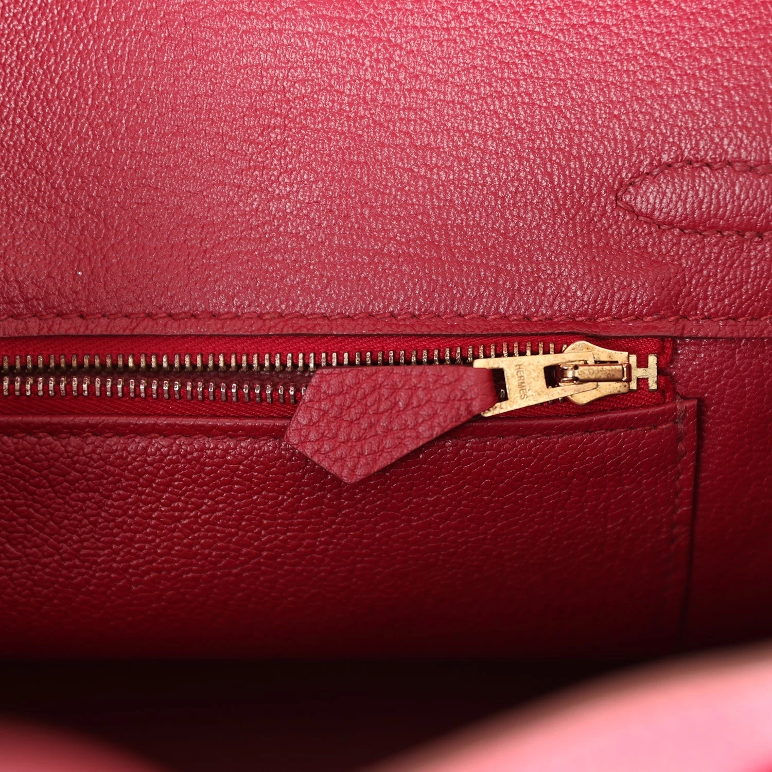 The interior is lined with Rubis chevre and has one zip pocket with an Hermes engraved zipper pull and an open pocket on the opposite side.