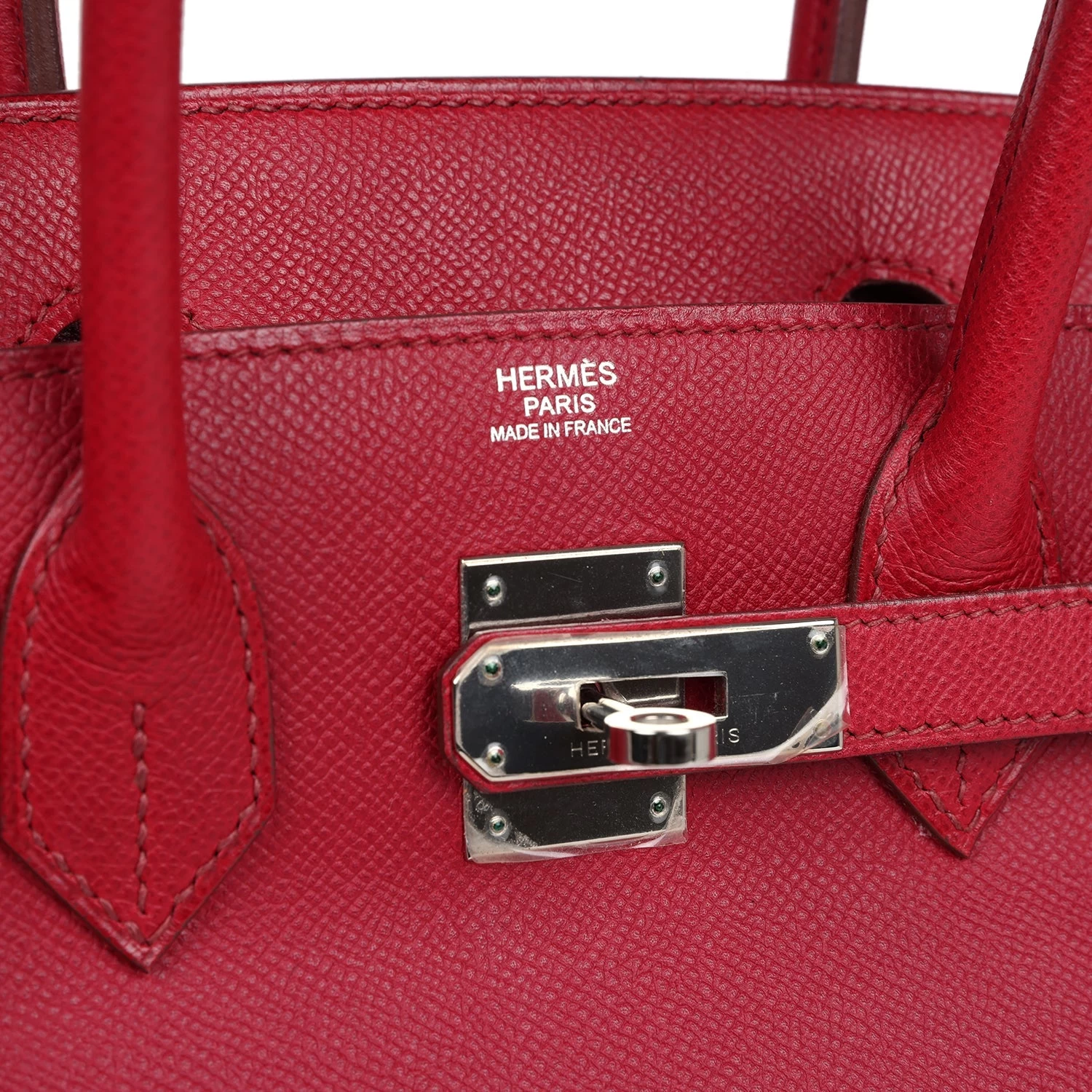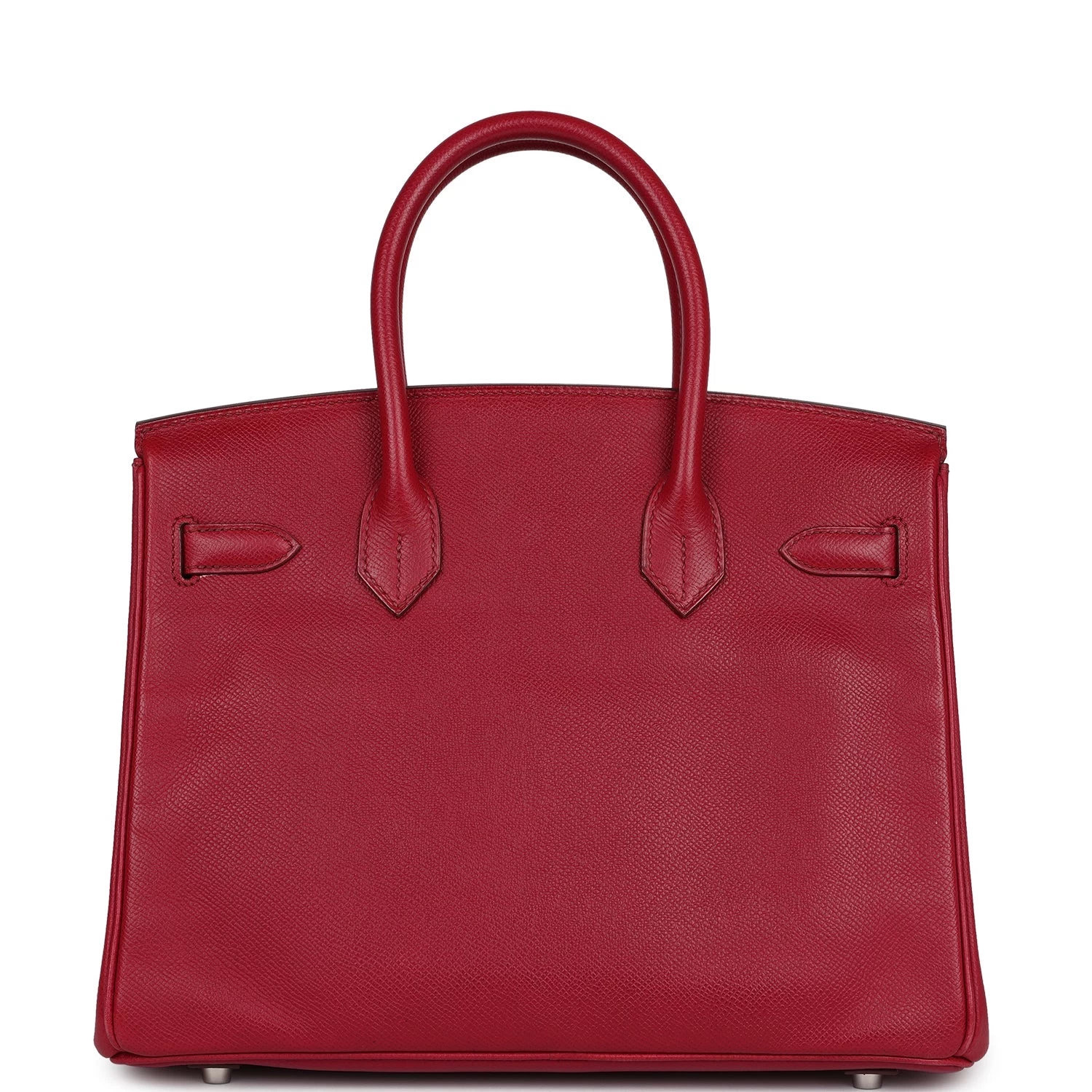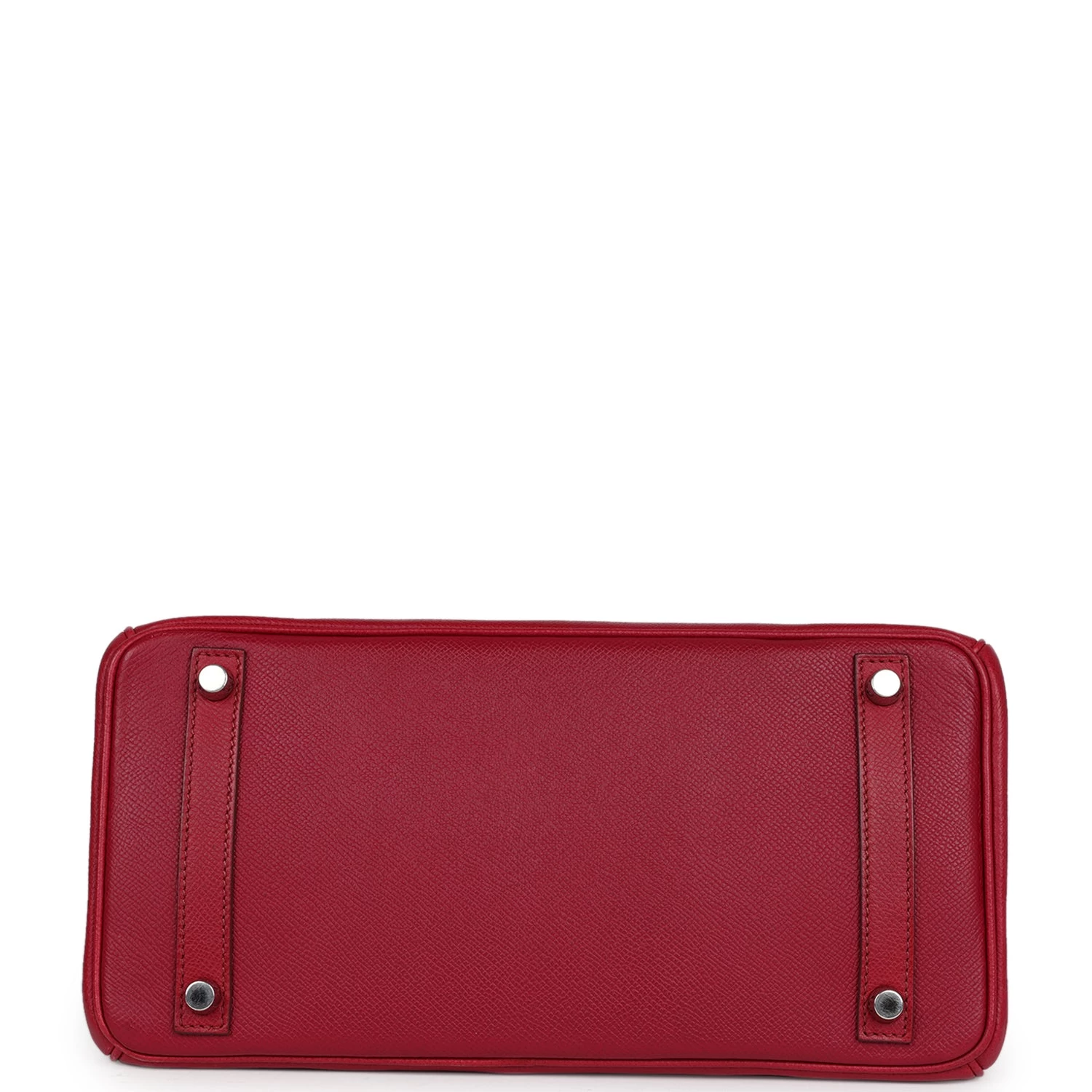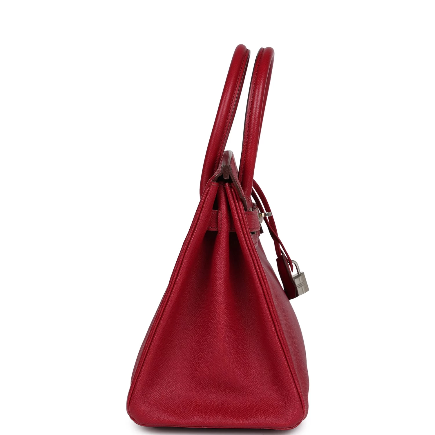 This Birkin is in Rubis epsom leather with palladium hardware and has tonal stitching, front flap, two straps with center toggle closure, clochette with lock and two keys, and double rolled handles.