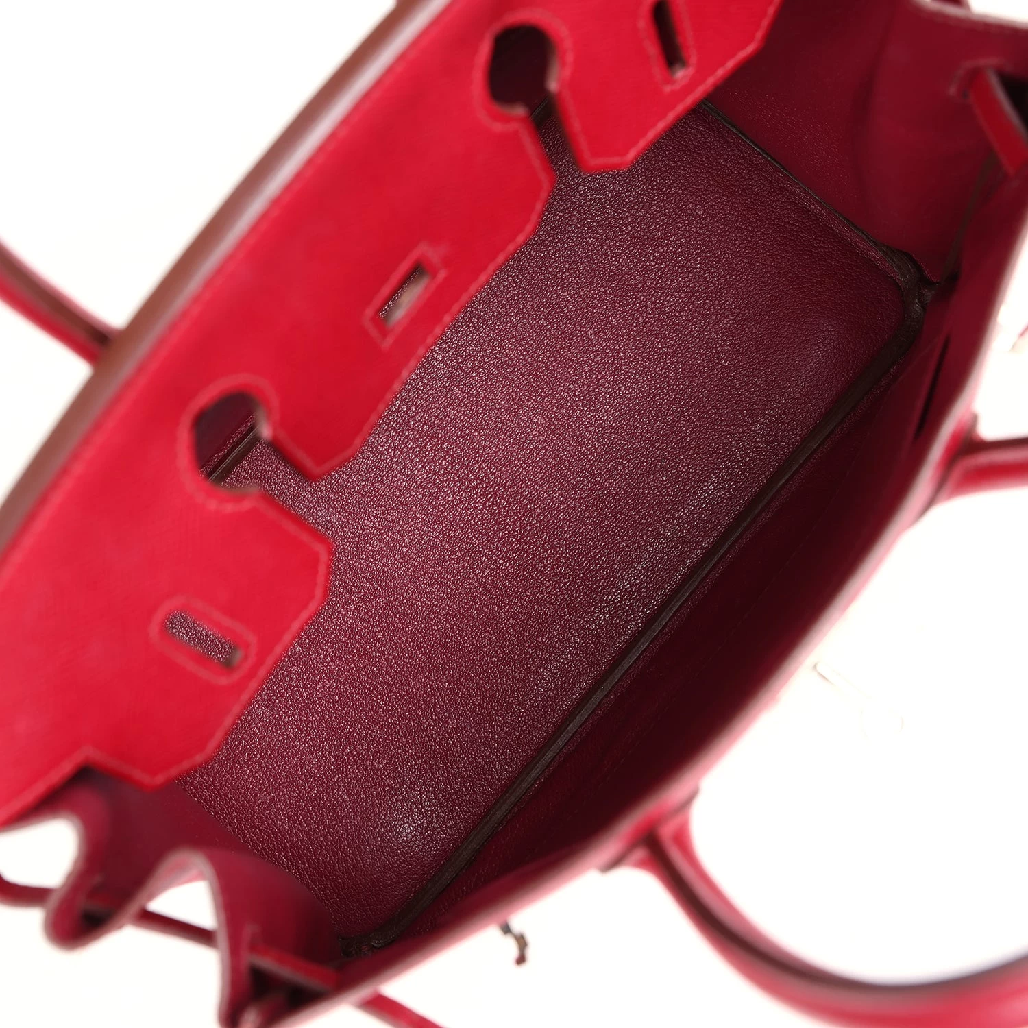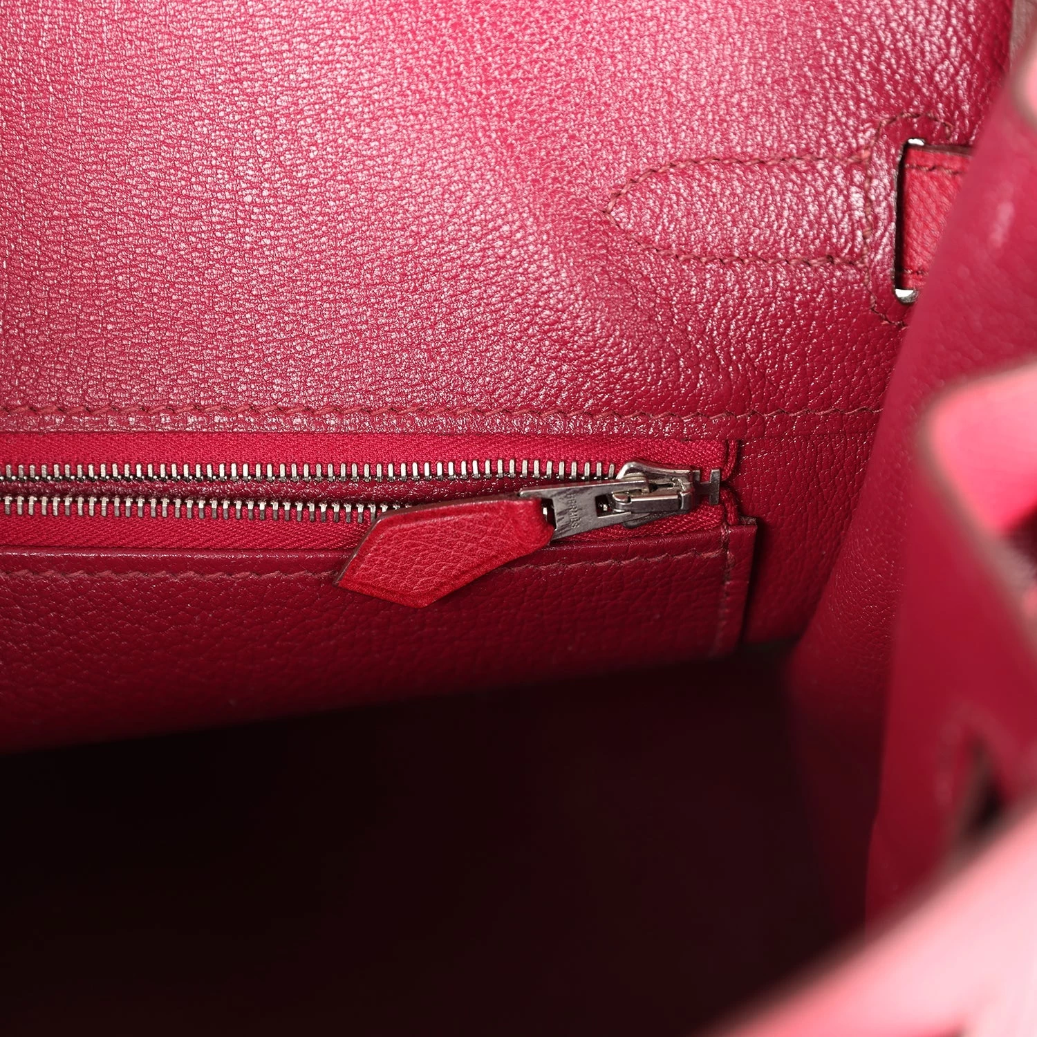 The interior is lined with Rubis chevre and has one zip pocket with an Hermes engraved zipper pull and an open pocket on the opposite side.