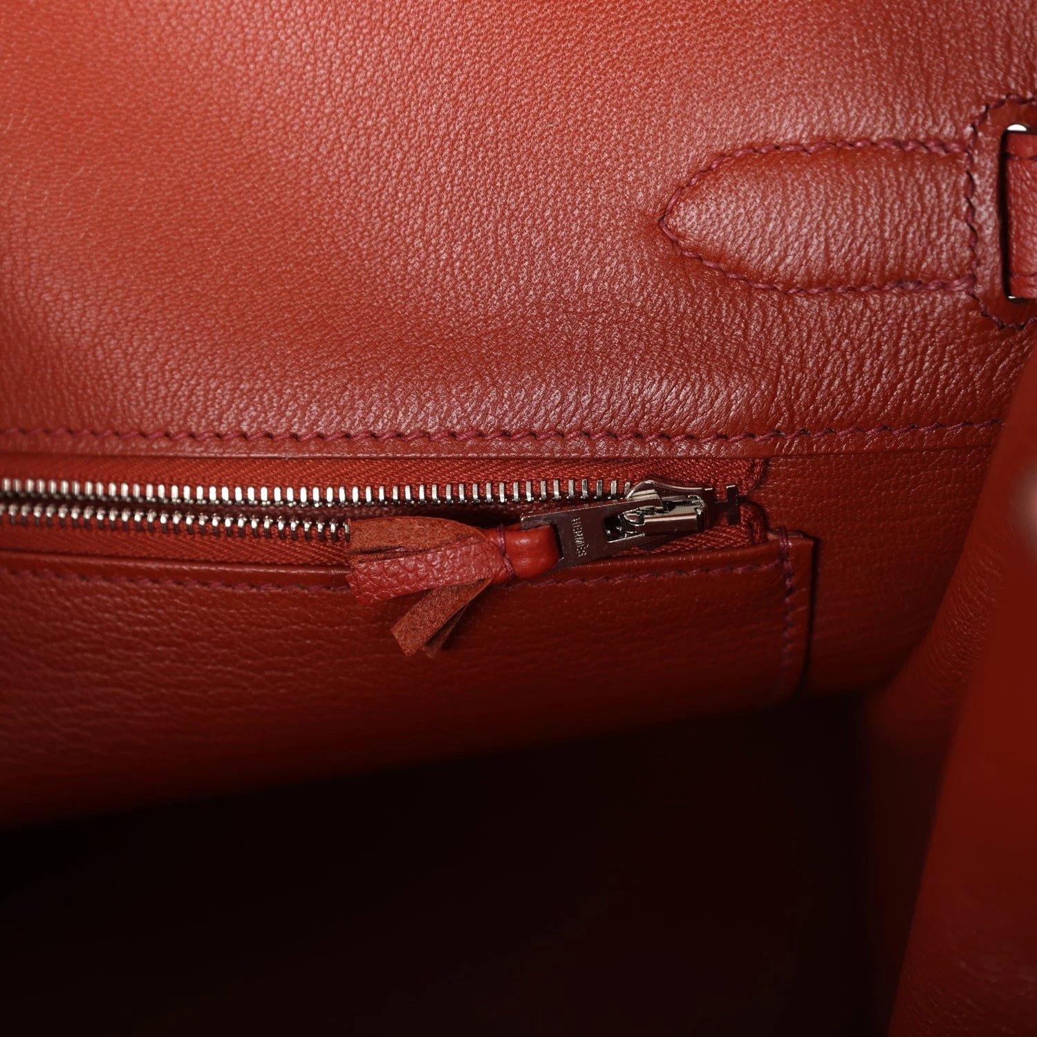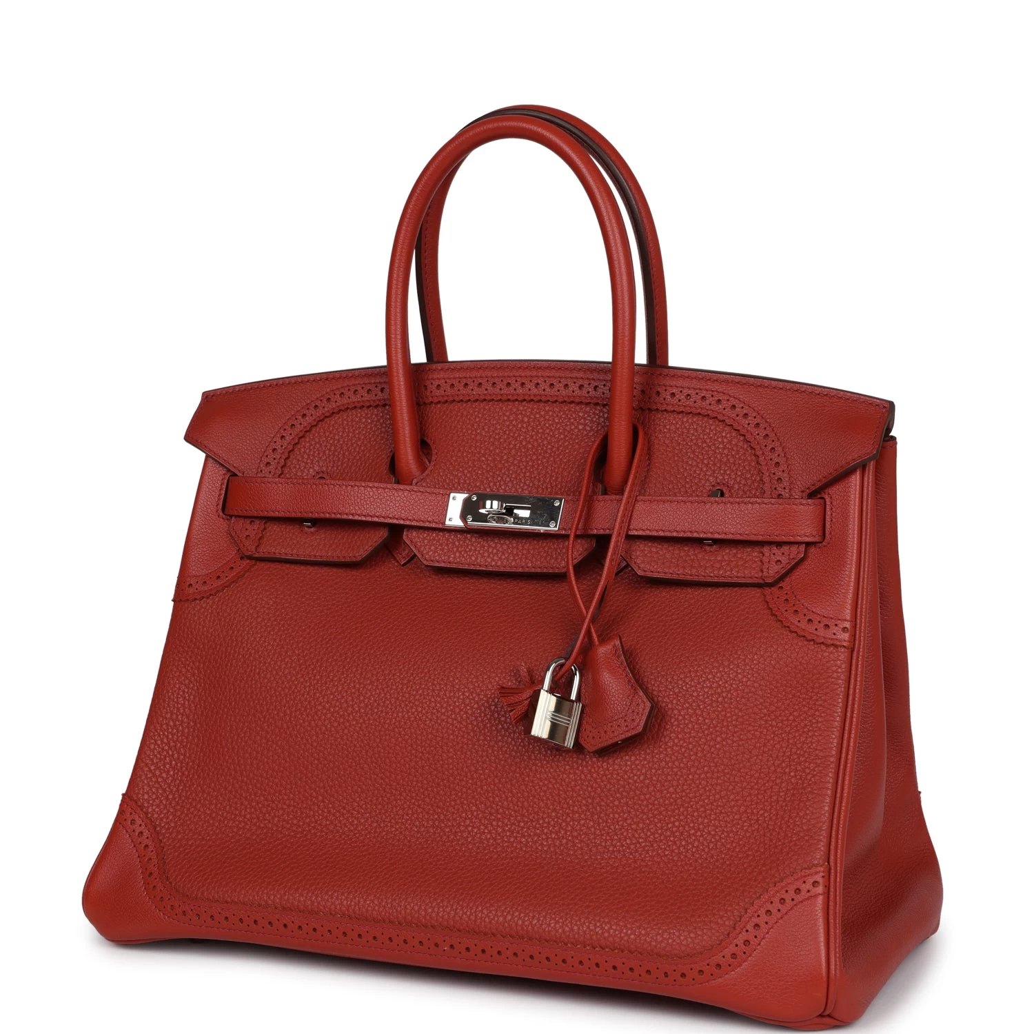 This Ghillies Birkin 35 is in Brique evercolor and Brique clemence with palladium hardware and has tonal stitching, front flap, two straps with center toggle closure, clochette with lock and two keys, and double rolled handles.