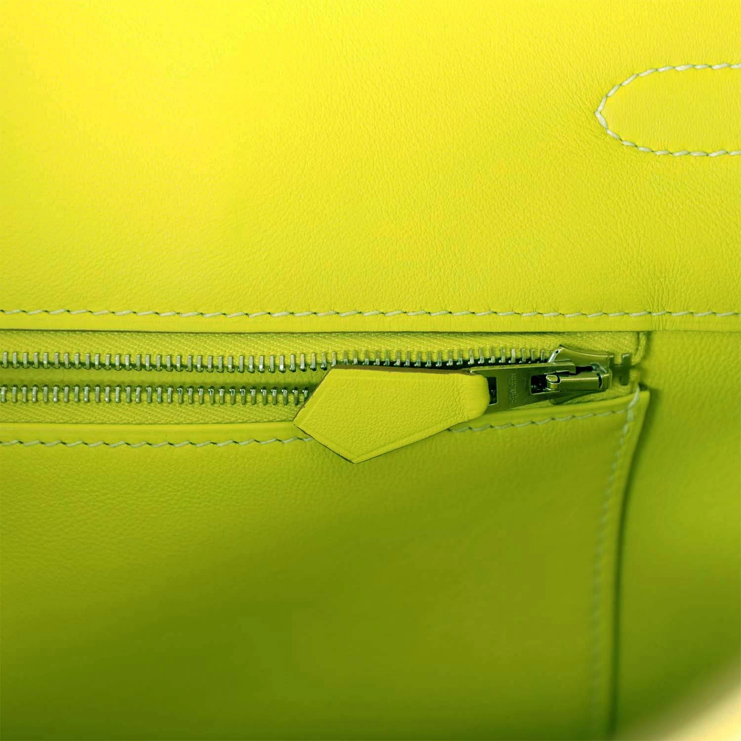 The interior is lined with Kiwi chevre and has one zip pocket with an Hermes engraved zipper pull and an open pocket on the opposite side.