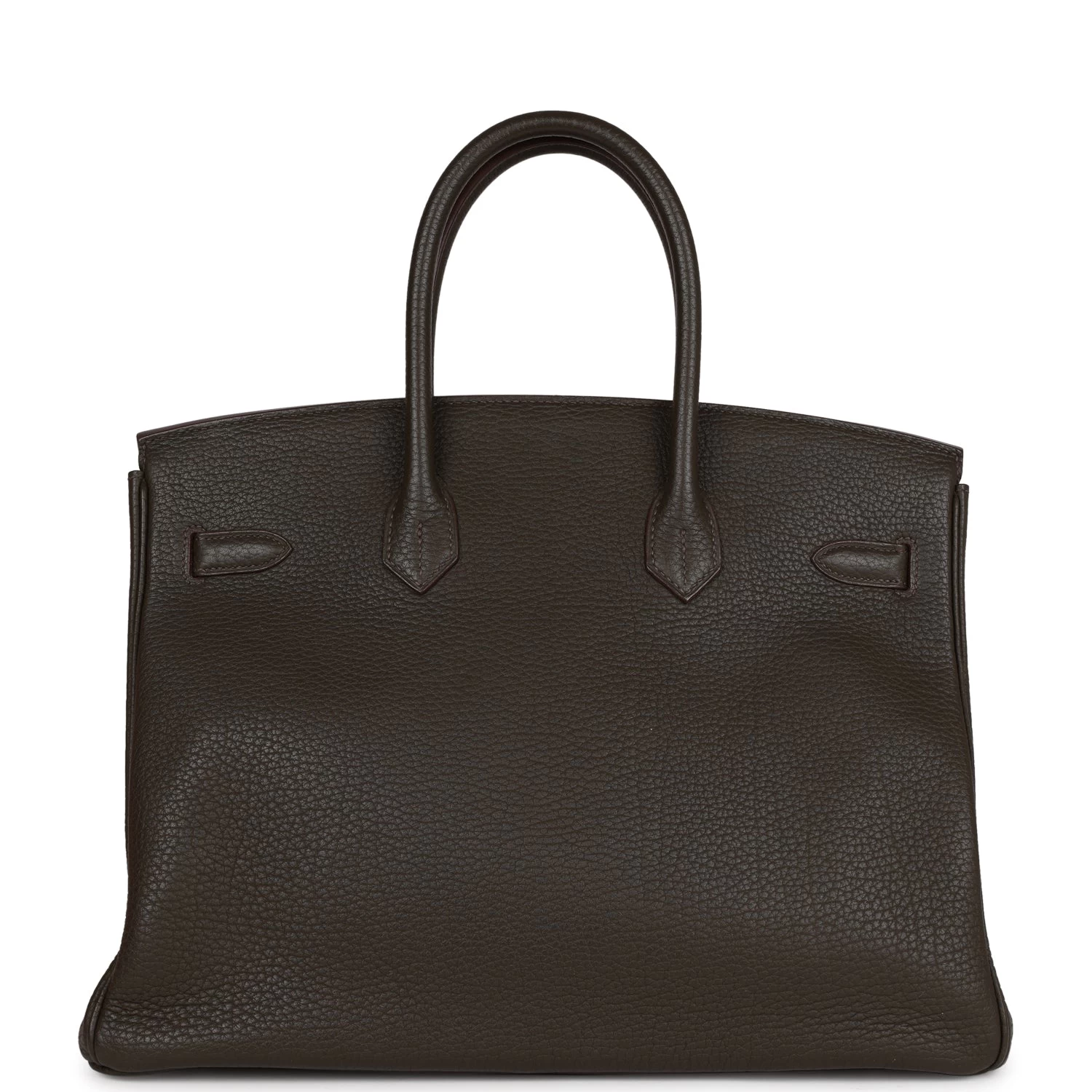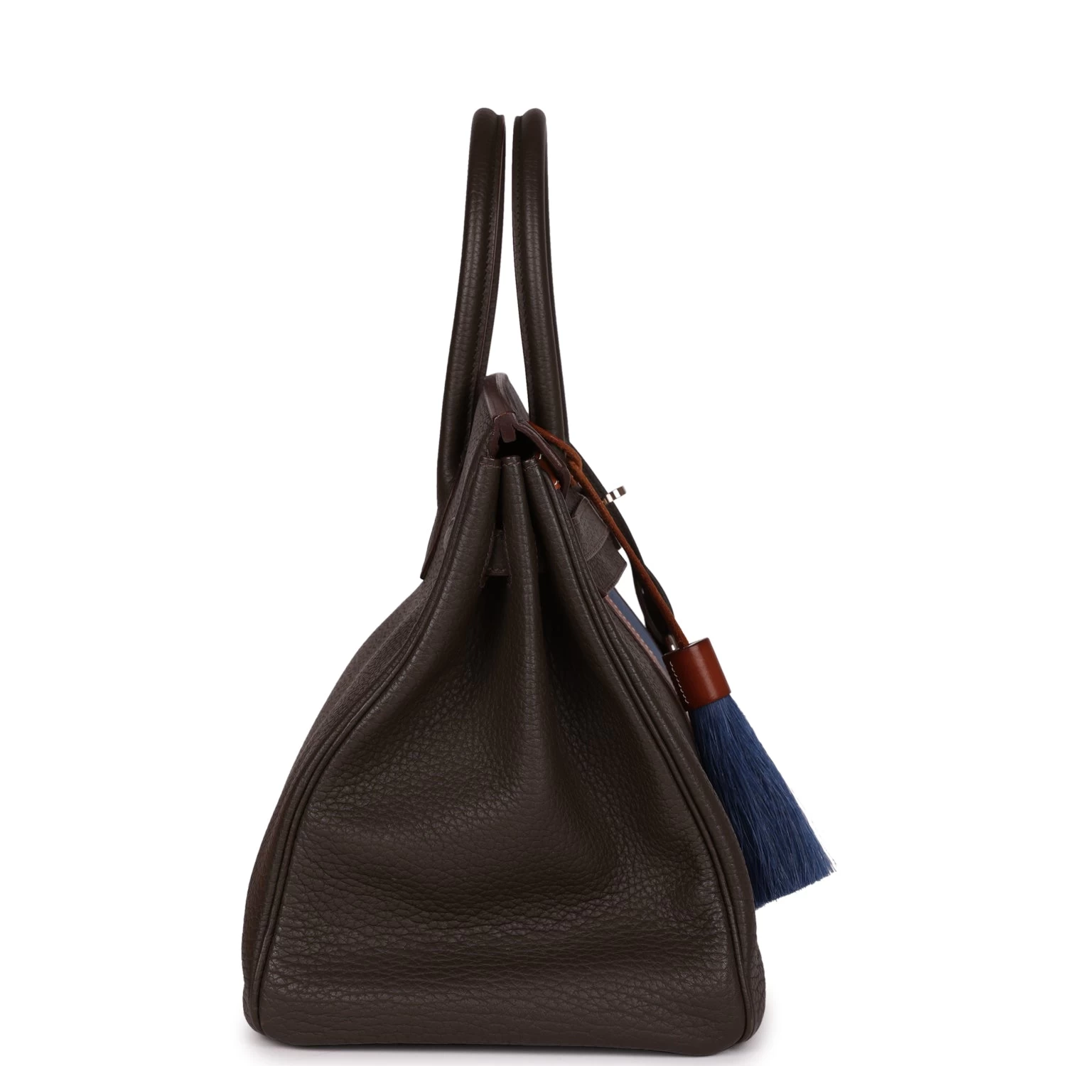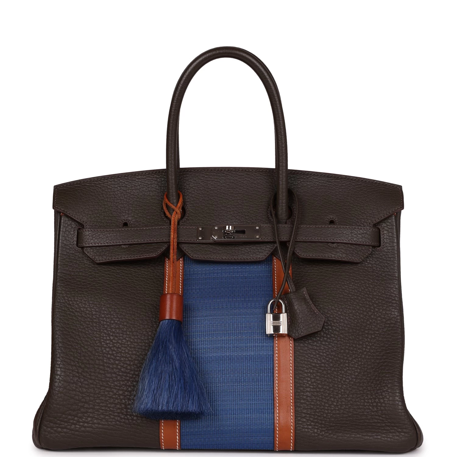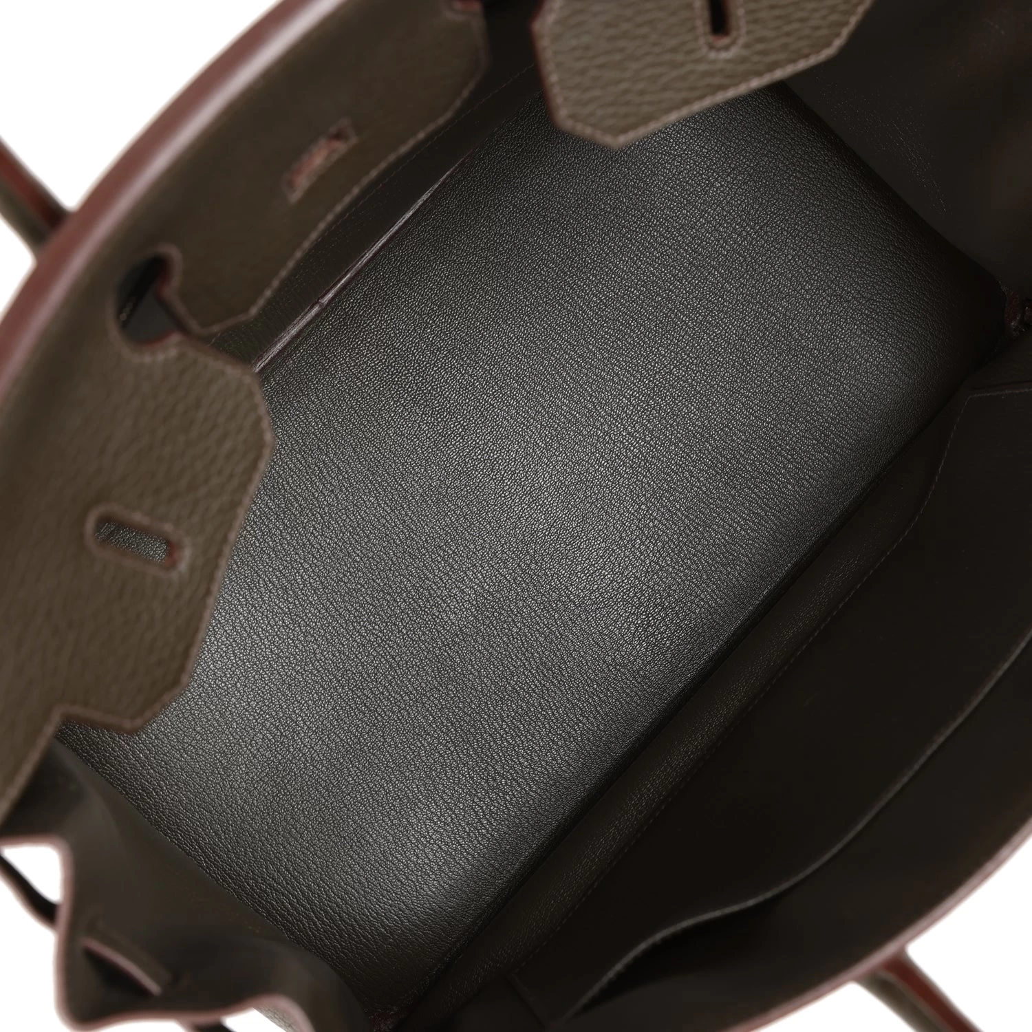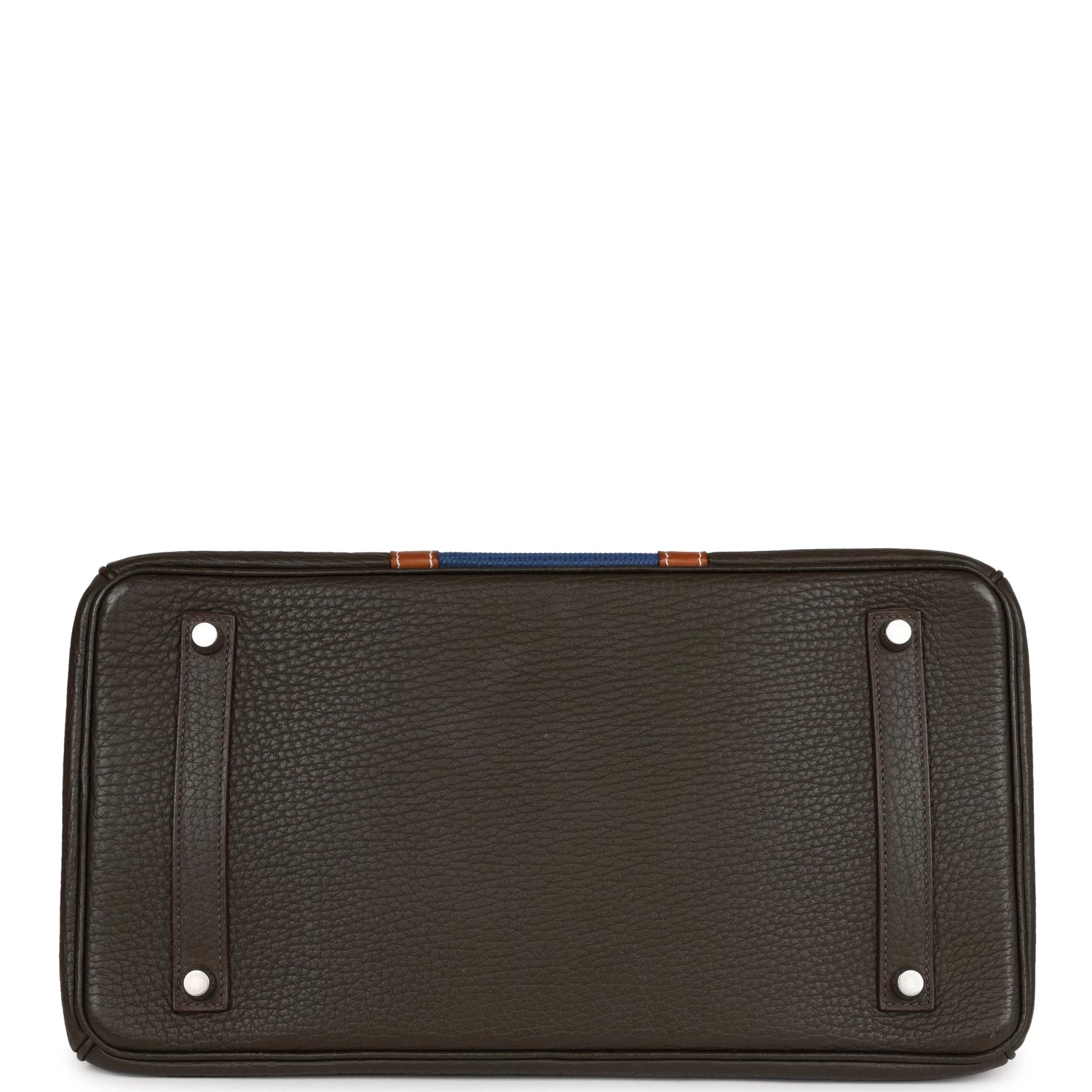 This Birkin Club 35 is in Vert Bronze, Bleu Thalassa, and Fauve with Barenia Fjord & Ottomane leather and palladium hardware. Features Fauve Barenia leather trim along Bleu Thalassa Ottomane trim down center front of bag, has tonal and contrast stitching, front flap, two straps with front toggle closure, clochette with lock and two keys, and double rolled handles. This also comes with the matching, removable bag charm.