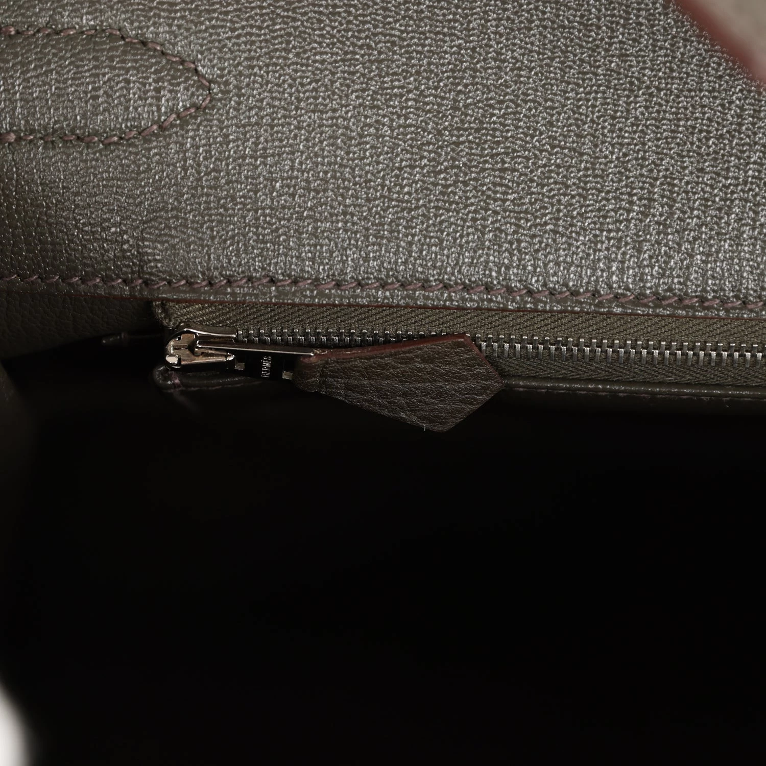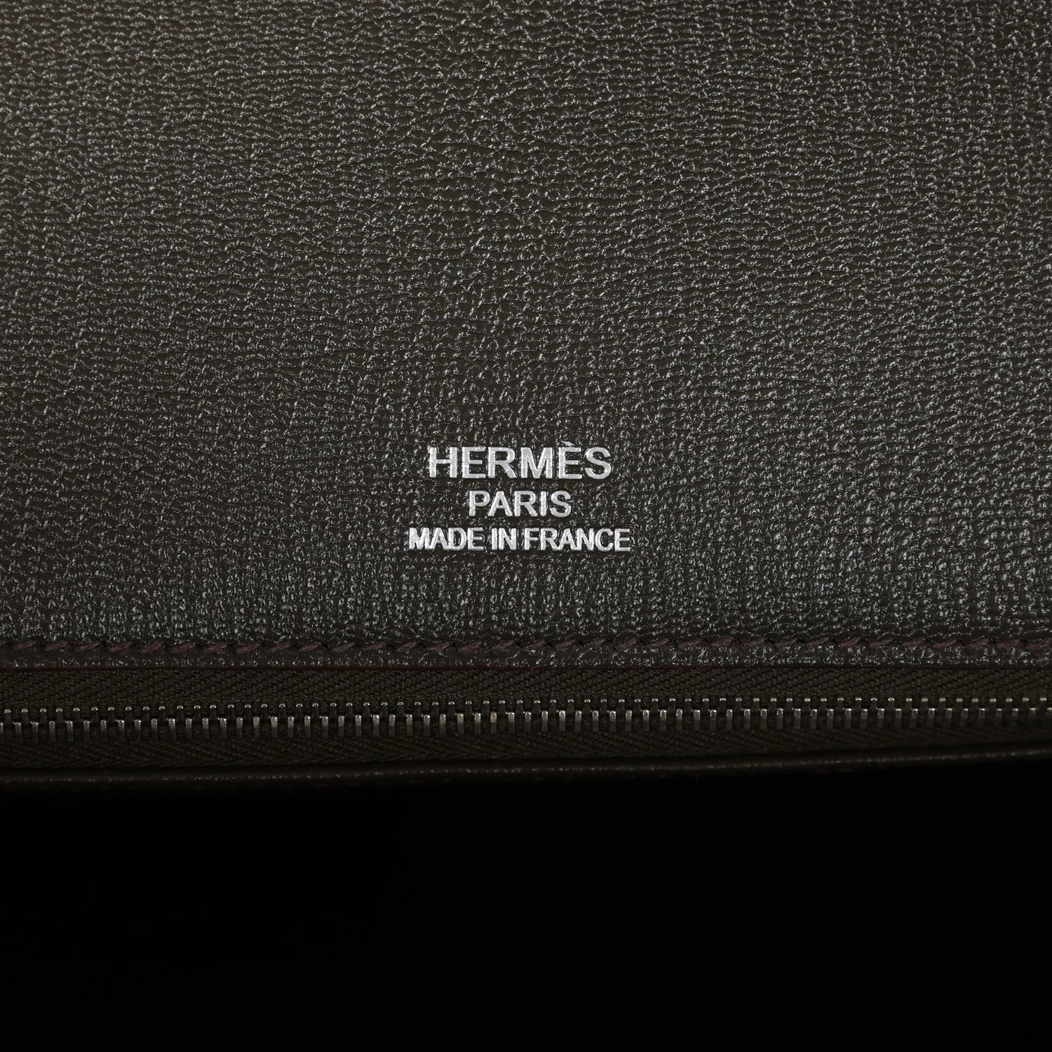 The interior is lined in Vert Bronze Chevre leather and has one zip pocket with an Hermes engraved zipper pull and an open pocket on the opposite side.