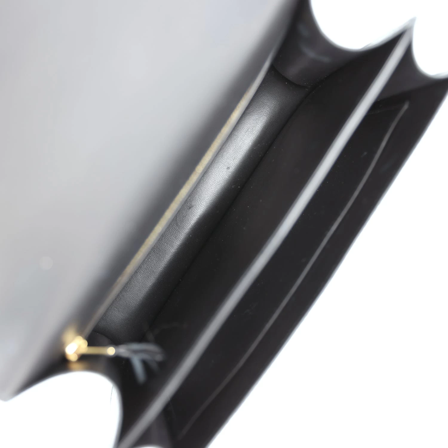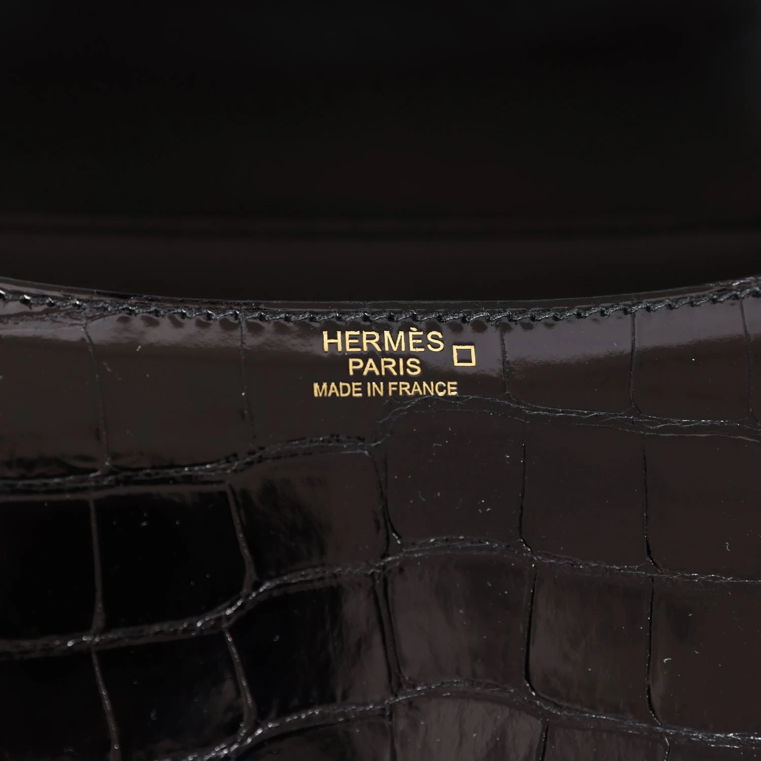 This Constance is of Black shiny alligator with rose gold hardware and features tonal stitching, a “H” snap lock closure, and an adjustable shoulder strap.