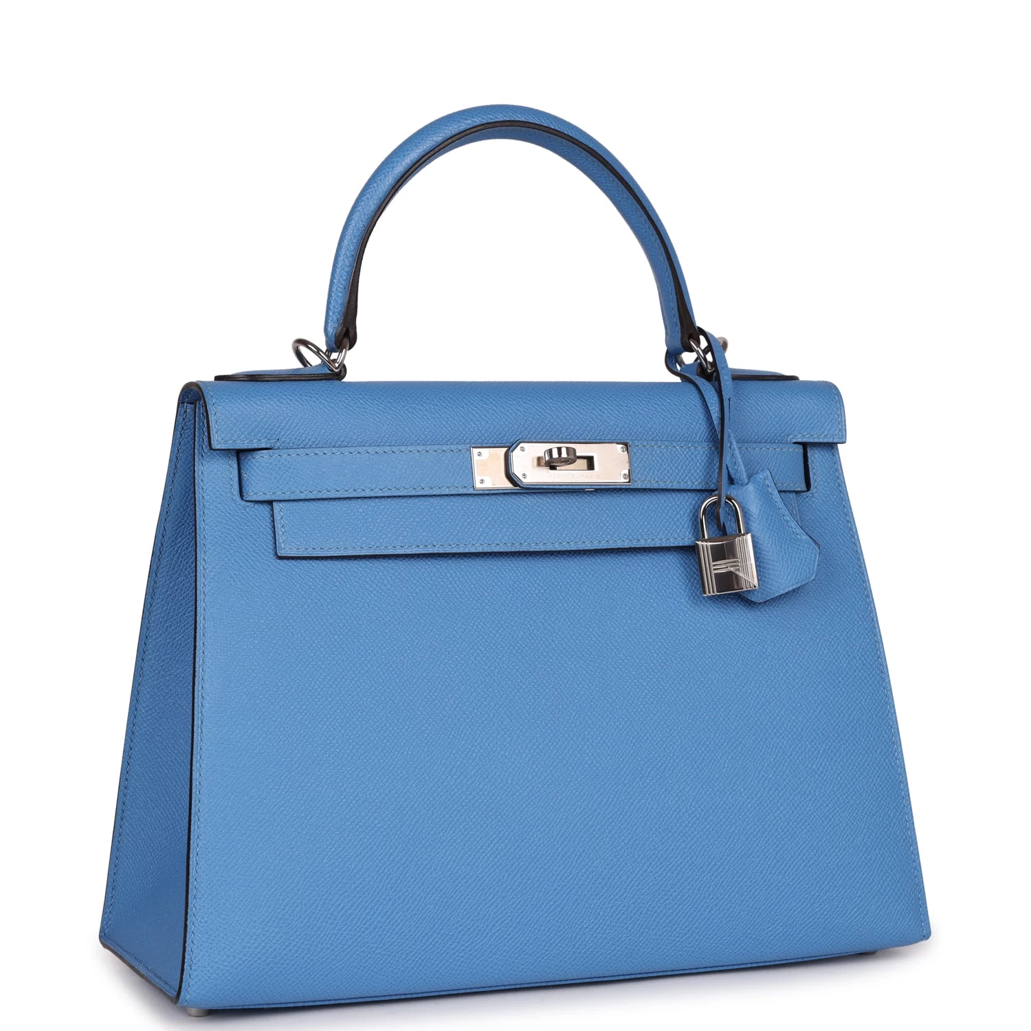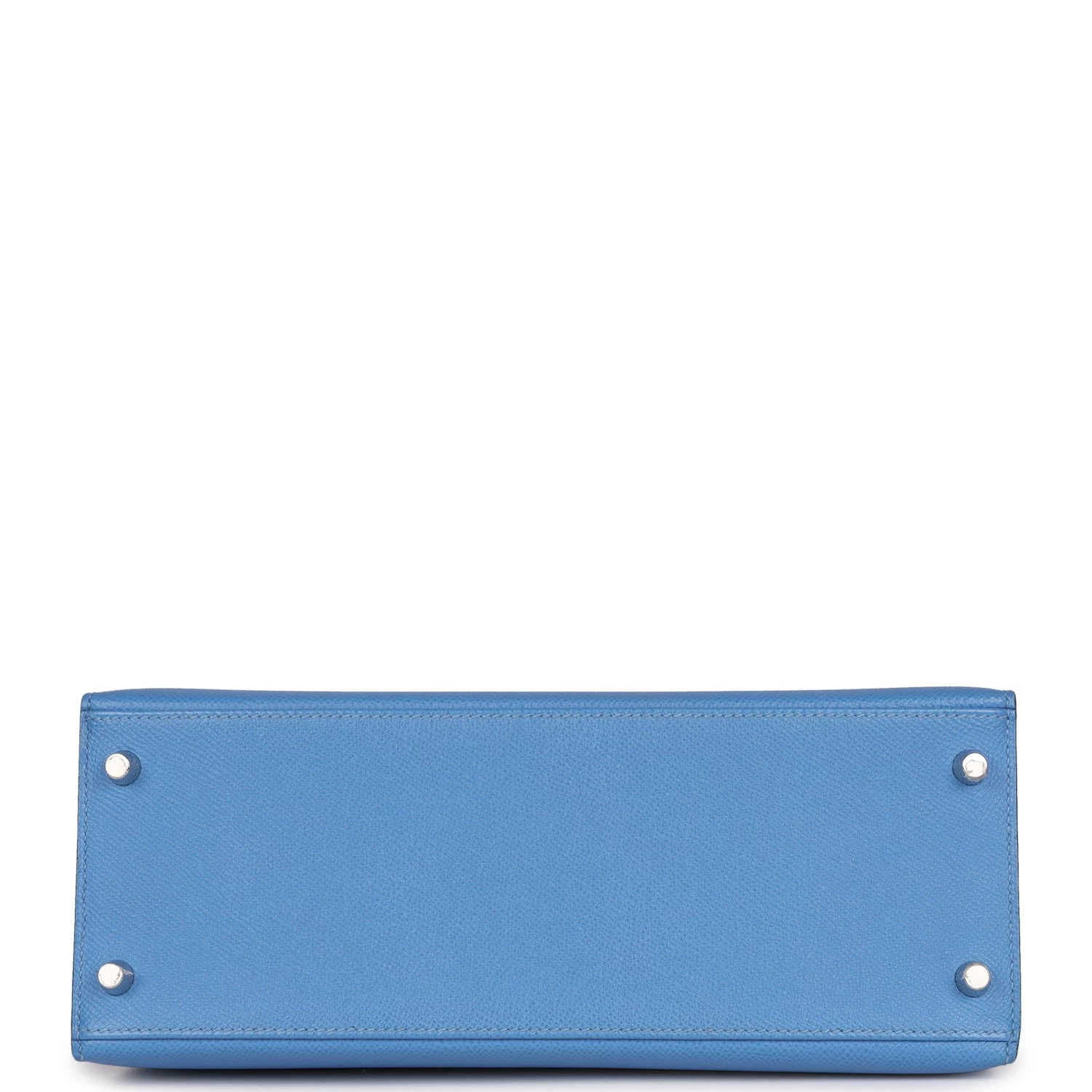 This Kelly, in the Sellier style, is of Bleu Azur epsom leather with palladium hardware, features tonal stitching, a front toggle closure, a clochette with lock and two keys and a single rolled handle.