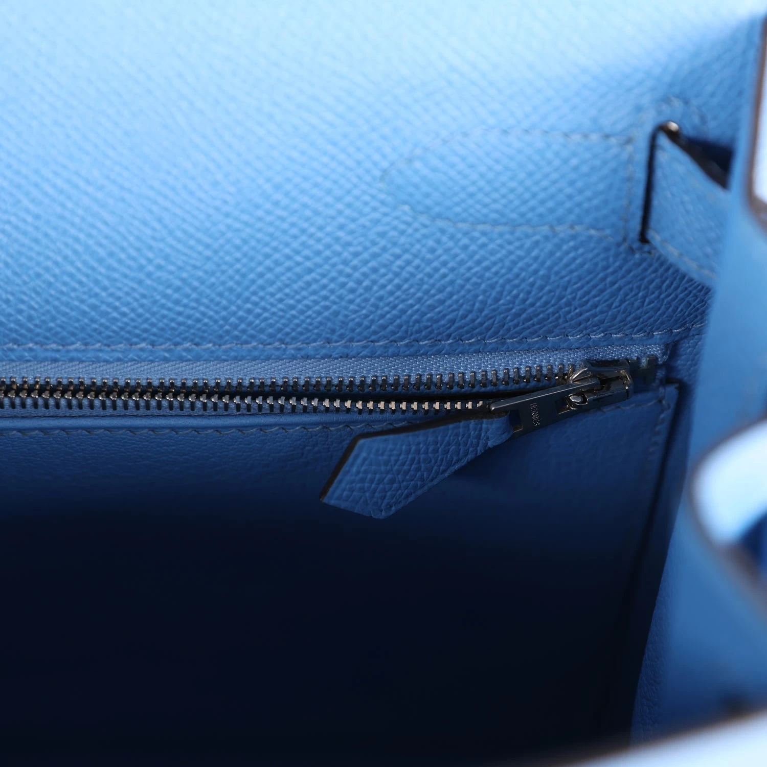 The interior is lined with Bleu Azur chevre and features one zip pocket with an Hermes engraved pull and two open pockets on the opposite side.