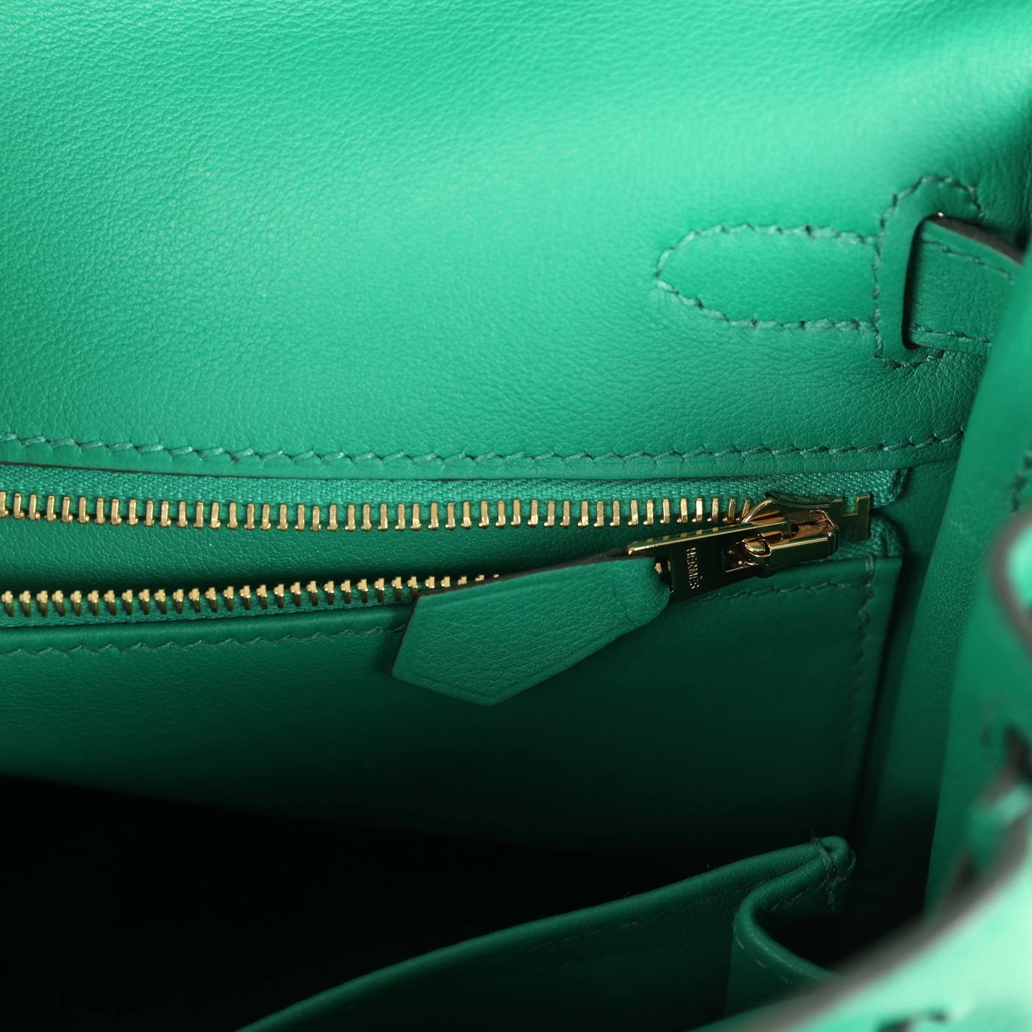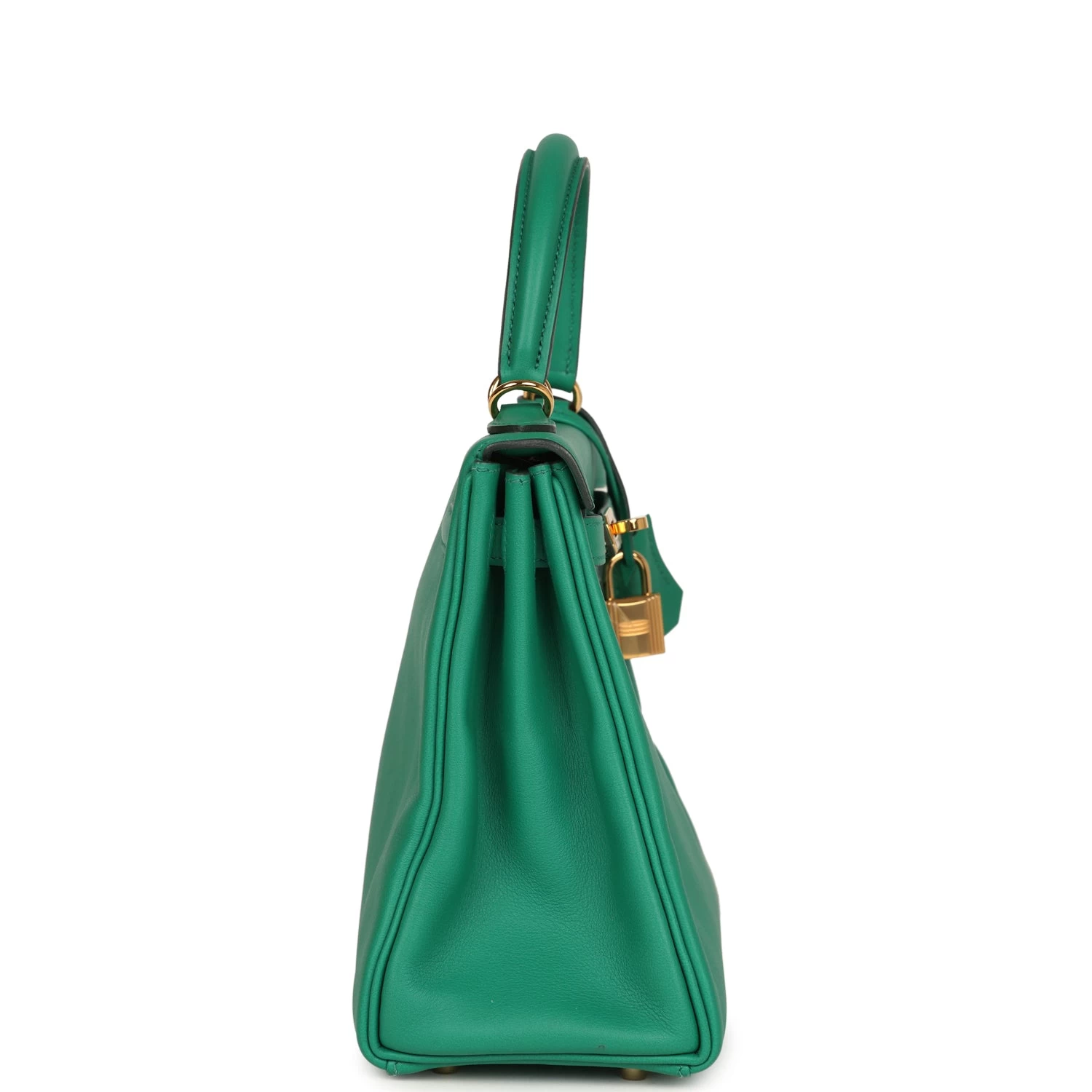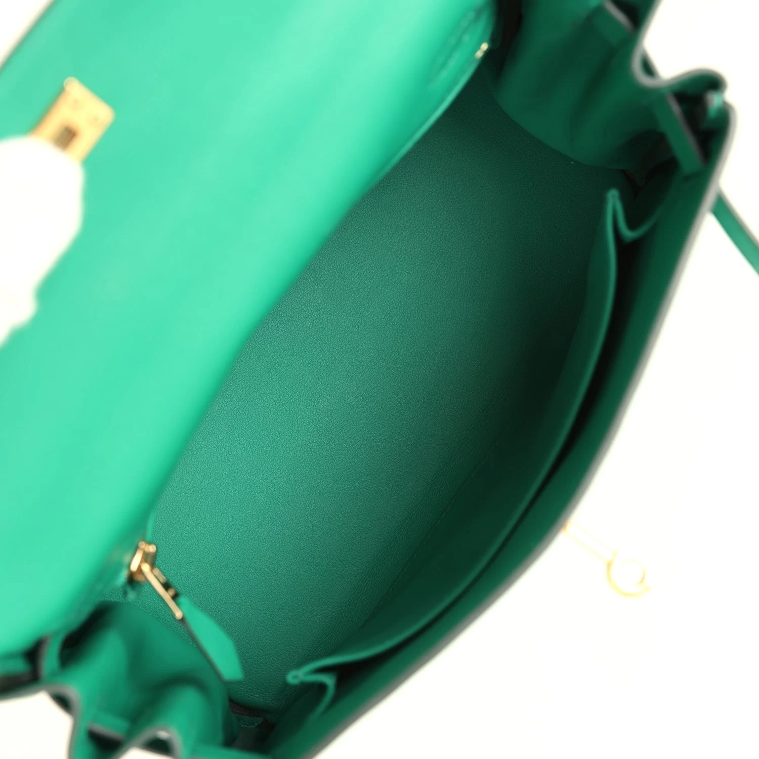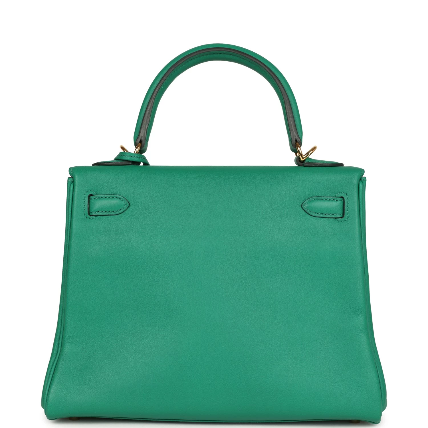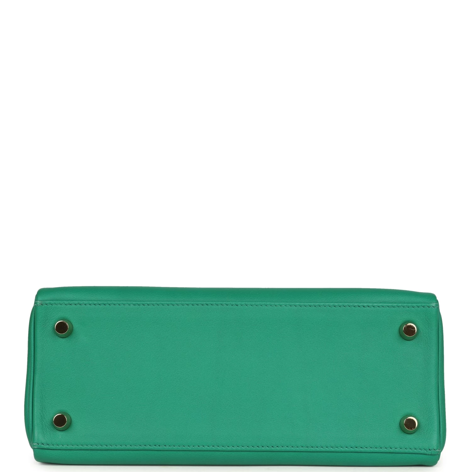 This Kelly, in the Retourne style, is in Vert Vertigo swift leather with gold hardware and has tonal stitching, two straps with front toggle closure, clochette with lock and two keys, single rolled handle and removable shoulder strap.
