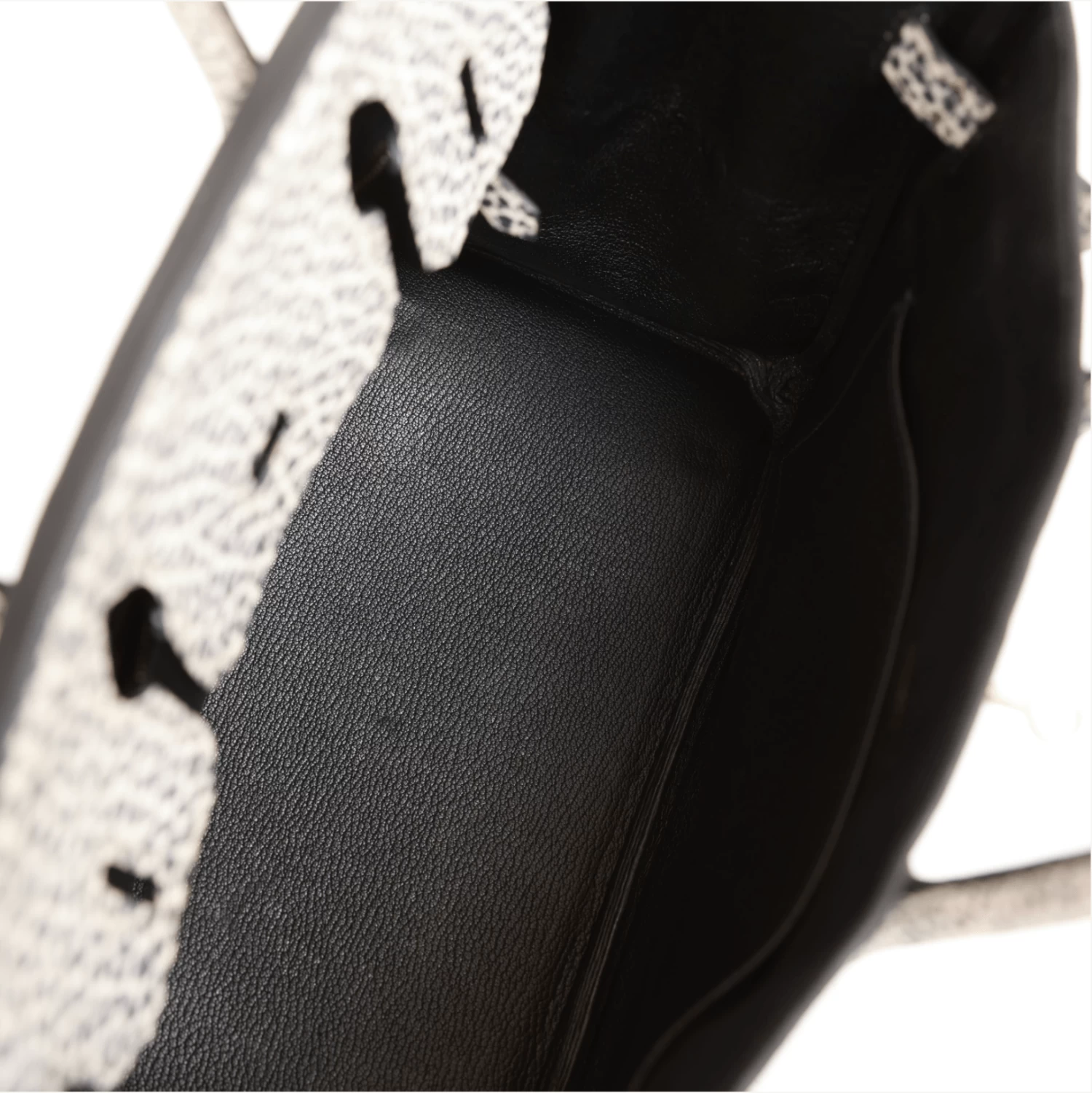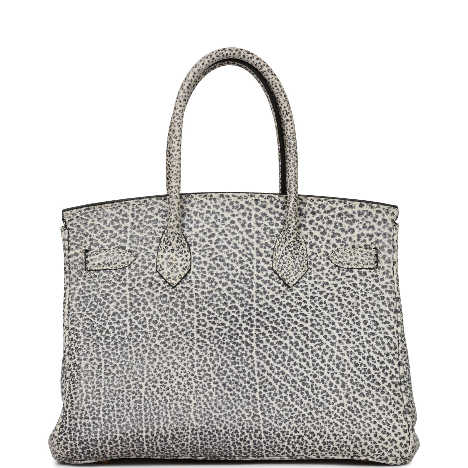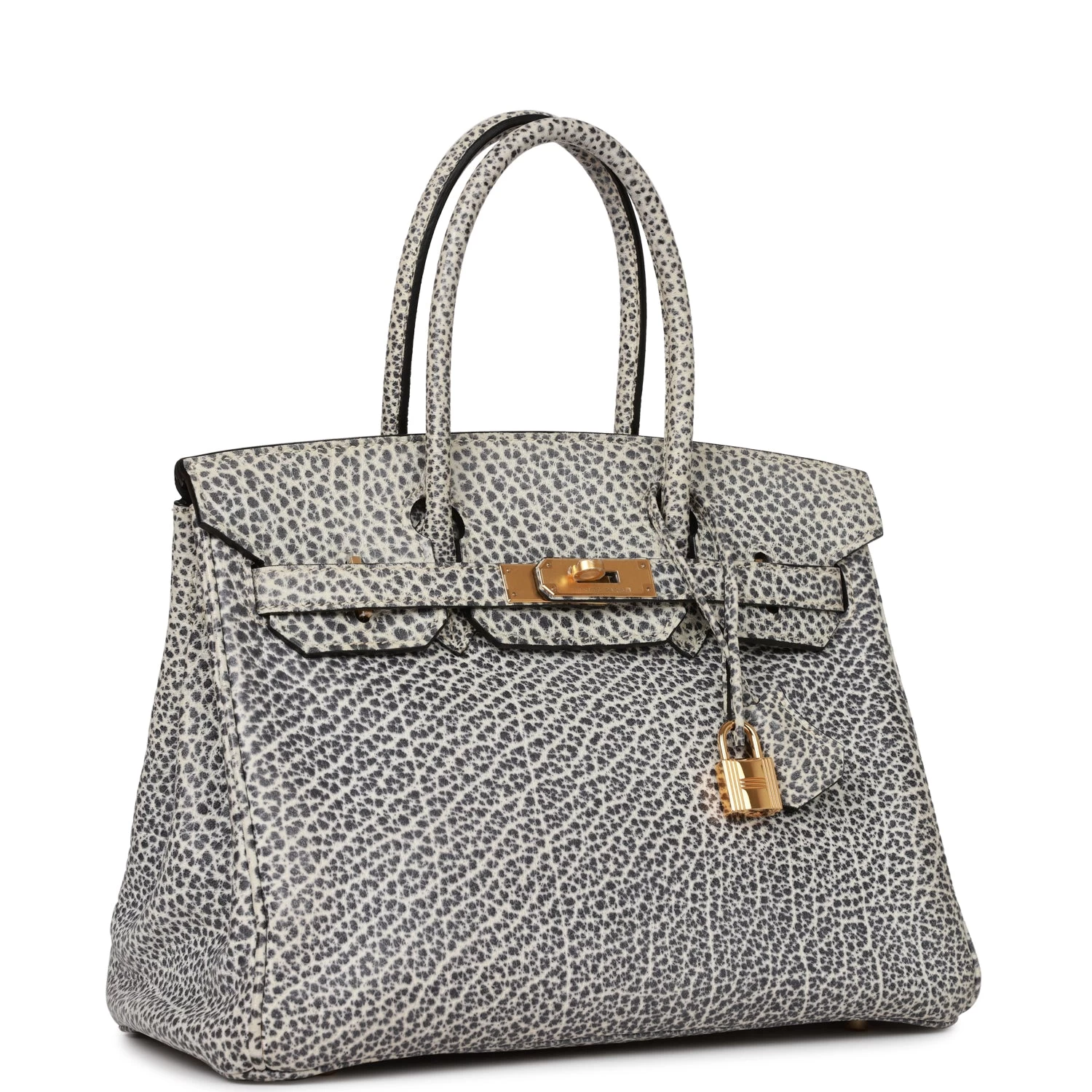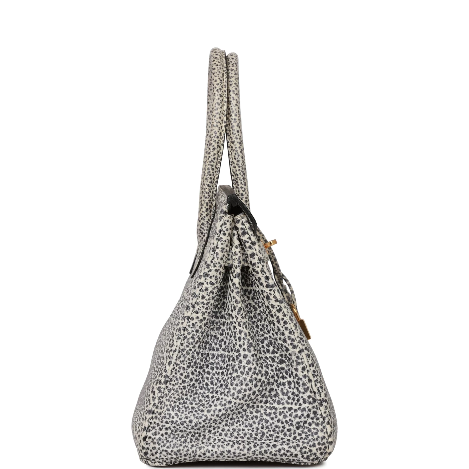 This rare Vintage Birkin is in White dalmatian buffalo leather with gold hardware and has tonal stitching, a front toggle closure, a clochette with lock and two keys, and double rolled handles.