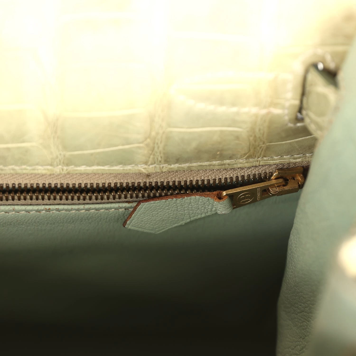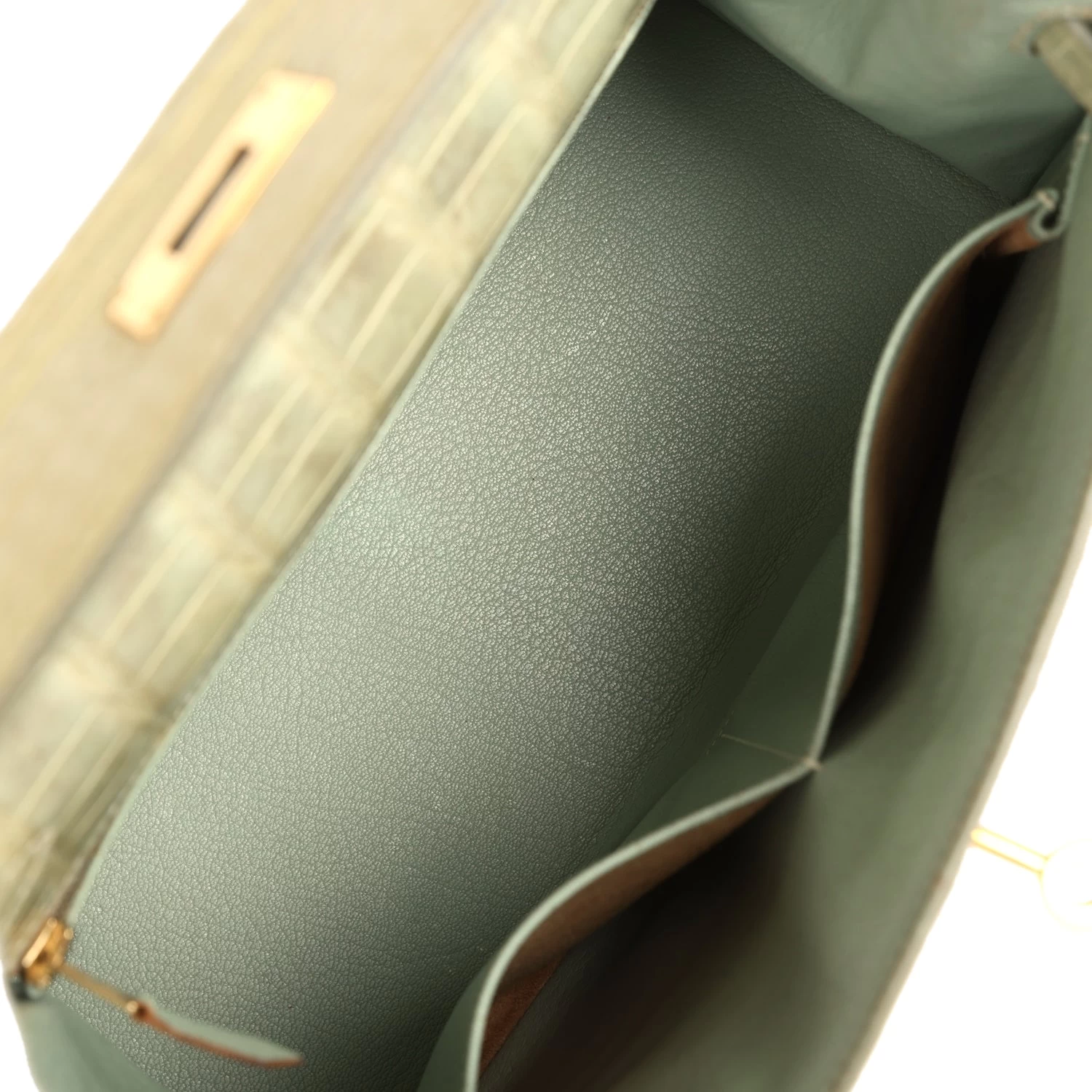 The interior is lined with Vert Celadon chevre and has a zip pocket with an Hermes engraved zipper pull and two open pockets on the opposite side.