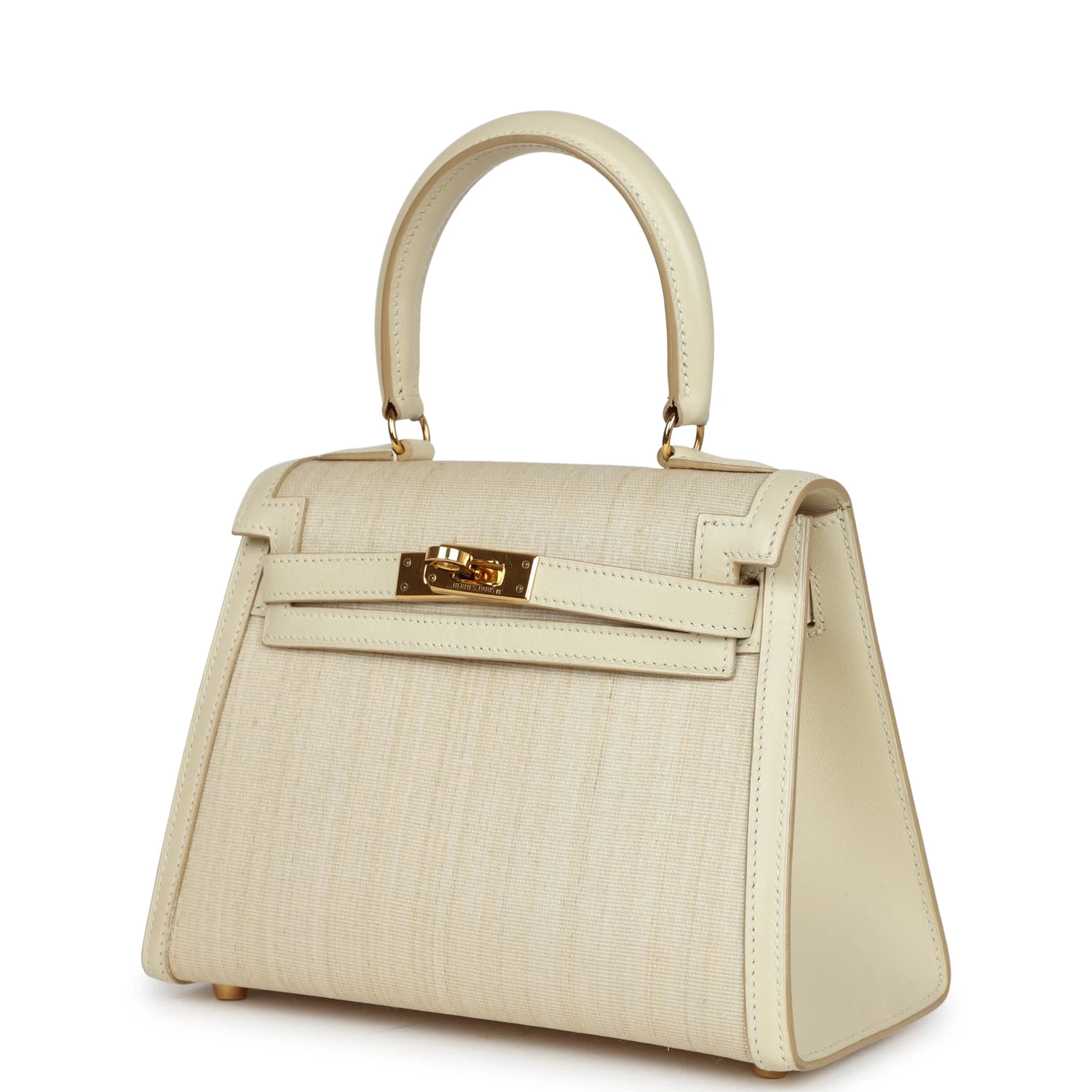 This Vintage Kelly Mini, in the Sellier style, is in Parchemin crinoline and box leather with gold hardware and has tonal stitching, two straps with front toggle closure, single rolled handle and removable shoulder strap.