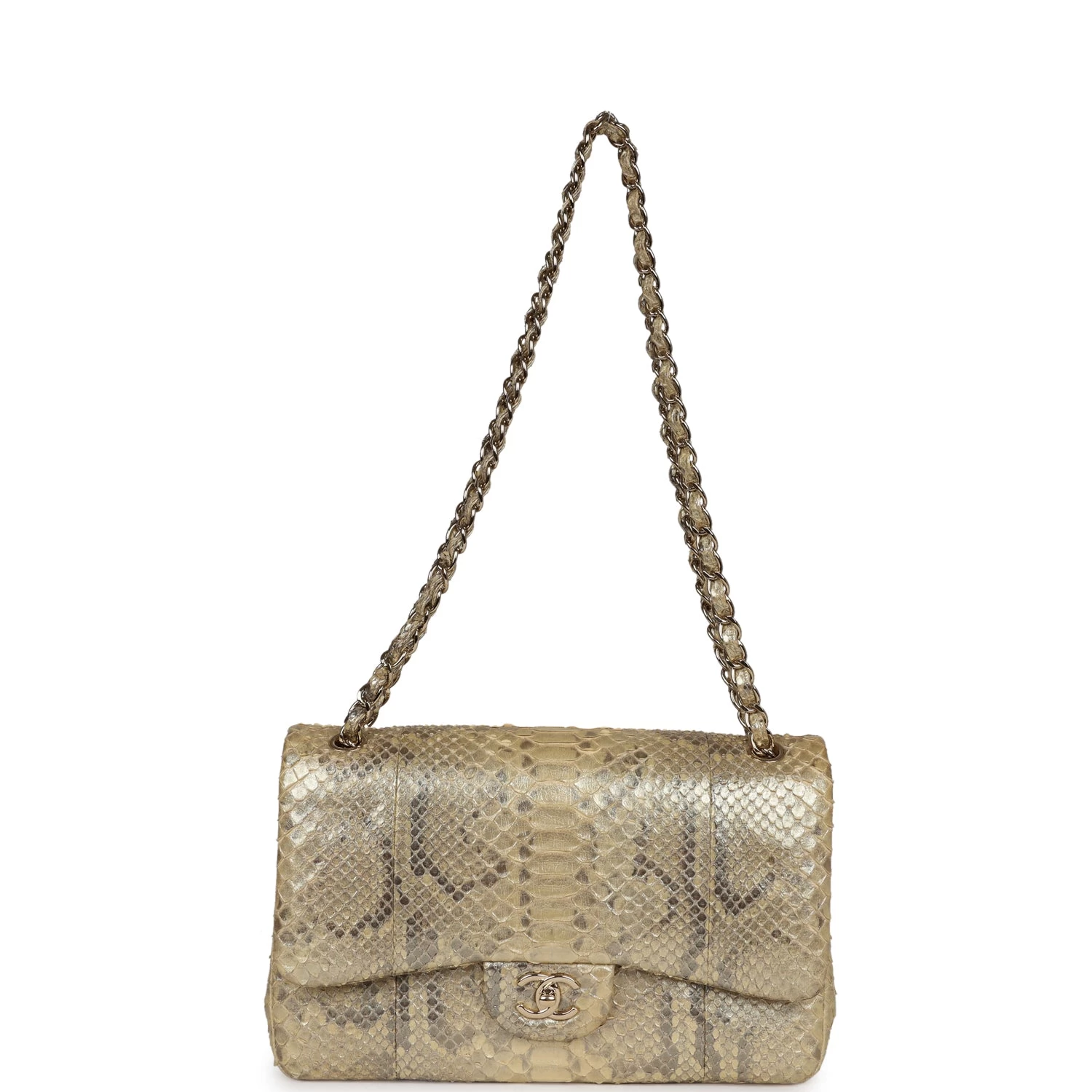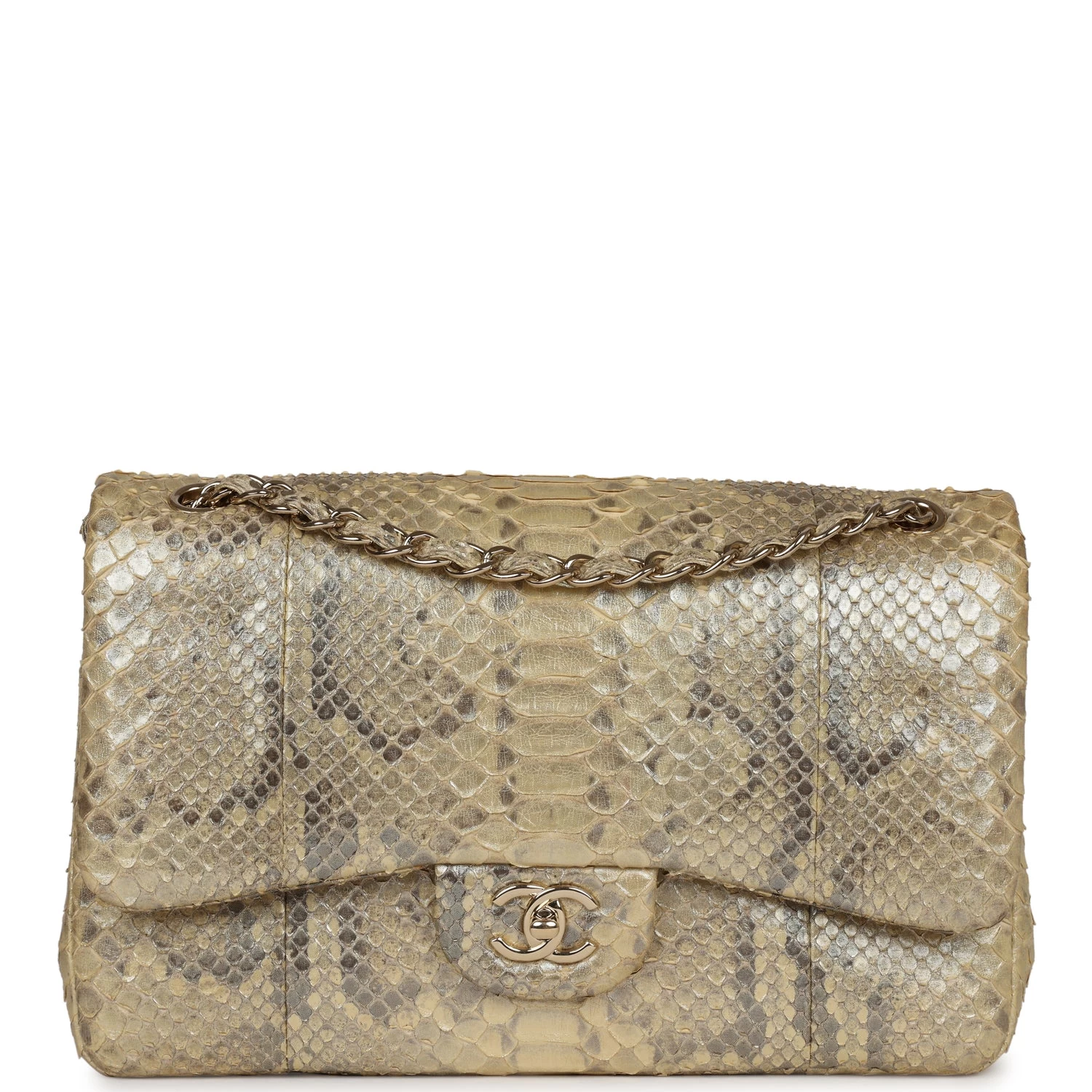 This Chanel Jumbo Classic Double Flap bag in Gold metallic python leather with gold tone hardware, front flap with CC turnlock closure, half moon back pocket and adjustable interwoven gold tone chain link and gold python leather shoulder/crossbody strap.