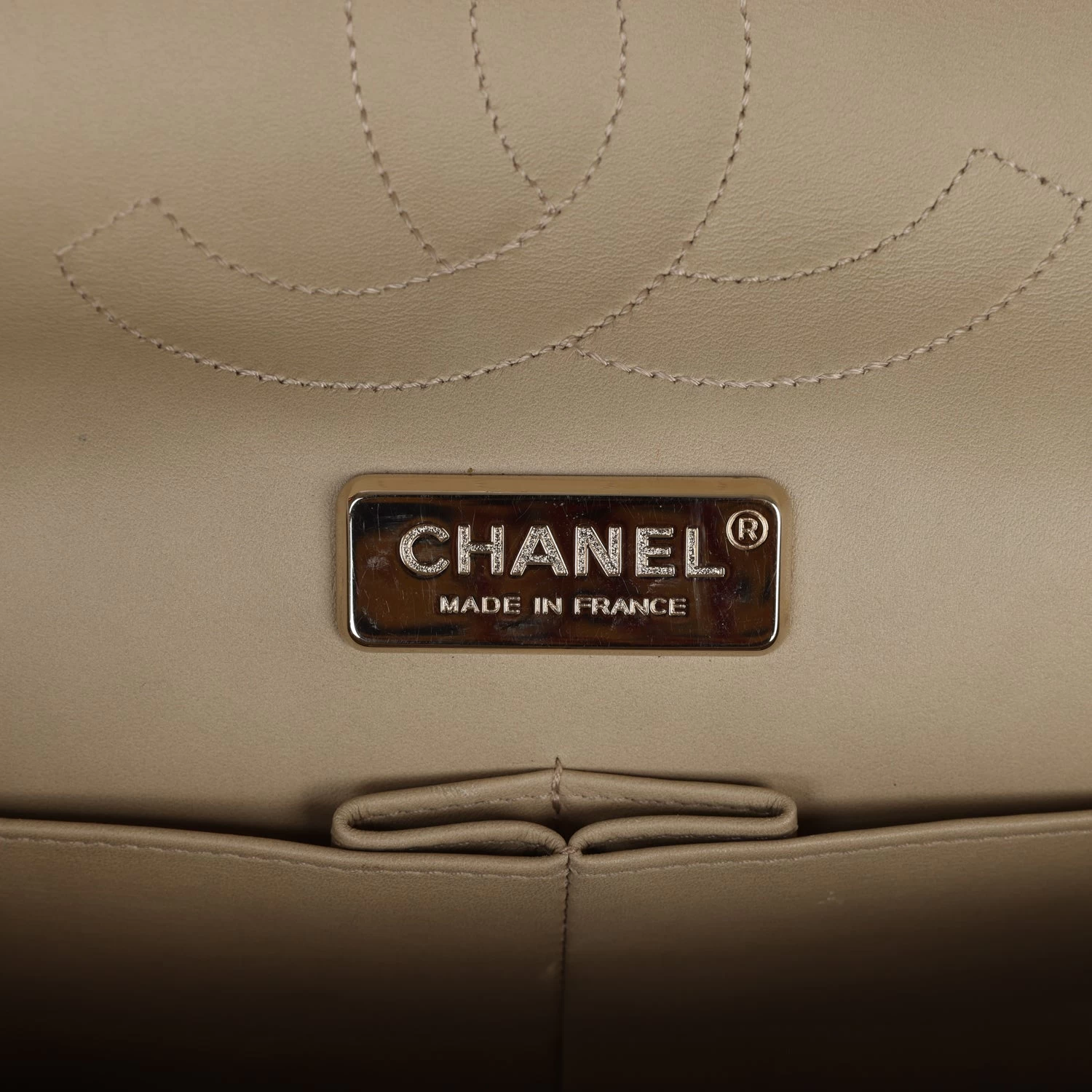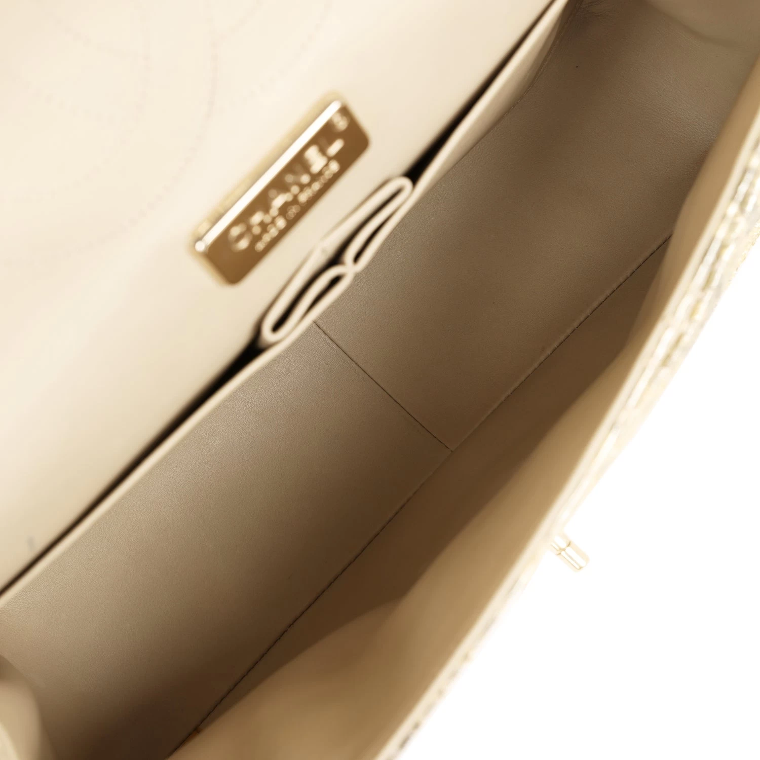 The interior is lined in beige leather with the “love letter” zipper compartment underneath the first flap, an “outer” slit pocket under the second flap, and an interior compartment with two open pockets separated by a “lipstick” compartment.